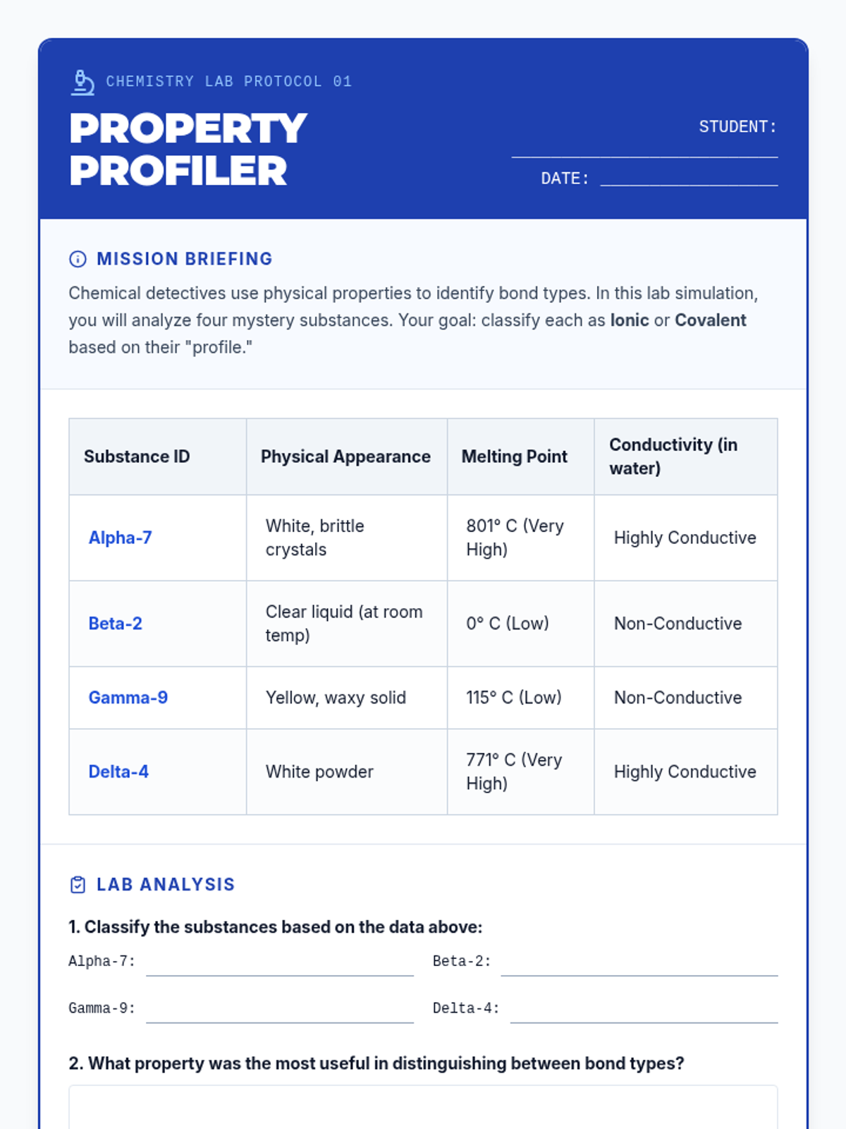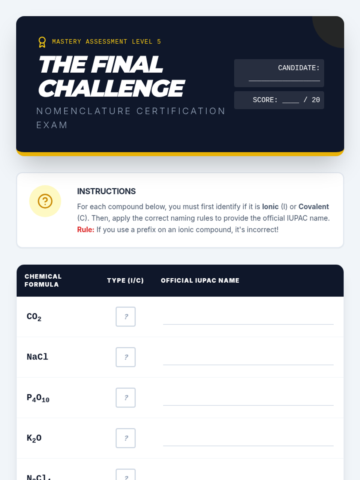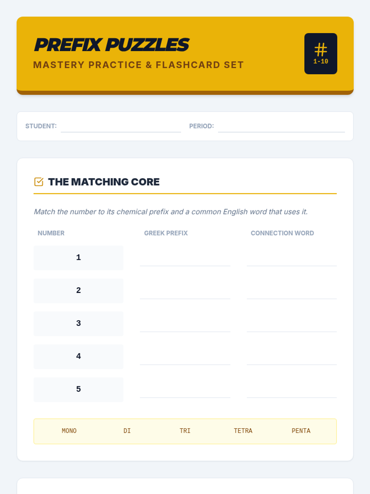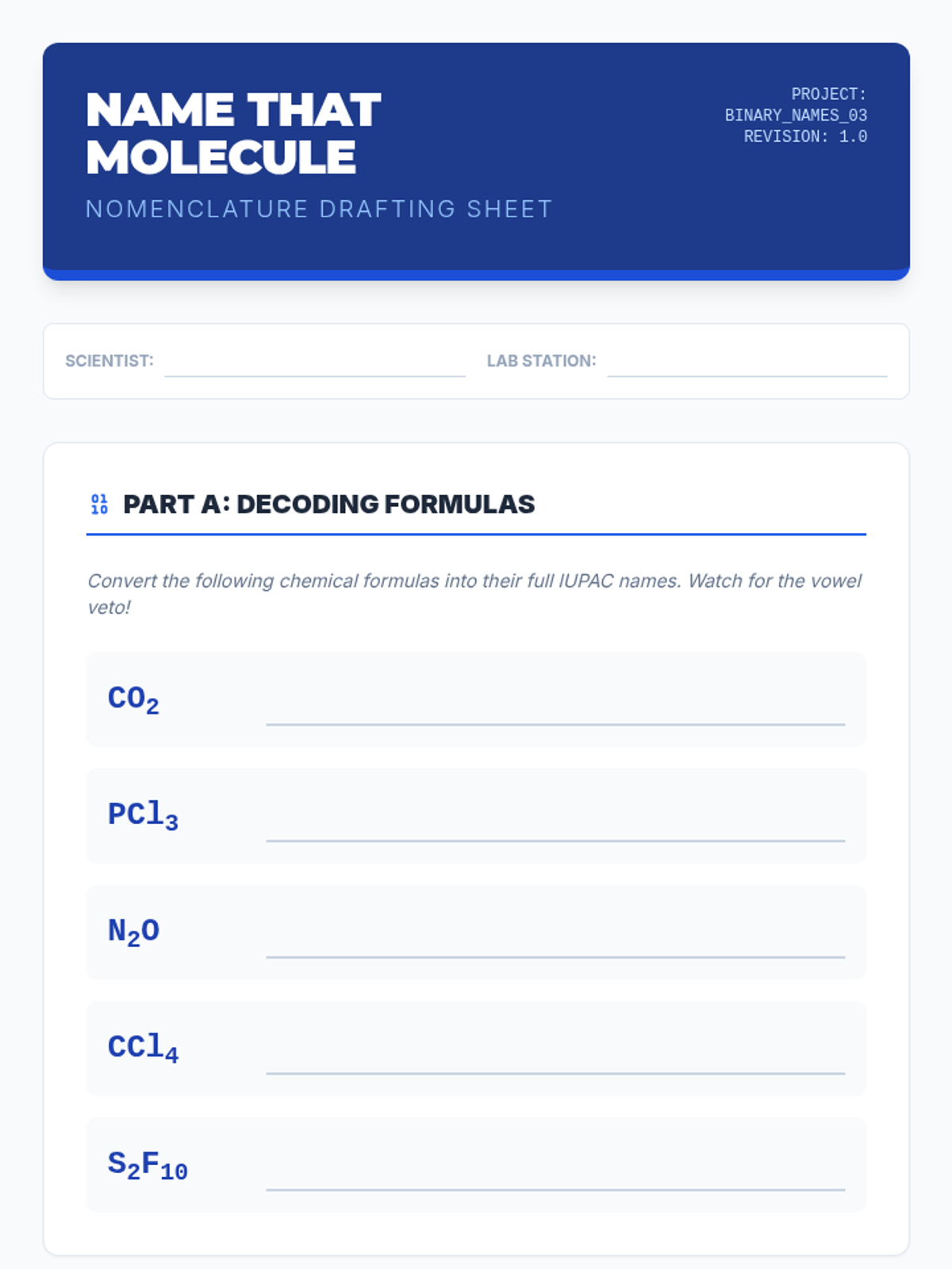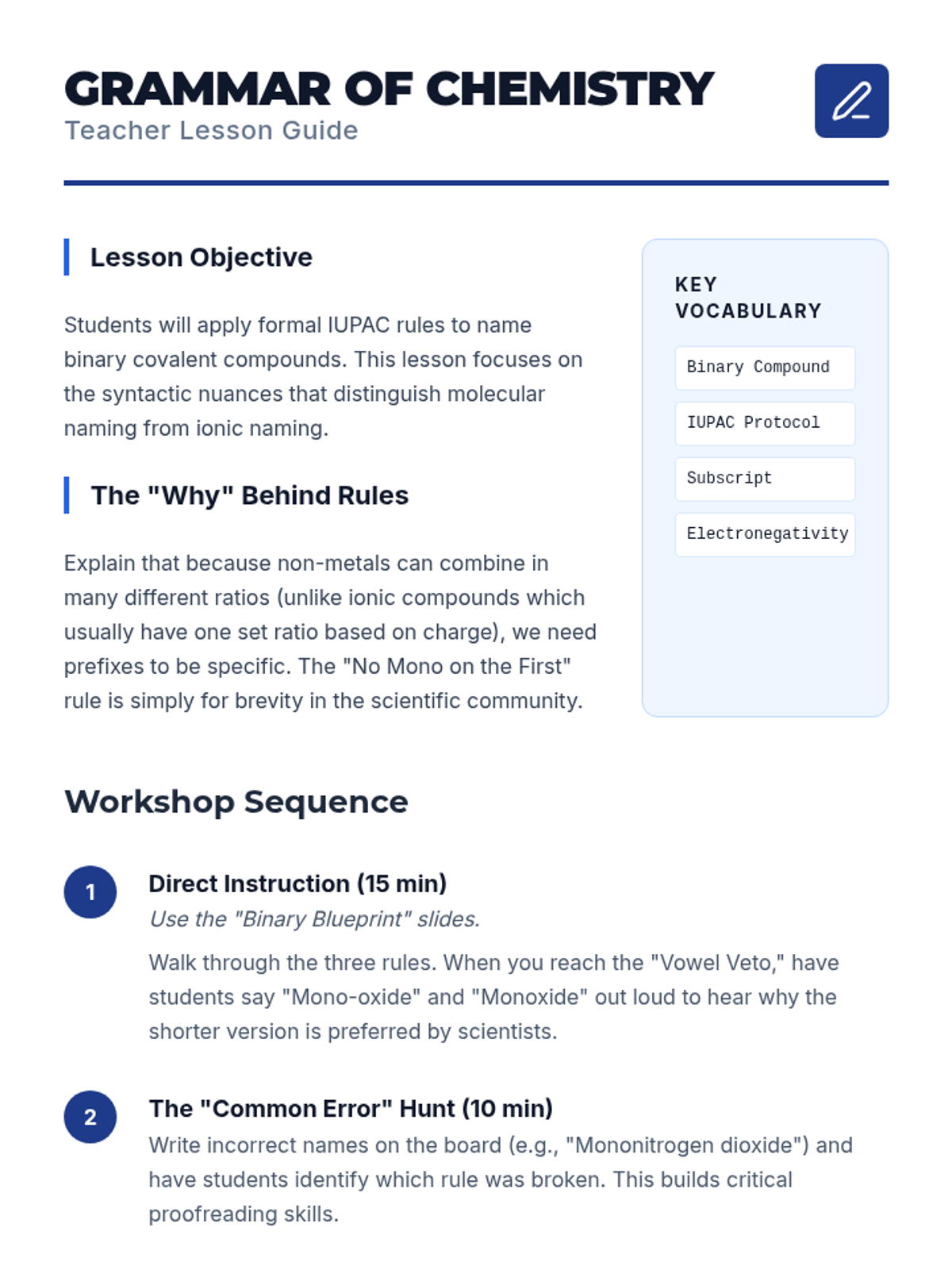 A comprehensive unit where 8th-grade students master the art of chemical nomenclature. By distinguishing between ionic and covalent bonds, students learn to apply the Greek prefix system to name molecular compounds accurately and confidently.