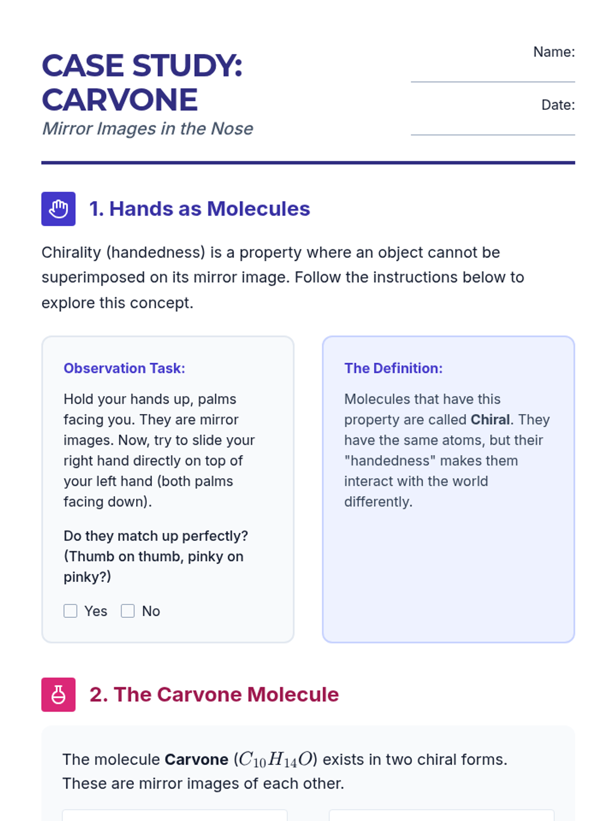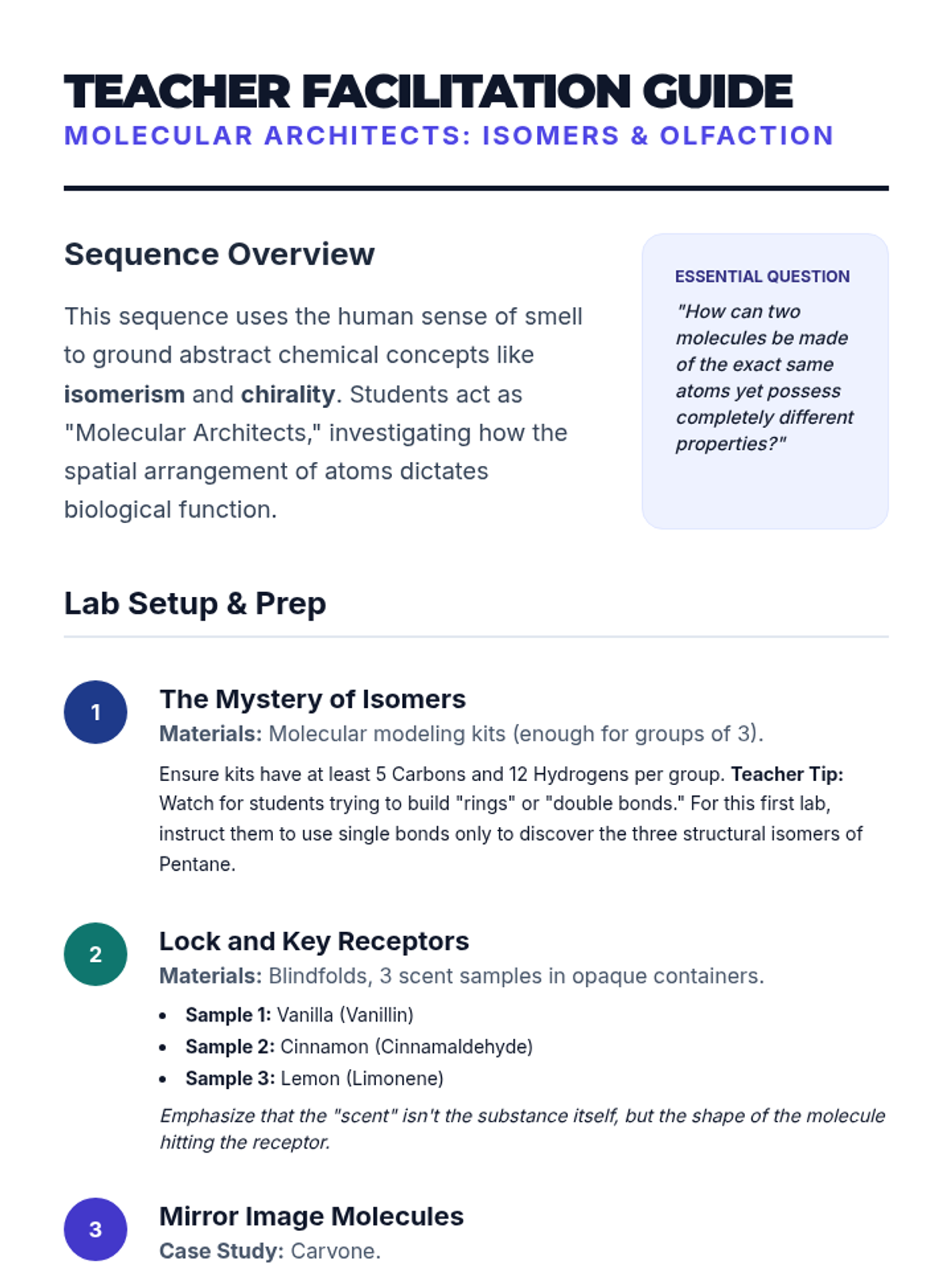 An 8th-grade chemistry sequence exploring isomers, chirality, and the relationship between molecular structure and biological function through the lens of scent. Students investigate how identical atomic formulas can result in different properties using a case-study approach.