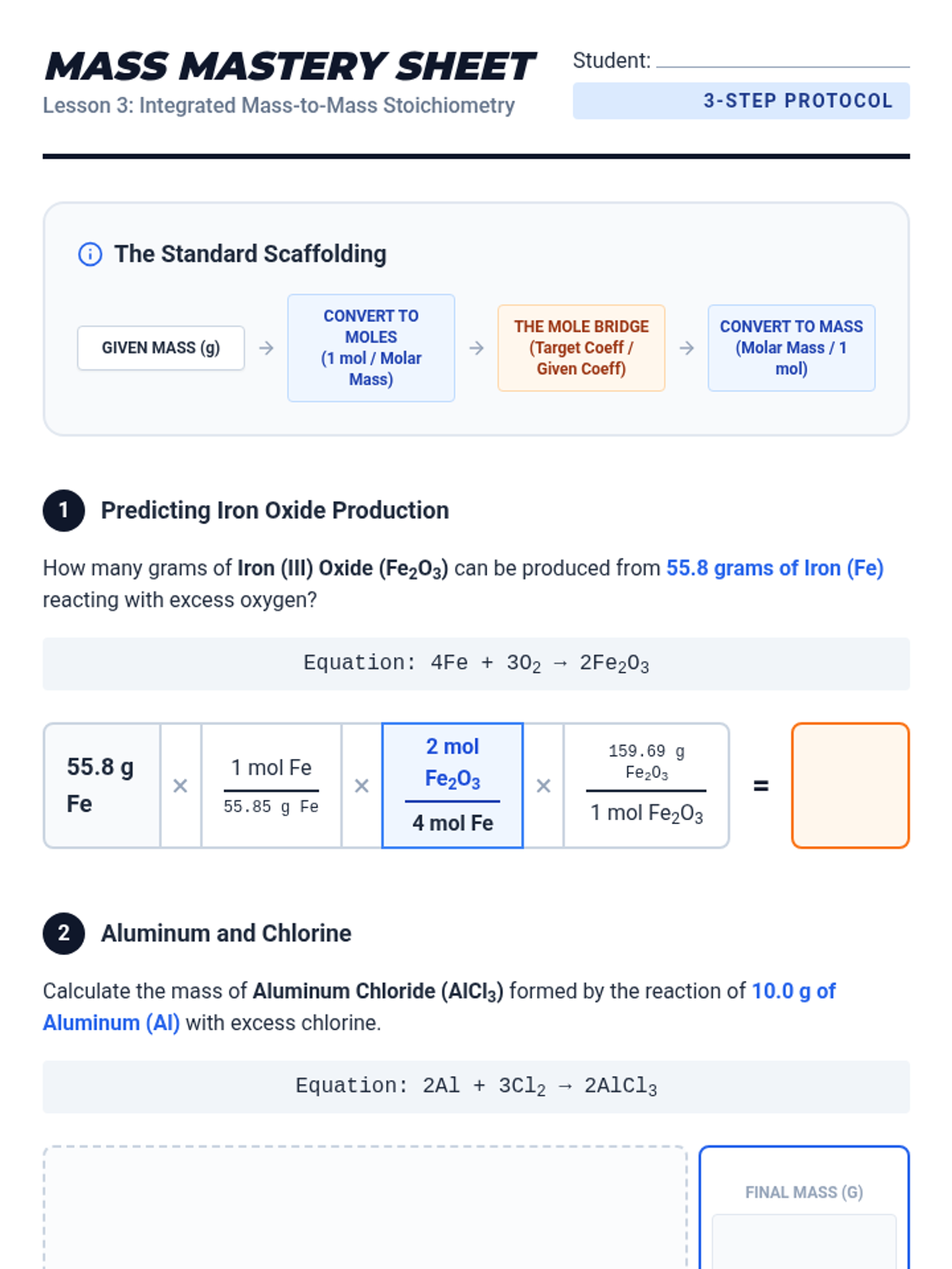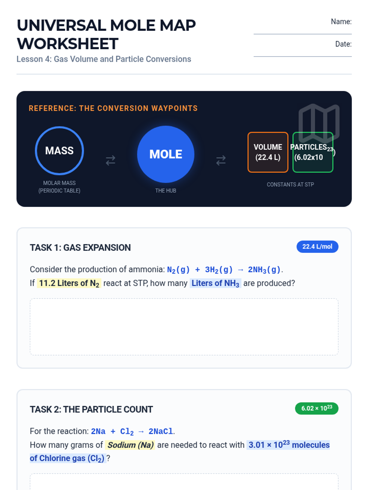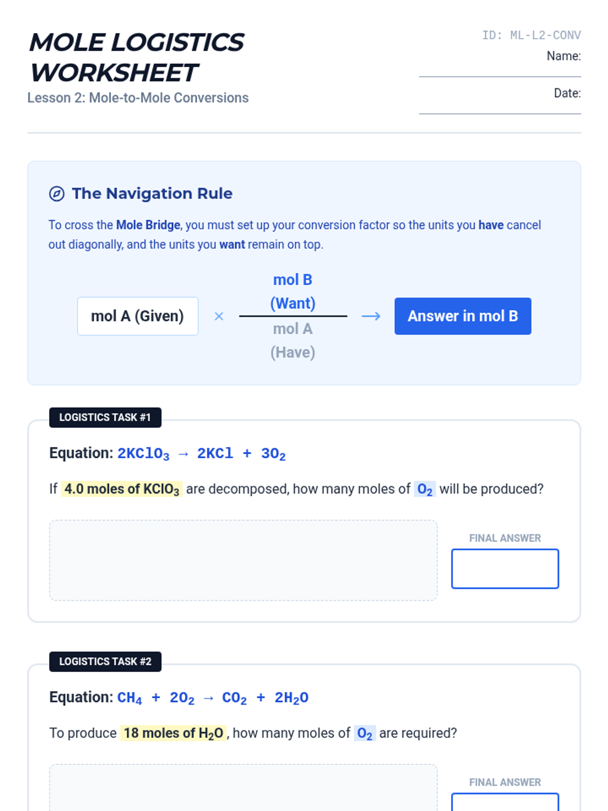 A foundational sequence for 10th-grade chemistry that guides students through the mathematical logic of stoichiometry. Students progress from balancing equations and writing mole ratios to performing complex mass, volume, and particle conversions using dimensional analysis.