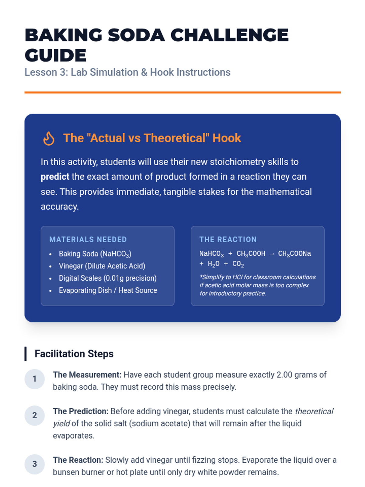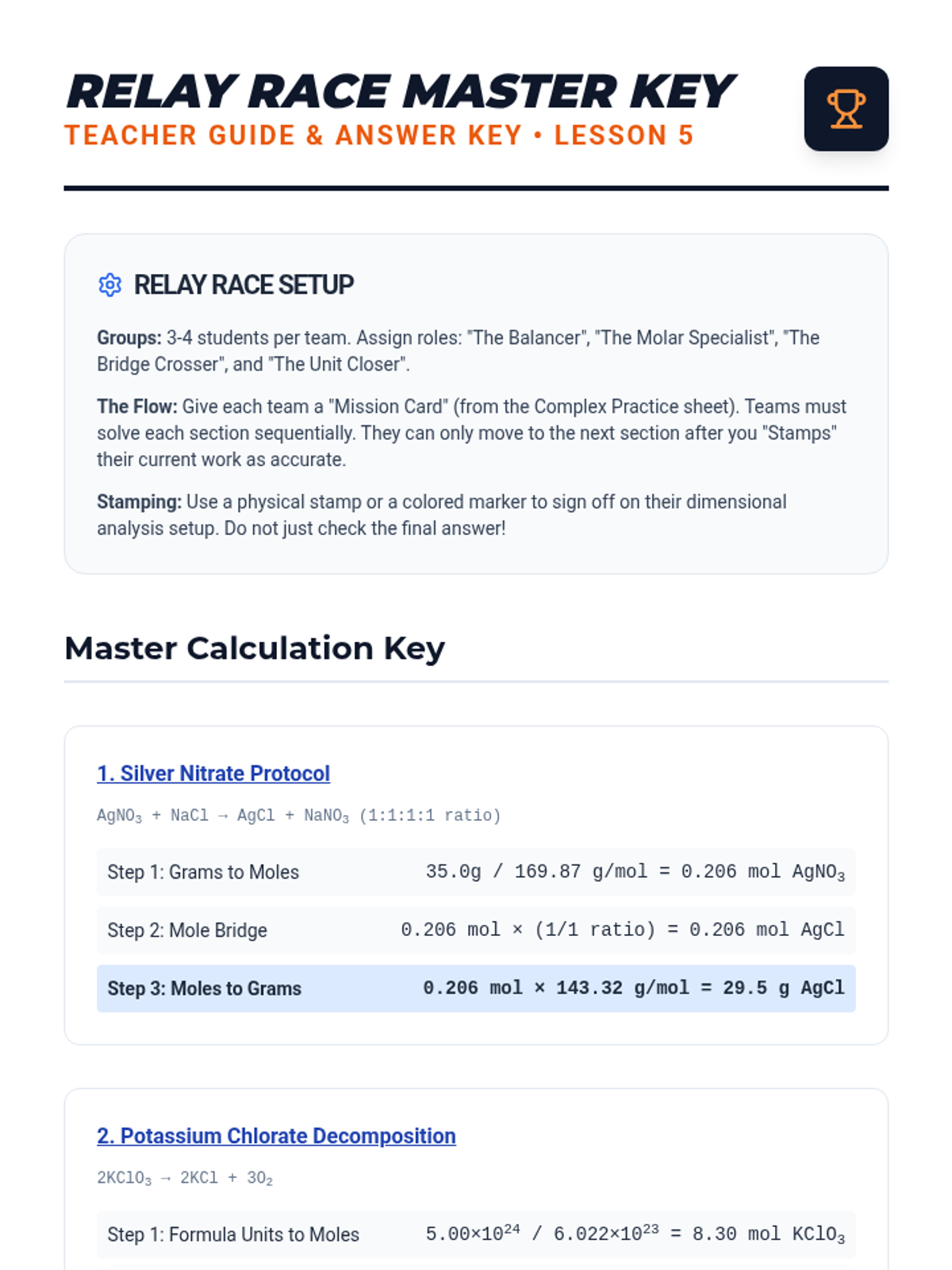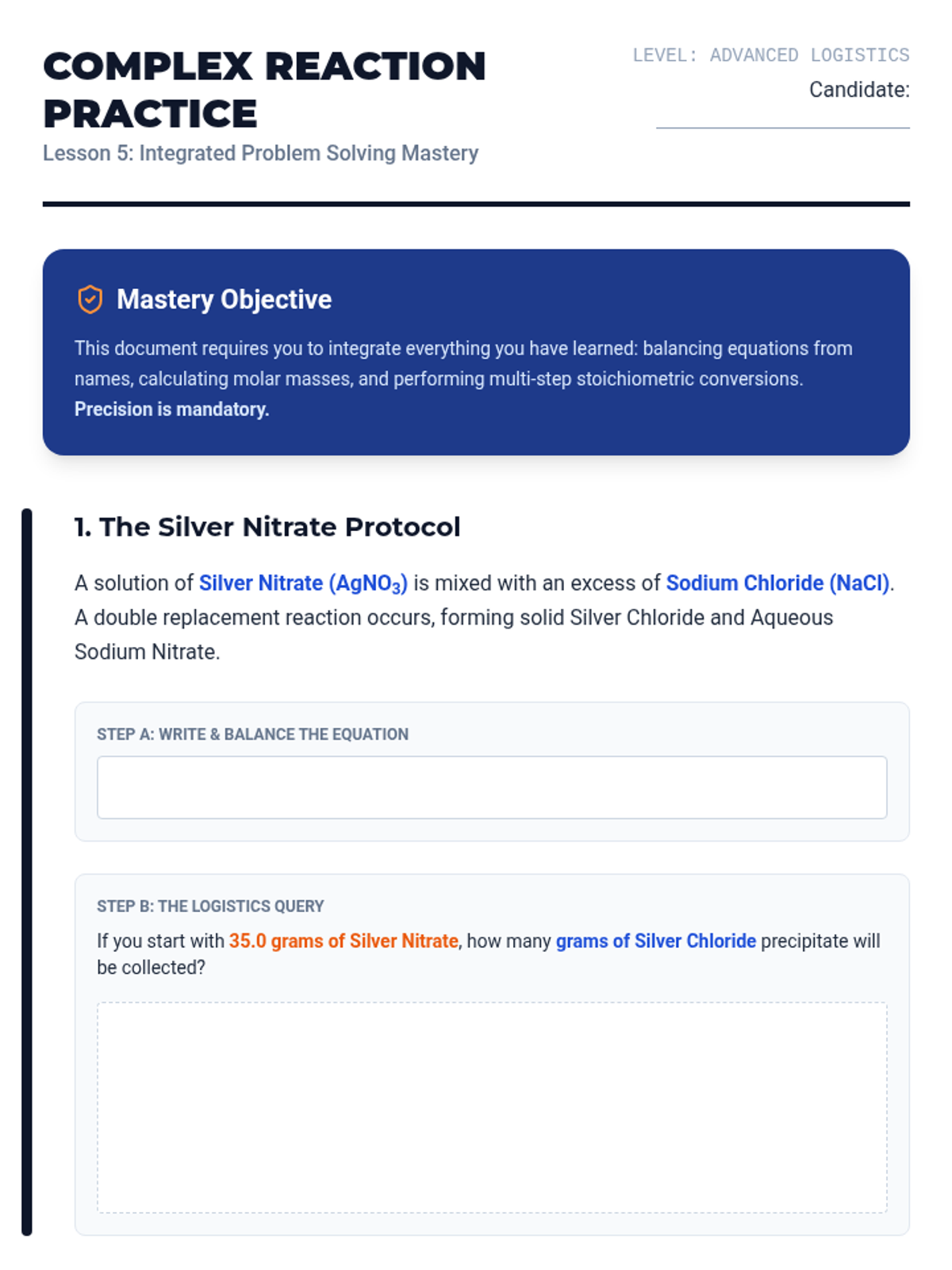 A foundational sequence for 10th-grade chemistry that guides students through the mathematical logic of stoichiometry. Students progress from balancing equations and writing mole ratios to performing complex mass, volume, and particle conversions using dimensional analysis.