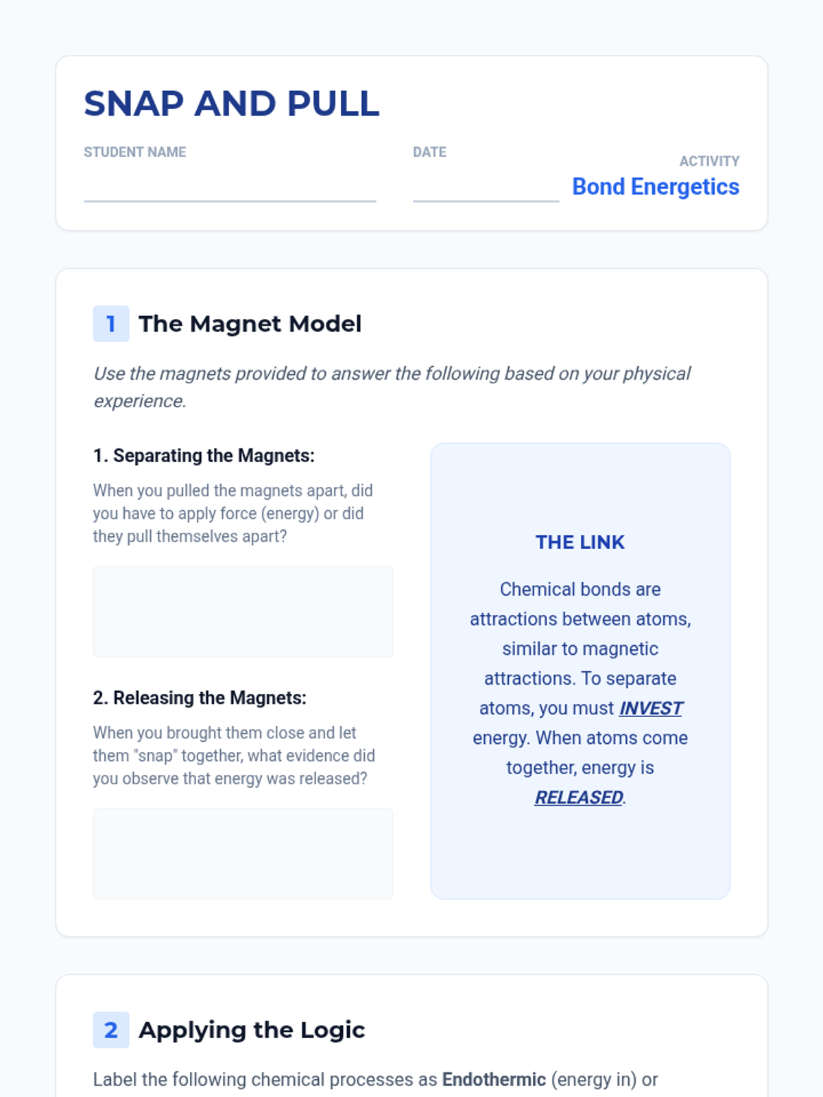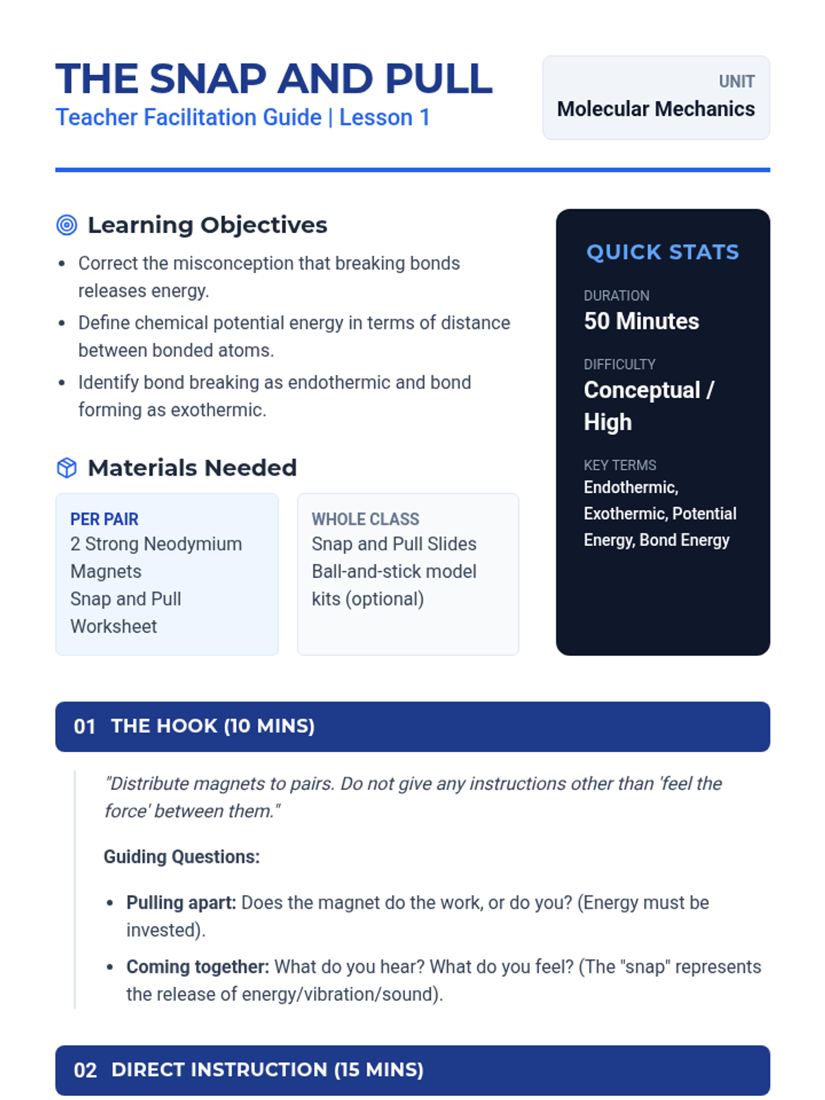 A 9th-grade chemistry unit exploring chemical energy changes through the lens of bond breaking and forming. Students transition from conceptual magnetic models to mathematical calculations of reaction enthalpy using bond energy data.