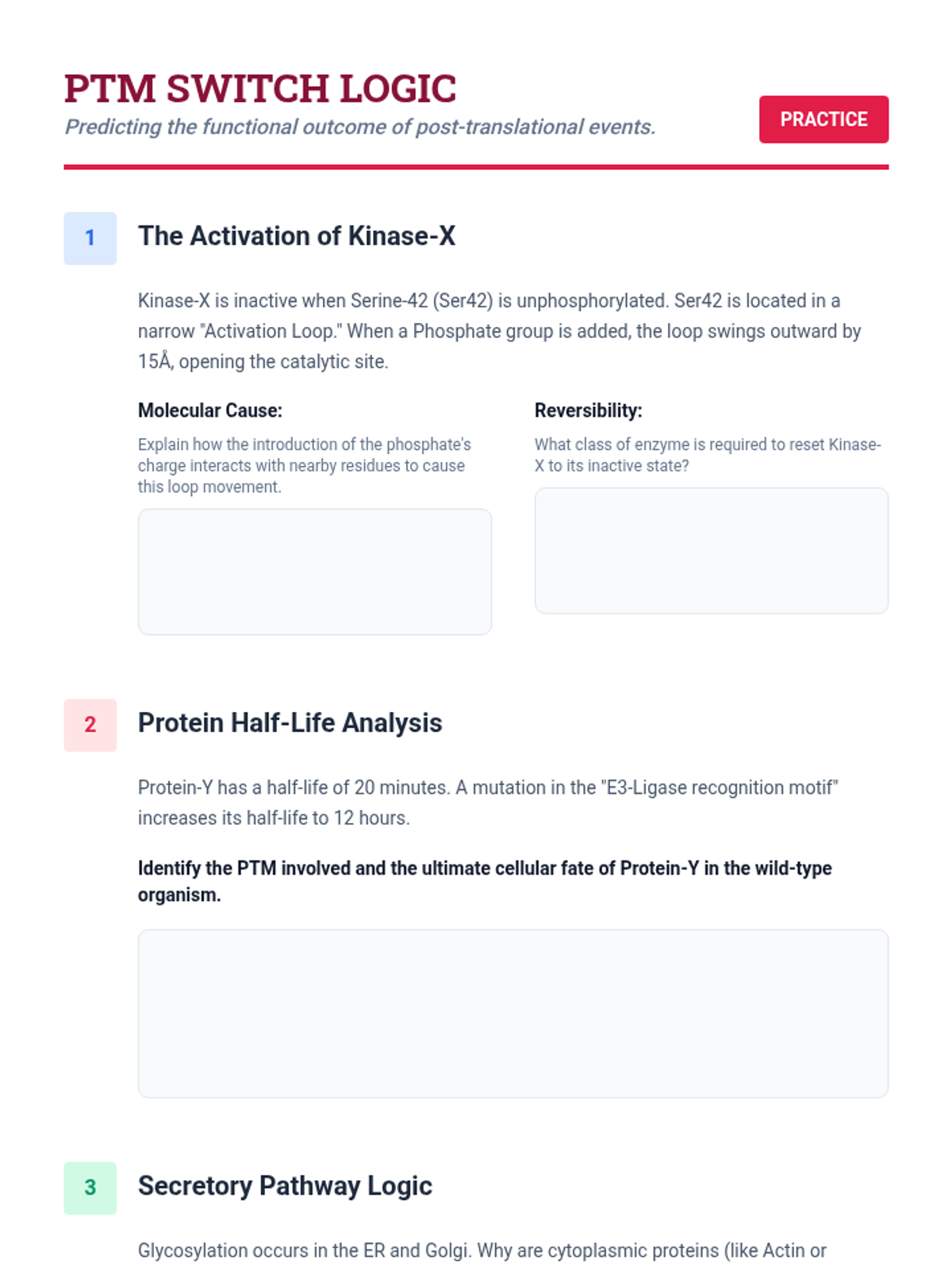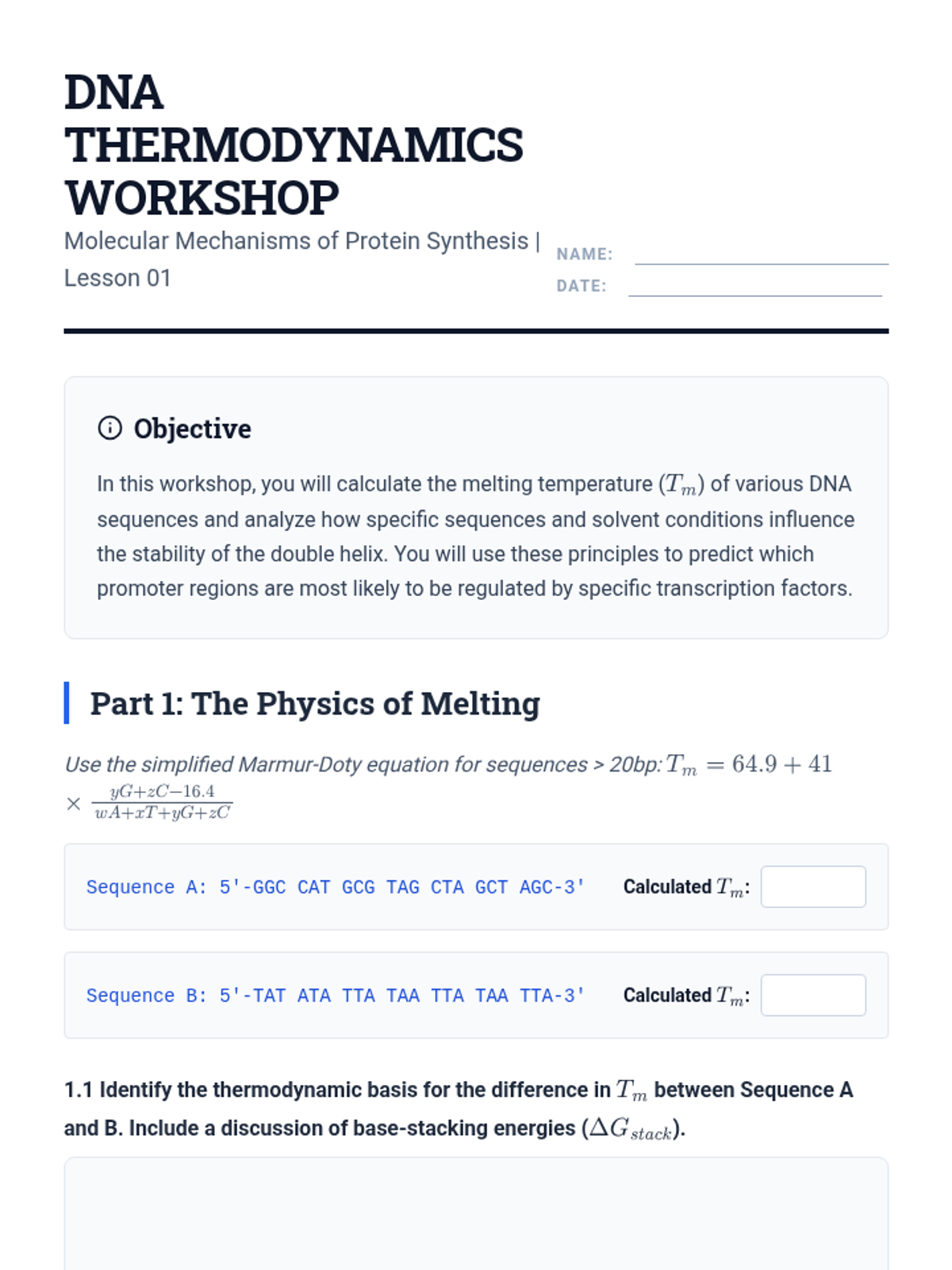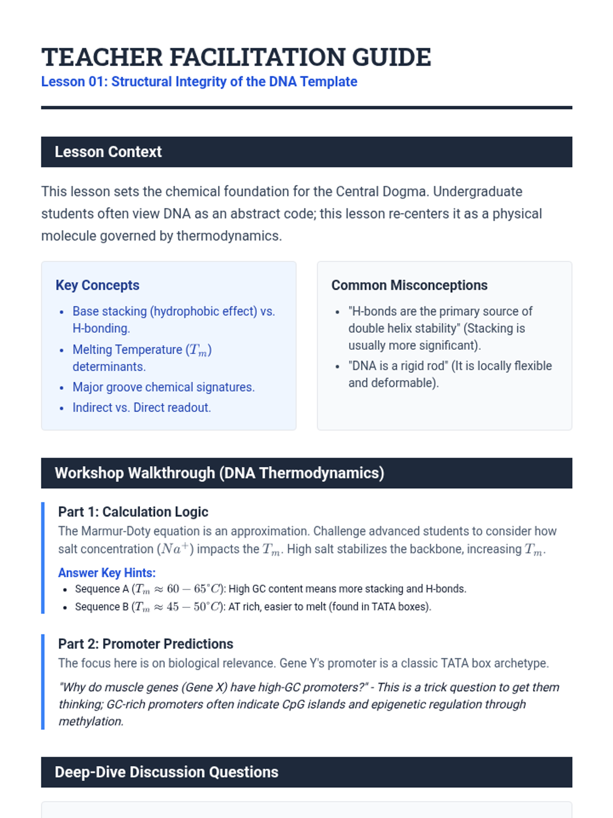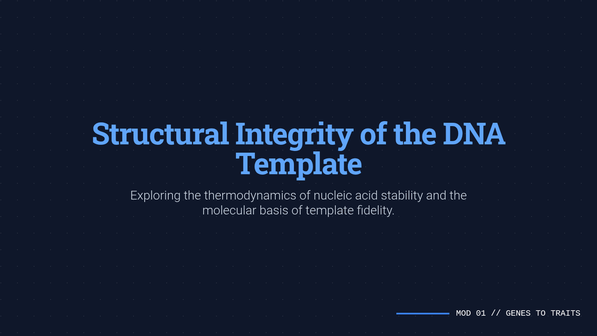 This sequence explores the biochemical mechanisms of the Central Dogma, from DNA structural stability to post-translational modifications. Designed for undergraduate students, it focuses on the thermodynamics, kinetics, and structural biology that ensure high-fidelity protein synthesis.