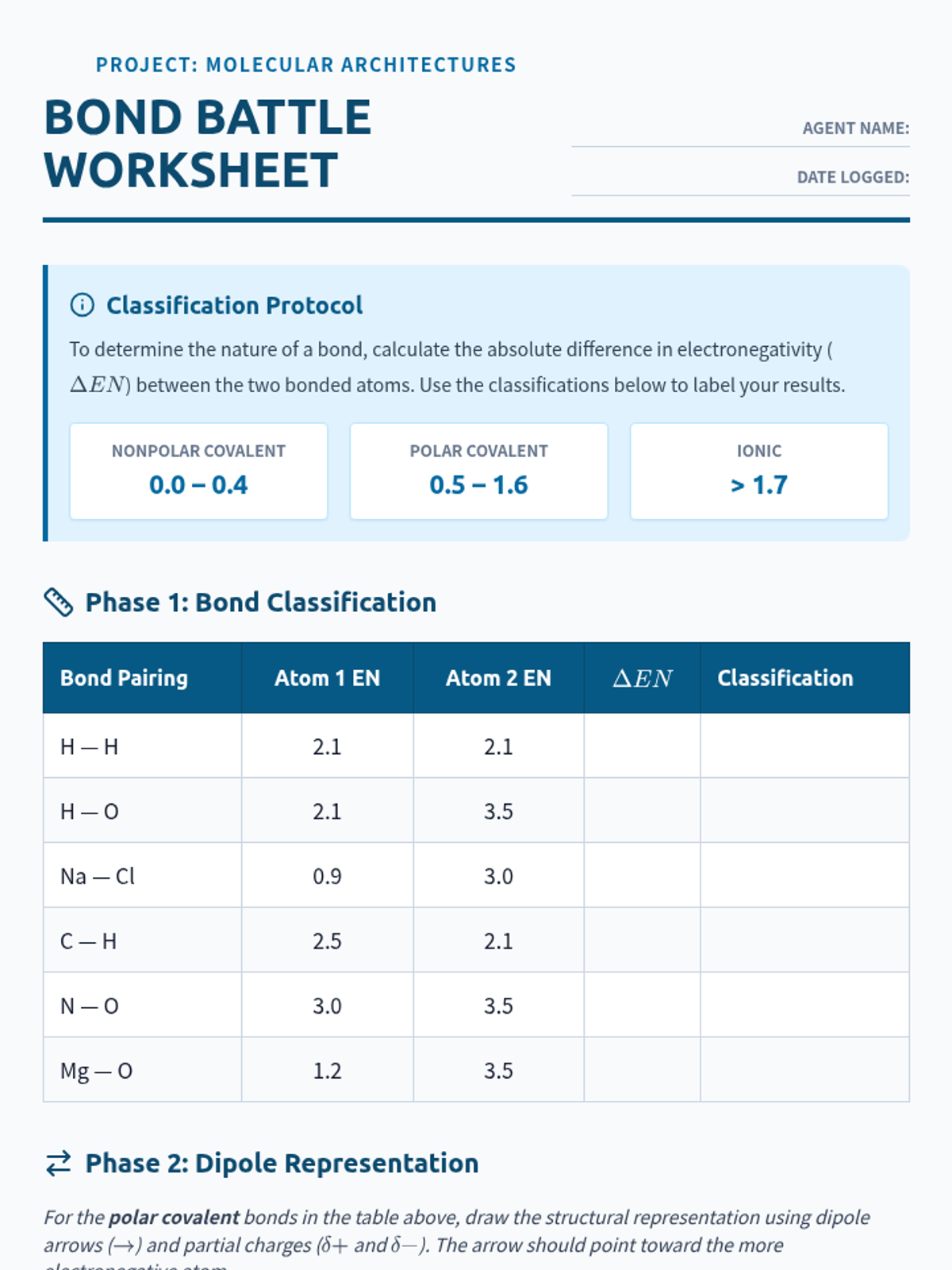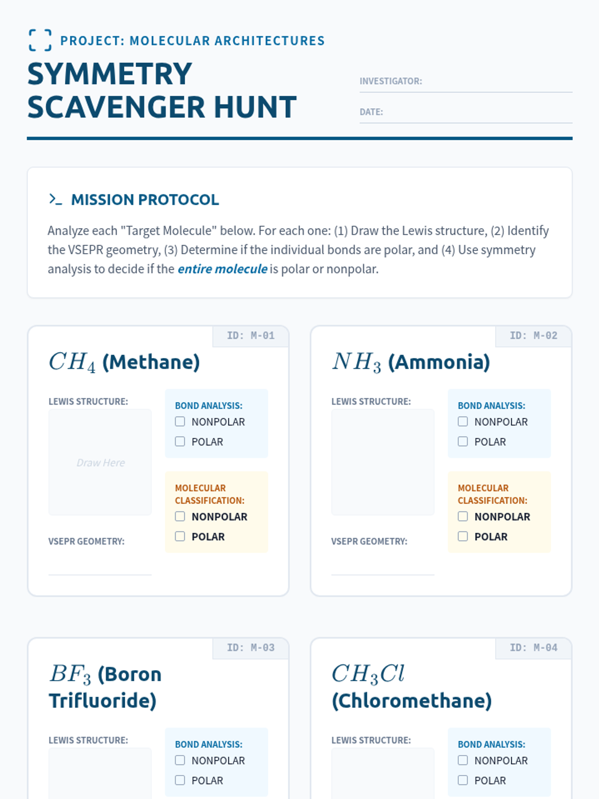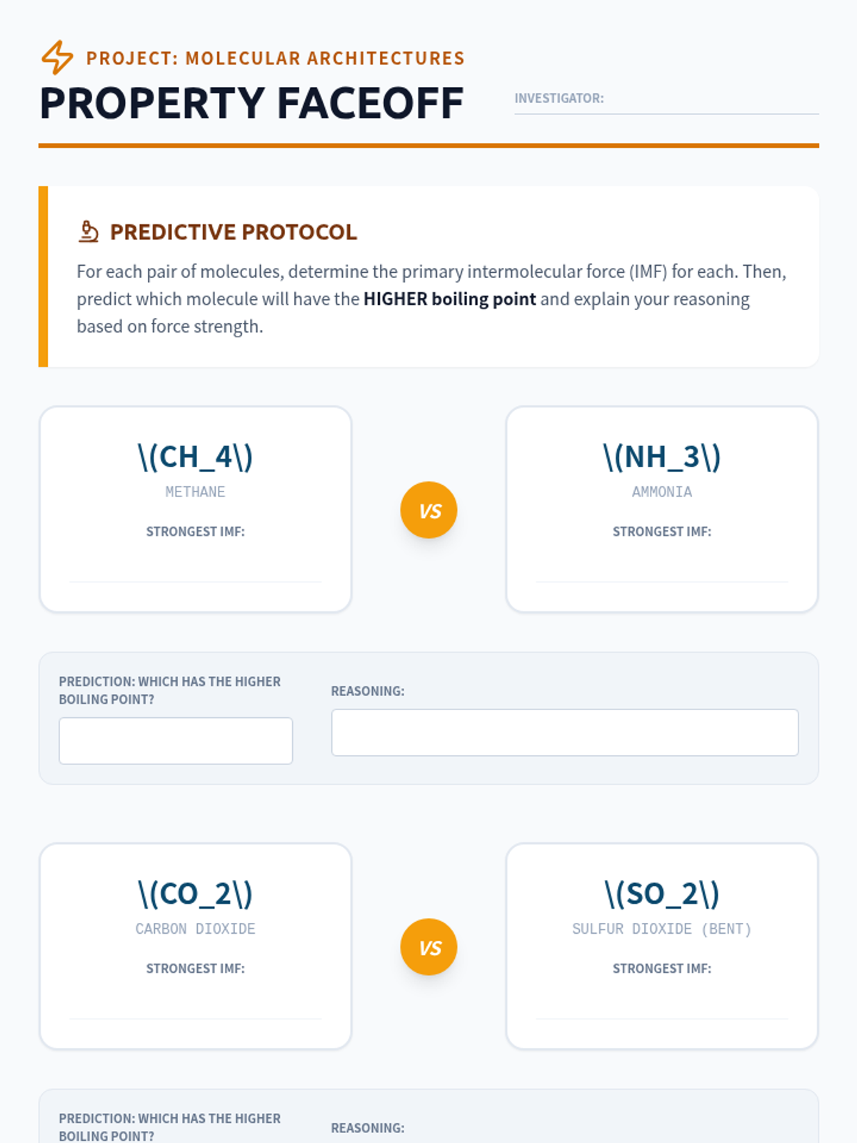 This chemistry sequence explores the relationship between molecular structure and macroscopic physical properties. Students investigate electronegativity, bond and molecular polarity, and intermolecular forces to predict behaviors like solubility and boiling points.