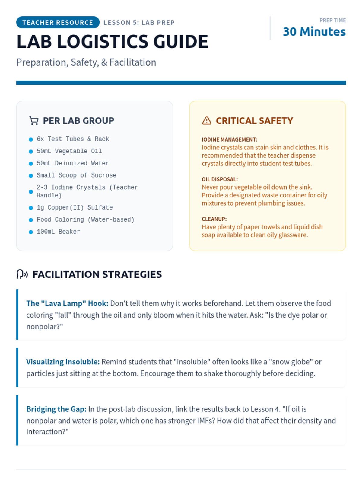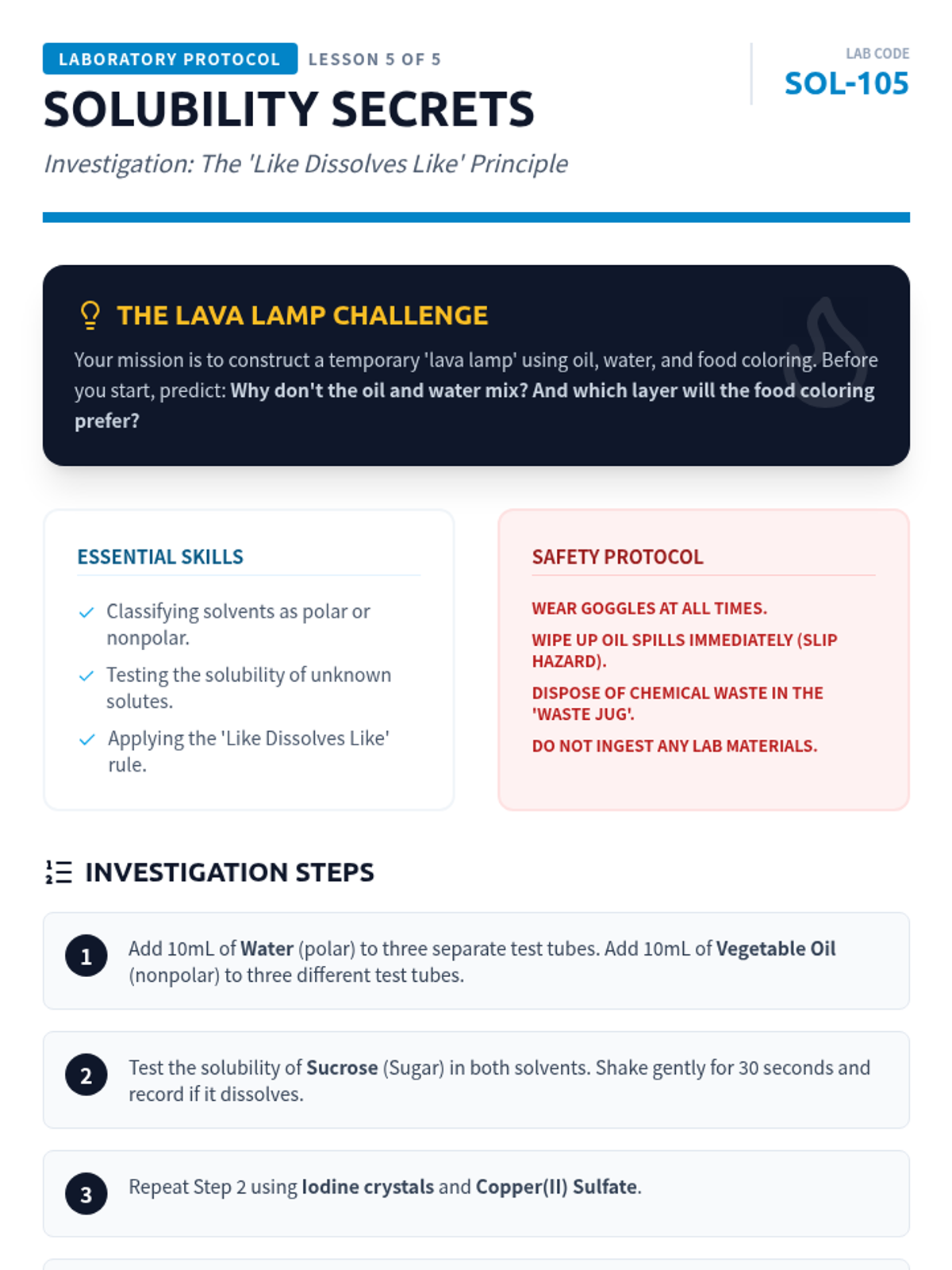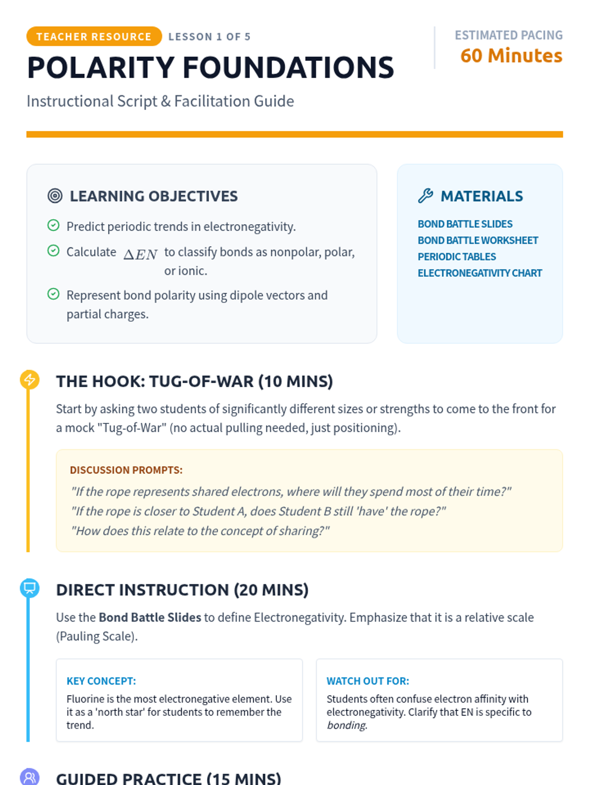 This chemistry sequence explores the relationship between molecular structure and macroscopic physical properties. Students investigate electronegativity, bond and molecular polarity, and intermolecular forces to predict behaviors like solubility and boiling points.