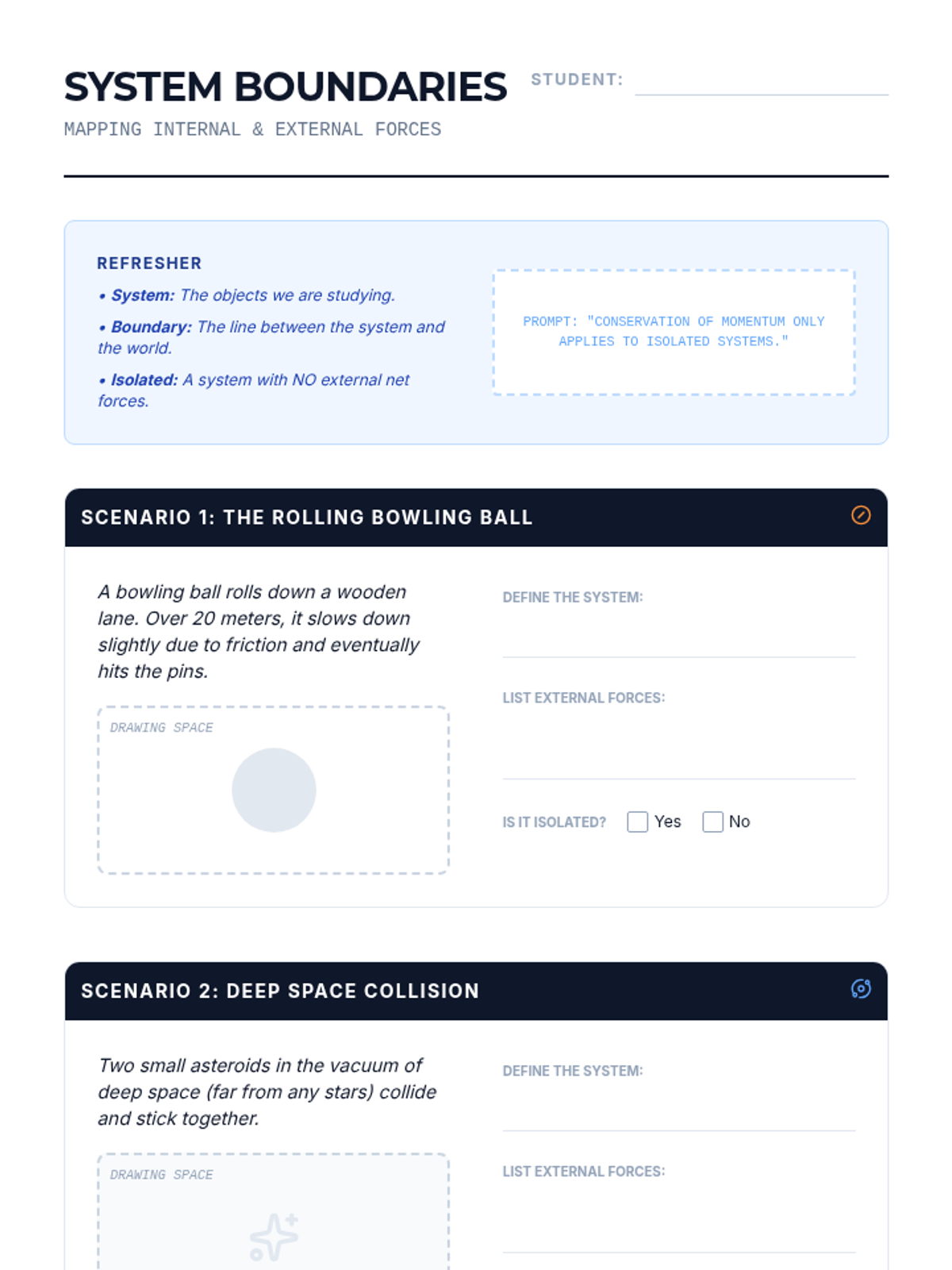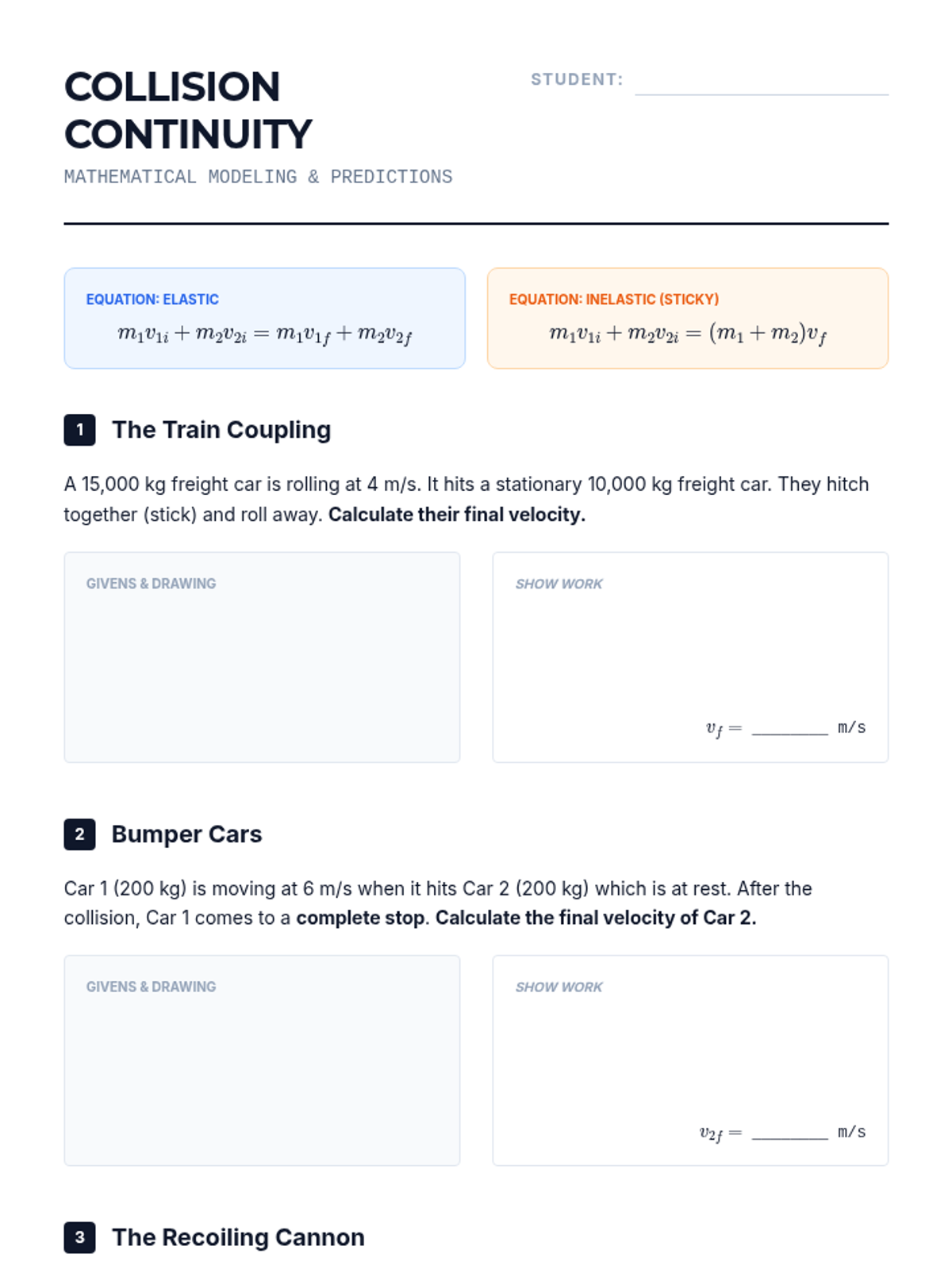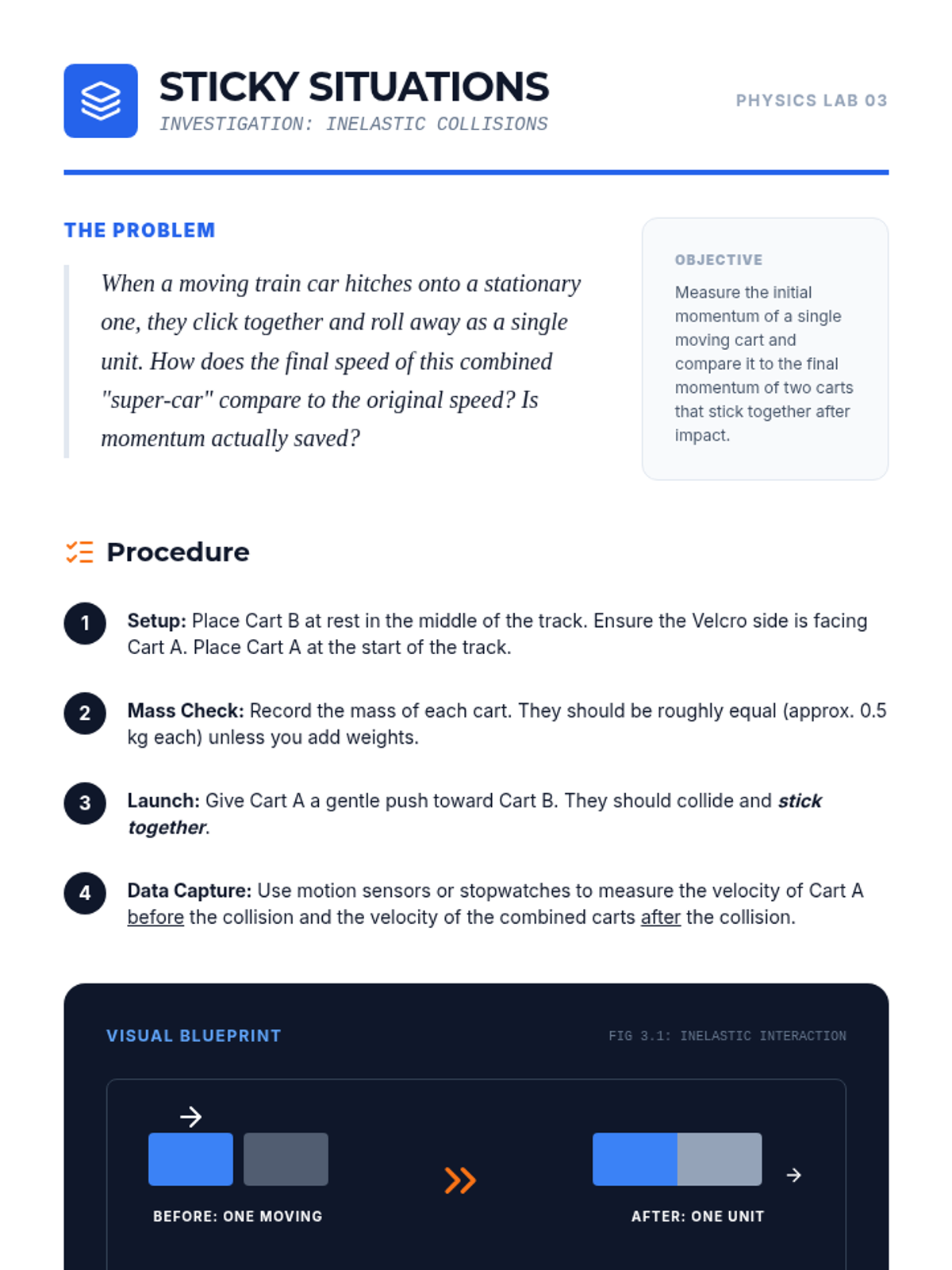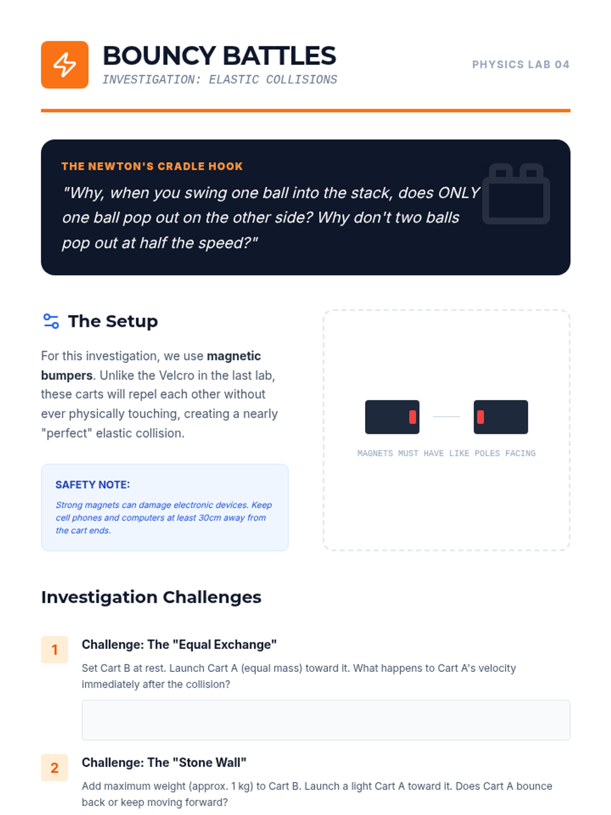 An inquiry-driven physics sequence for 9th graders to discover the Law of Conservation of Momentum through hands-on experimentation with carts, collisions, and recoil. Students move from conceptual understanding of 'systems' to mathematical modeling of elastic and inelastic interactions.