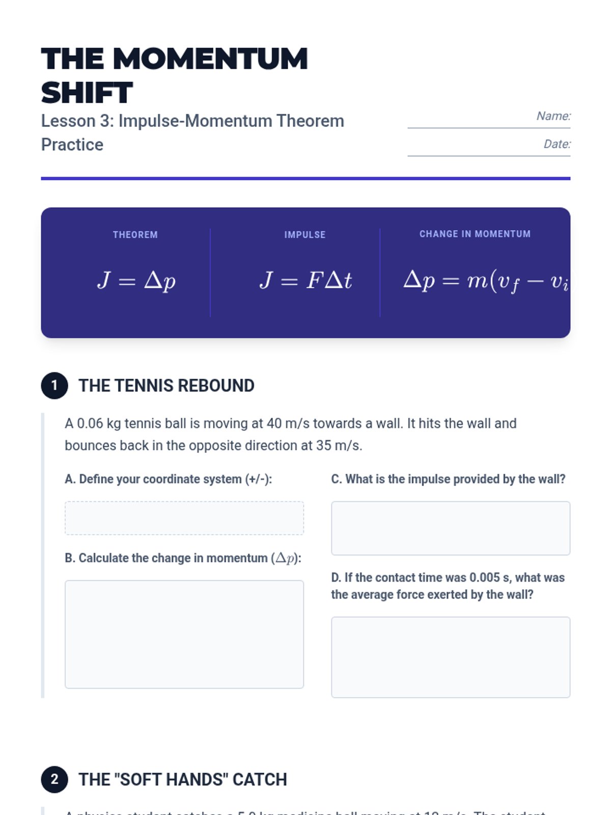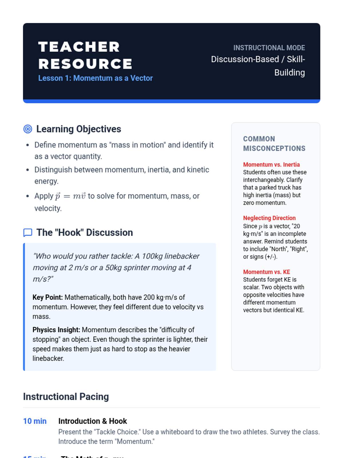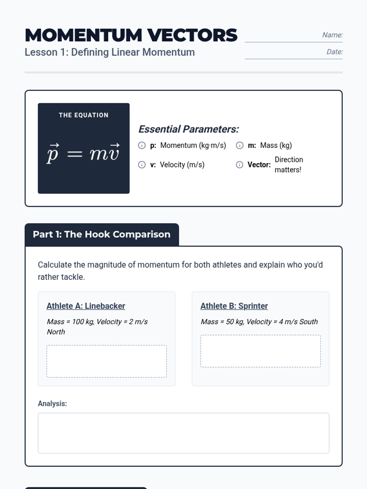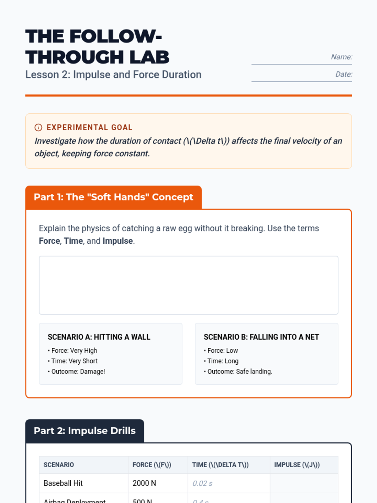 This sequence establishes the foundational mathematical and conceptual understanding of linear momentum and impulse. Students explore momentum as a vector quantity, the relationship between force and time (impulse), the Impulse-Momentum Theorem, and graphical analysis of force-time curves to predict motion changes.
