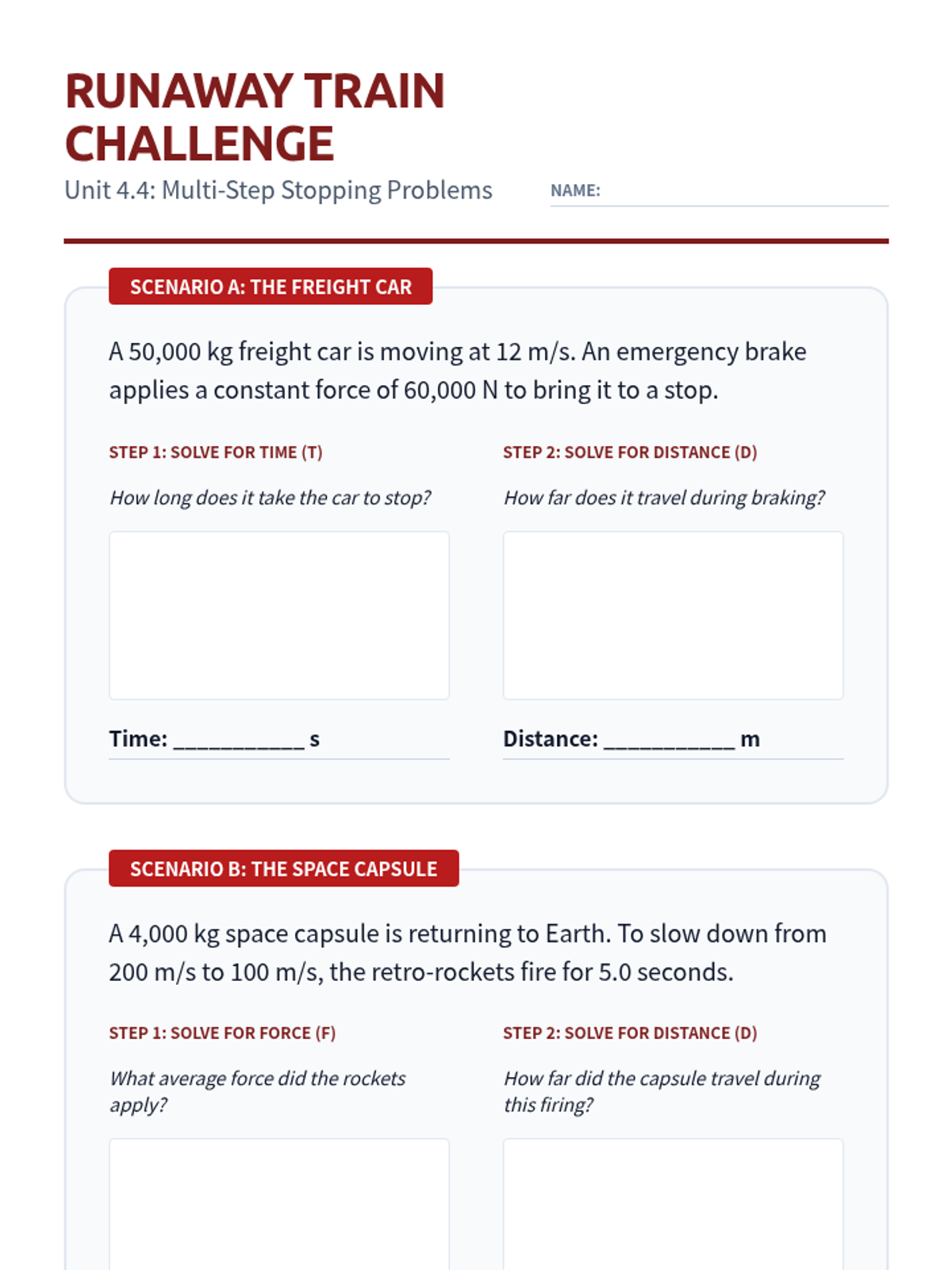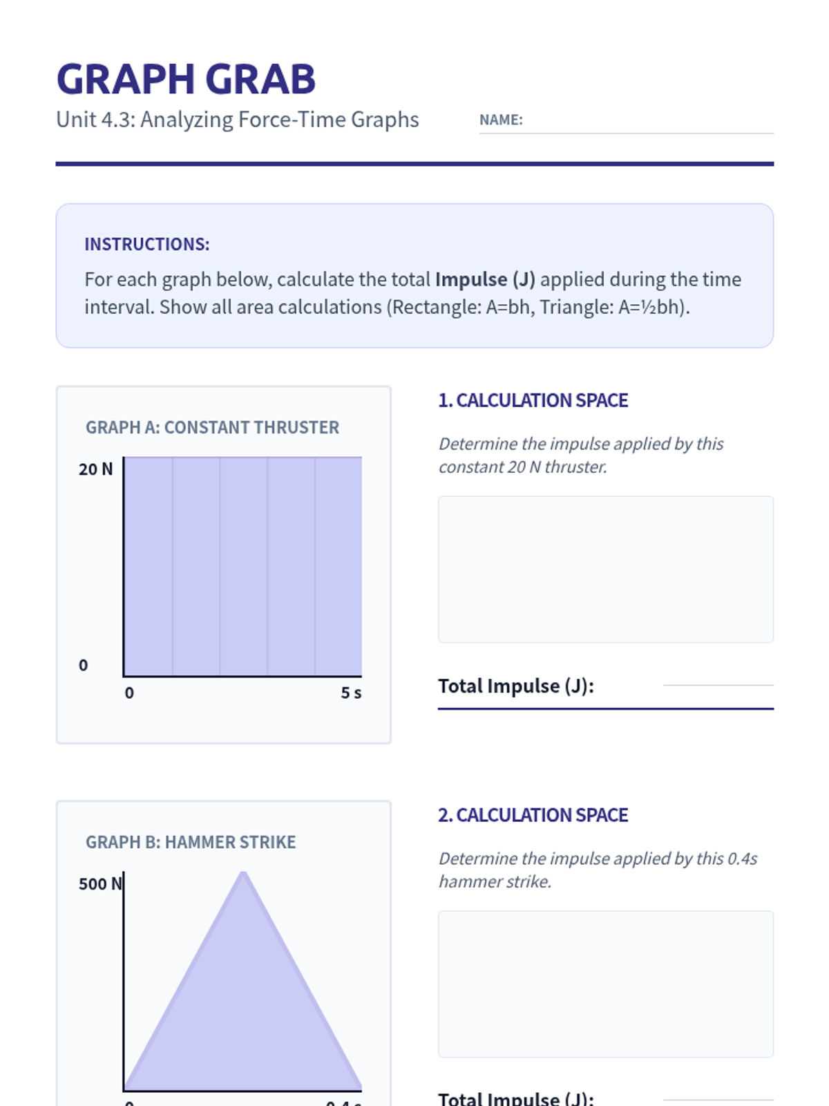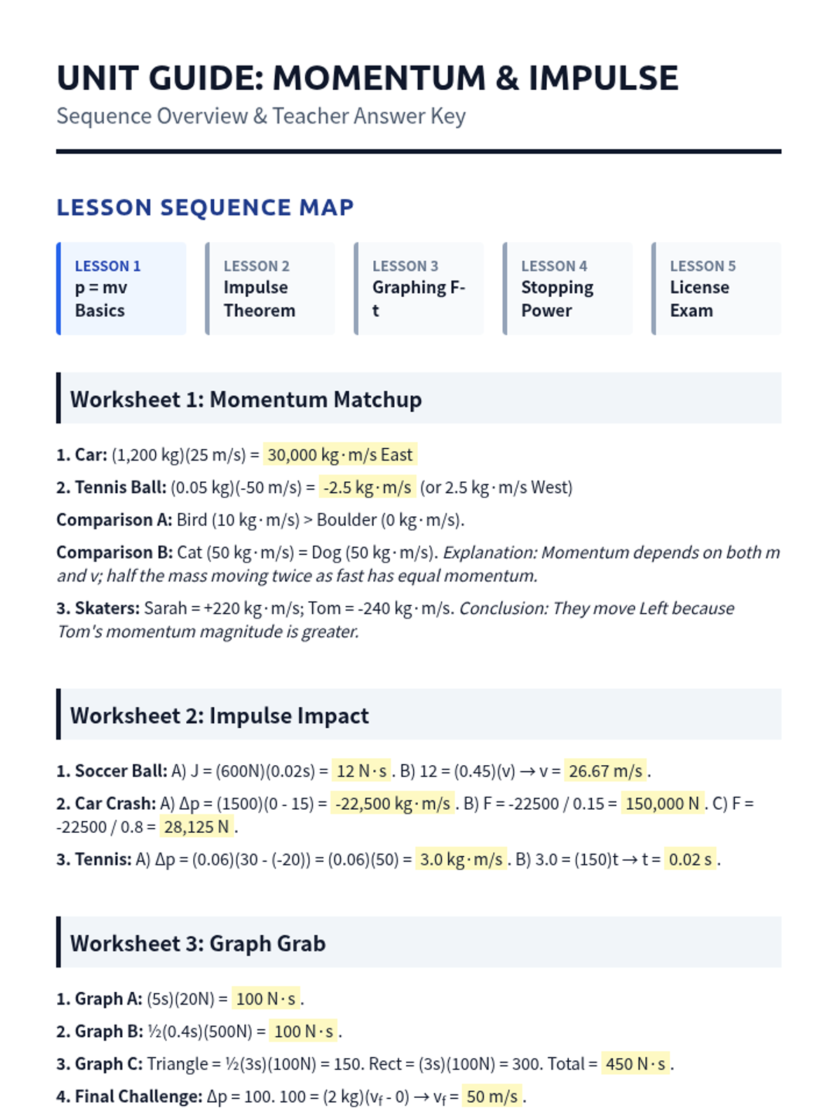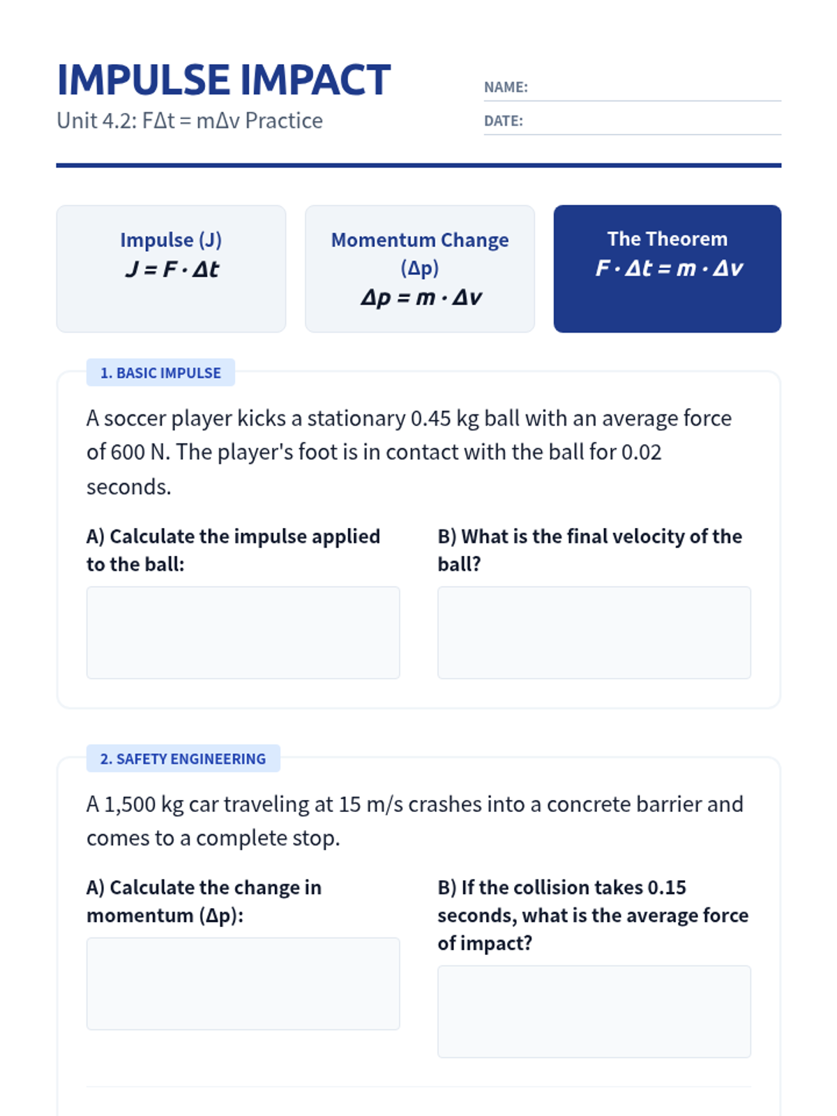 A foundational physics unit exploring the mathematical relationship between mass, velocity, force, and time. Students move from basic momentum calculations to complex impulse-momentum theorem applications and graphical analysis.