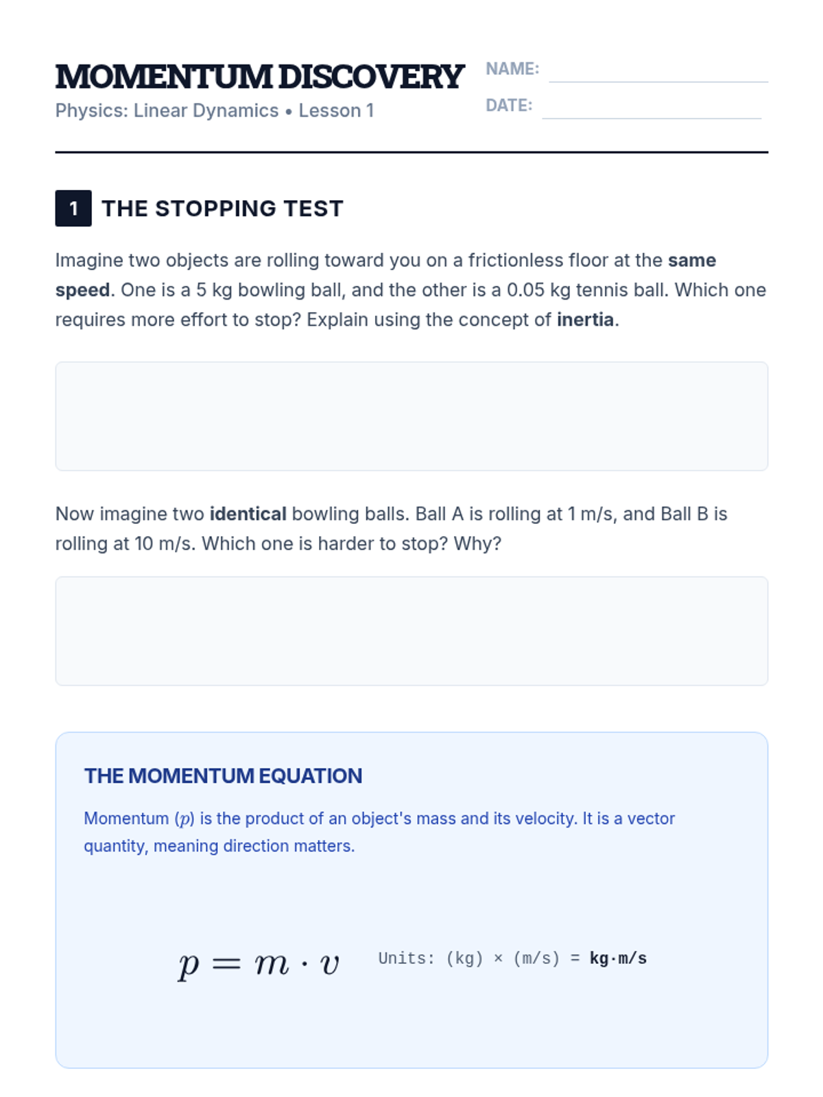 A 10th-grade physics sequence exploring the foundational relationships between mass, velocity, momentum, and impulse through inquiry and graphical analysis.