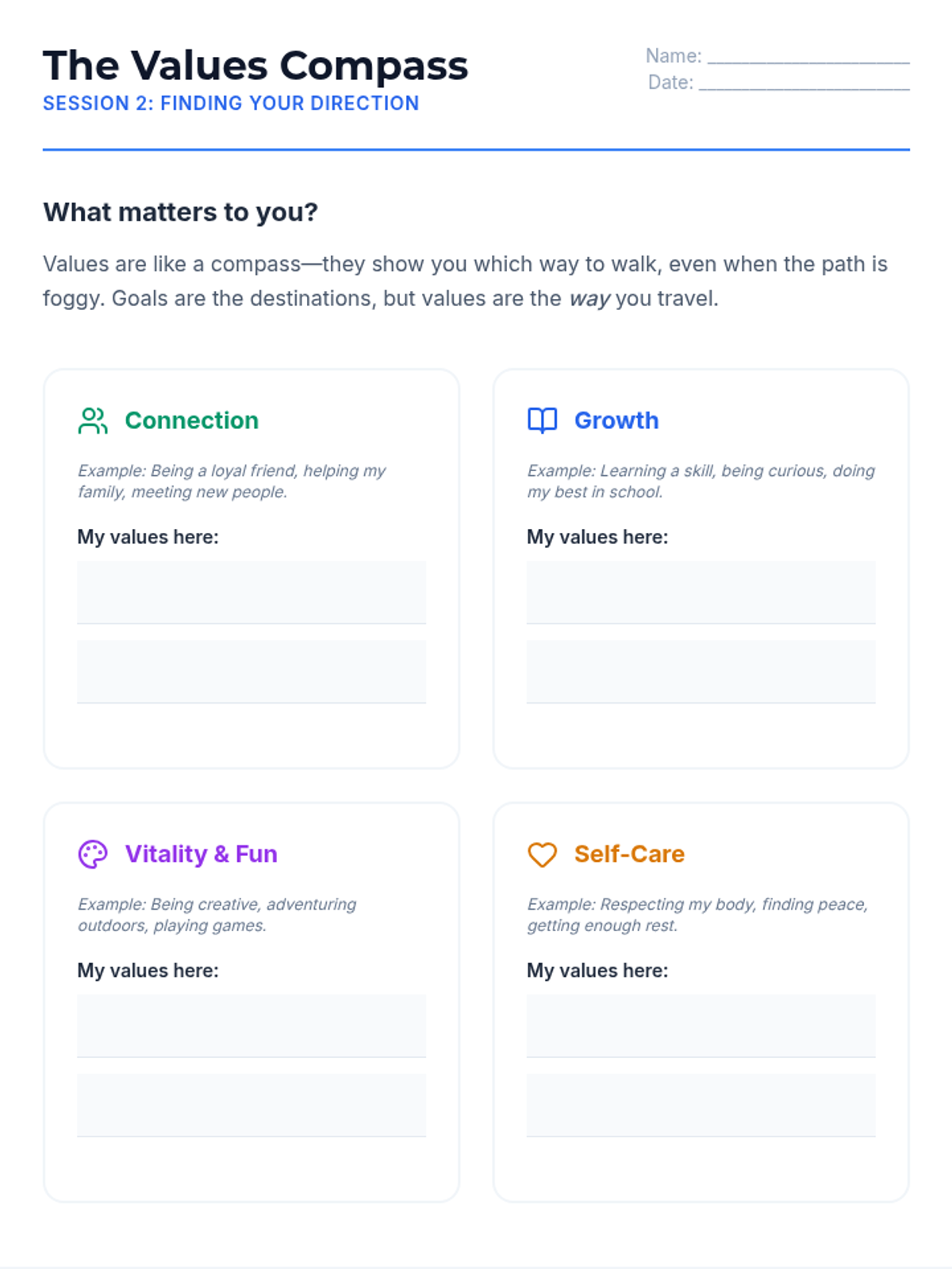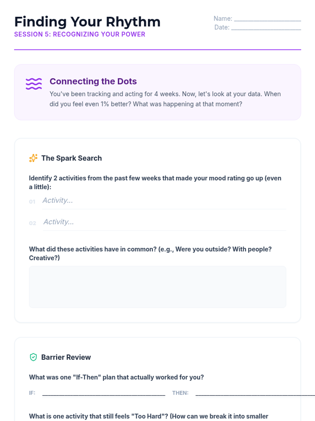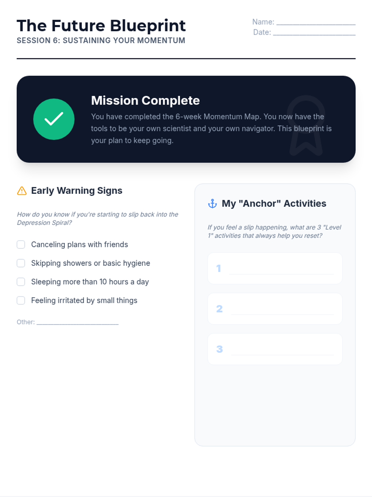 A comprehensive 6-week Behavioral Activation program for high school students struggling with anxiety and depression. The program focuses on the link between activity and mood, identifying personal values, and creating sustainable action plans to improve mental well-being.