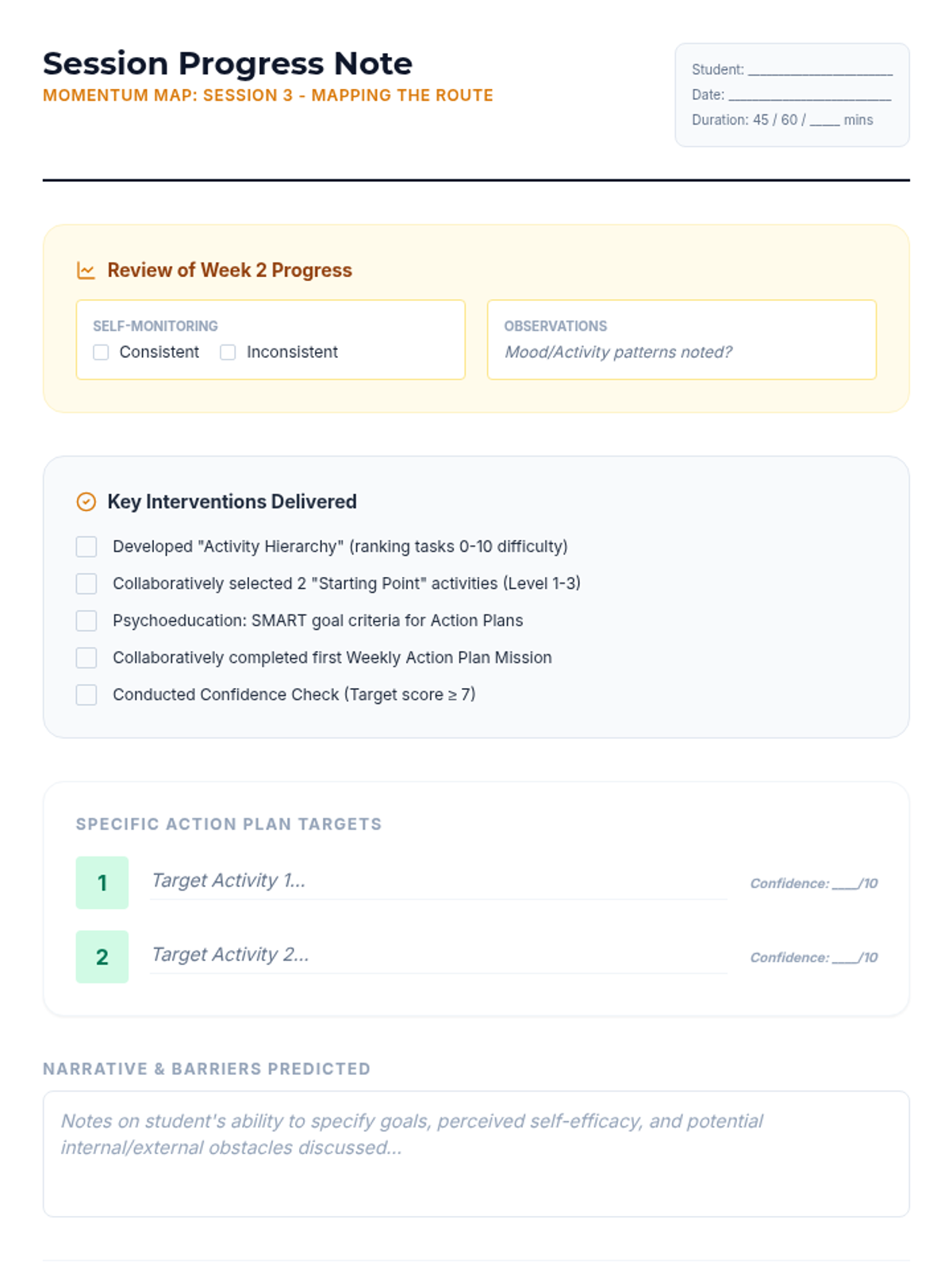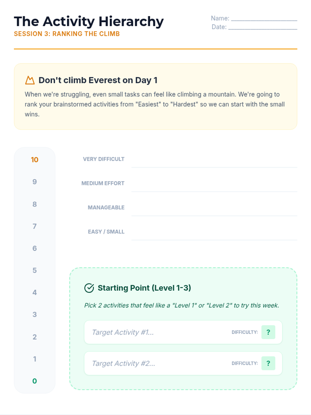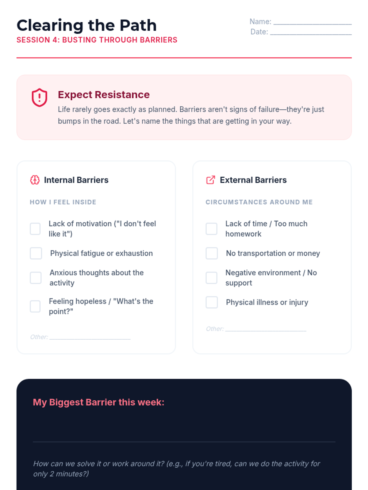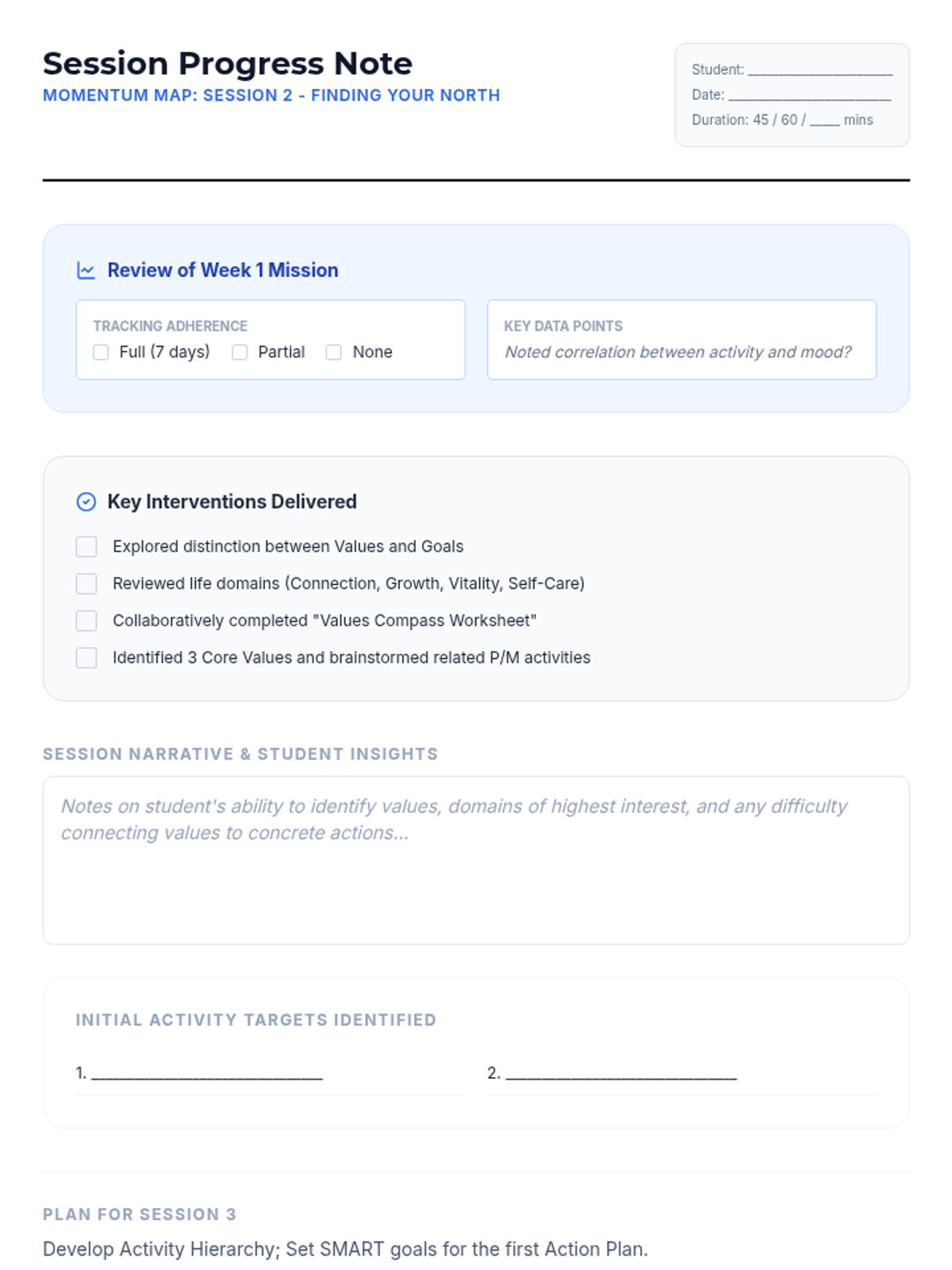 A comprehensive 6-week Behavioral Activation program for high school students struggling with anxiety and depression. The program focuses on the link between activity and mood, identifying personal values, and creating sustainable action plans to improve mental well-being.