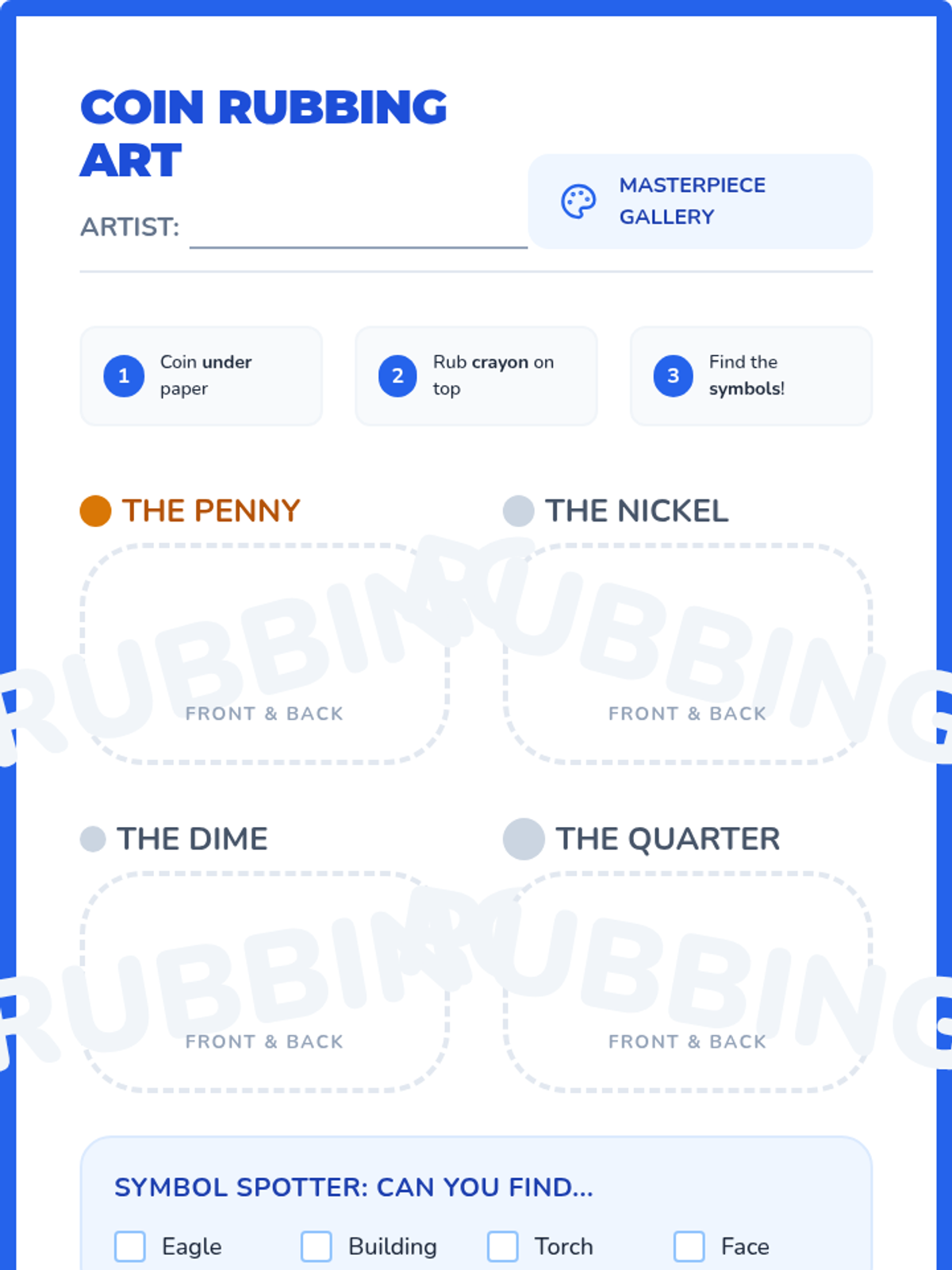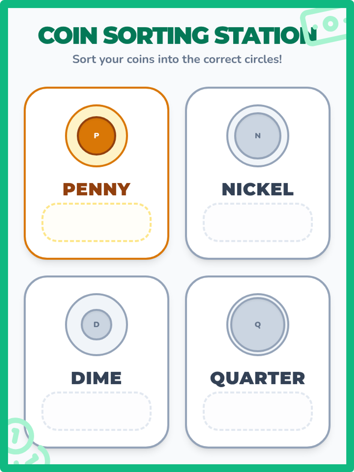 A Kindergarten sequence focused on the physical attributes and identification of US currency. Students use sensory observation, sorting, and art to recognize coins and bills and understand their basic symbols and values.