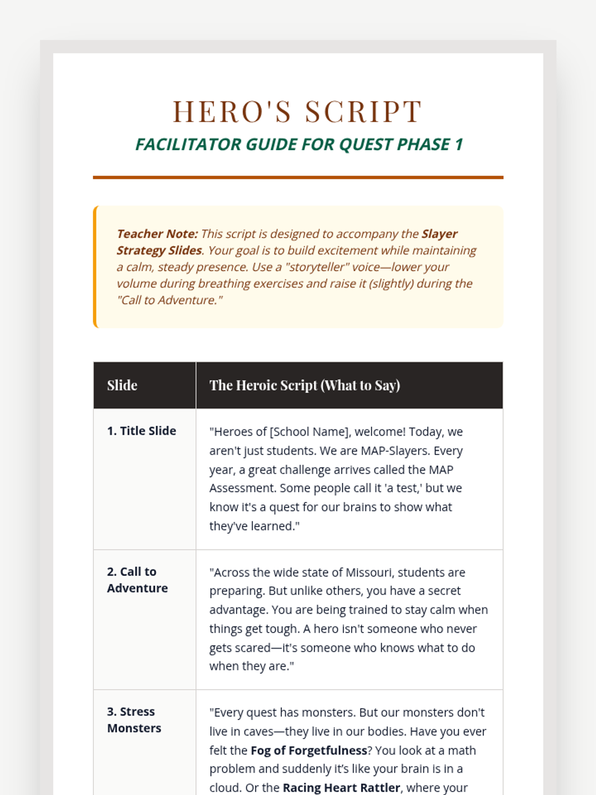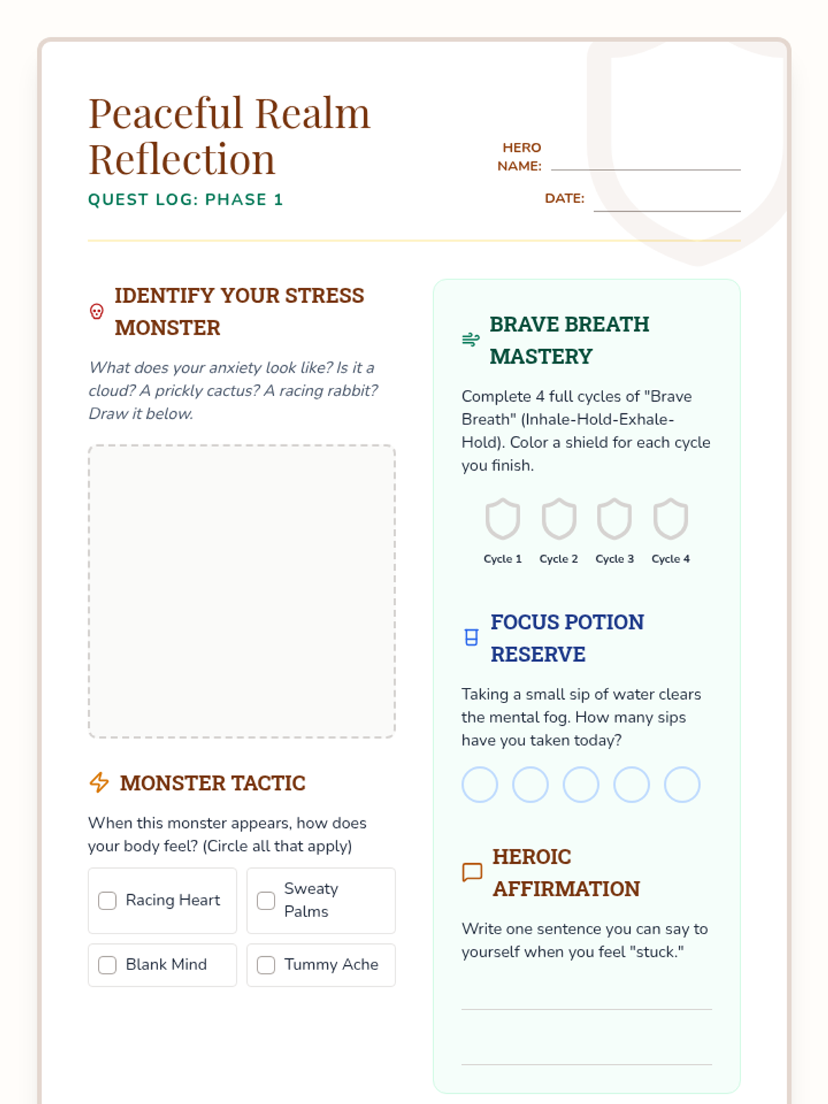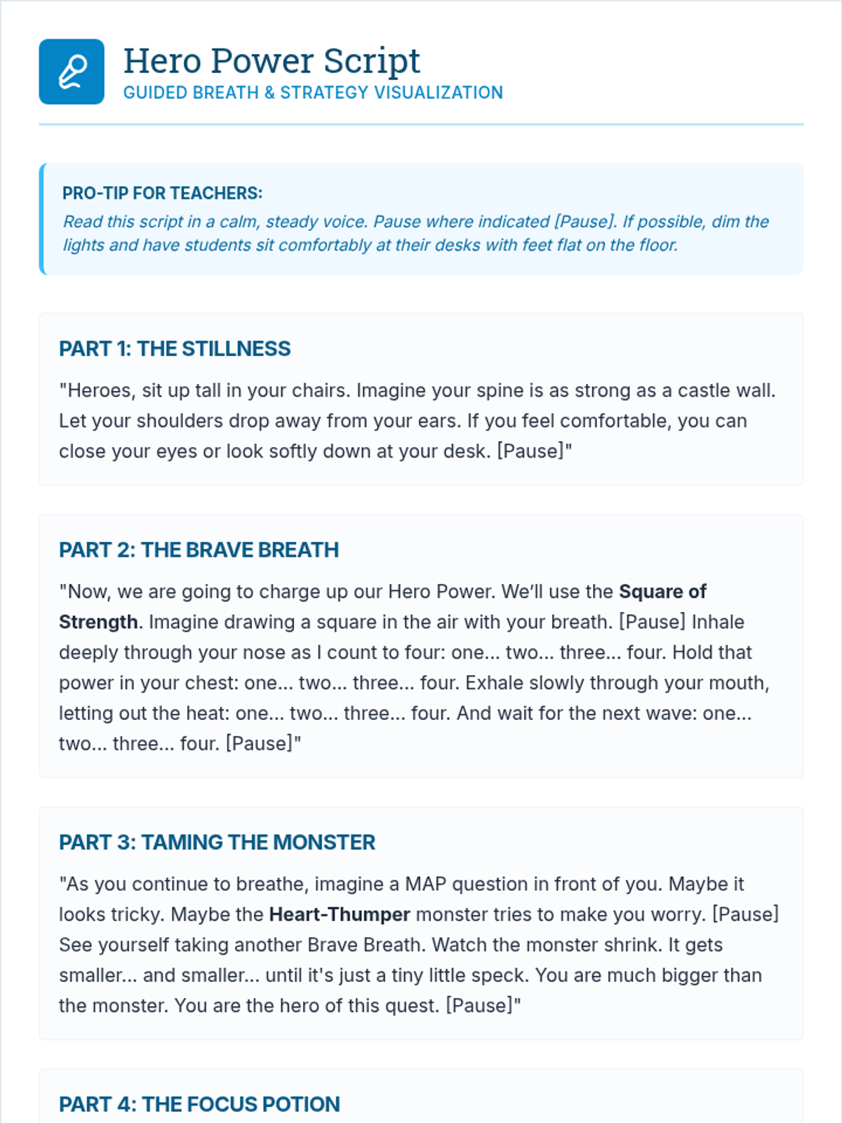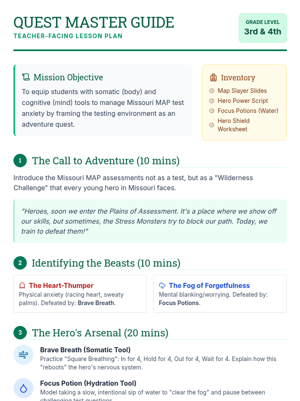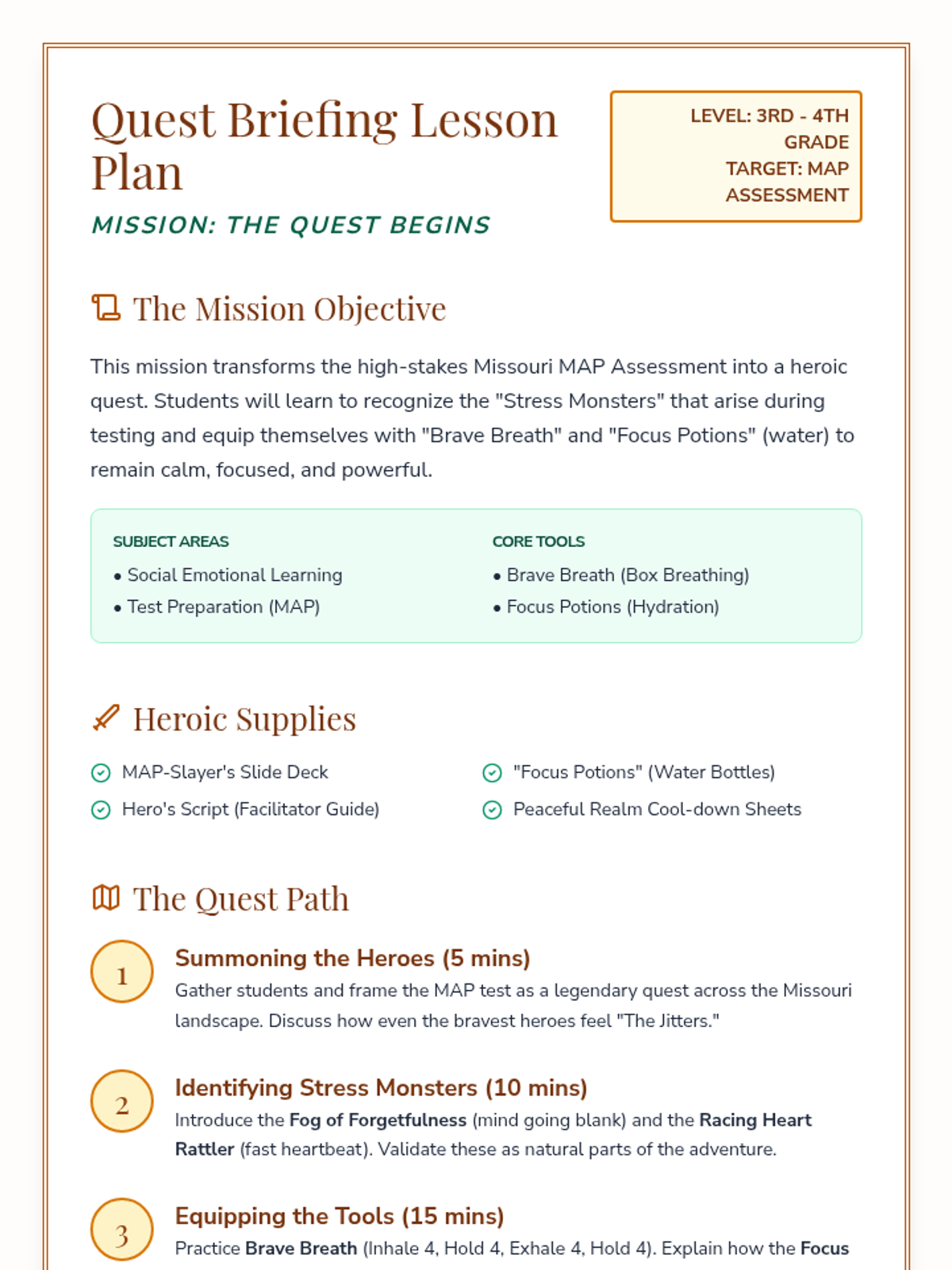 A comprehensive social-emotional unit designed to help Missouri 3rd and 4th graders manage MAP testing anxiety through an adventure-quest framework. Students learn somatic breathing techniques and cognitive reframing tools to transform performance pressure into a hero's journey.