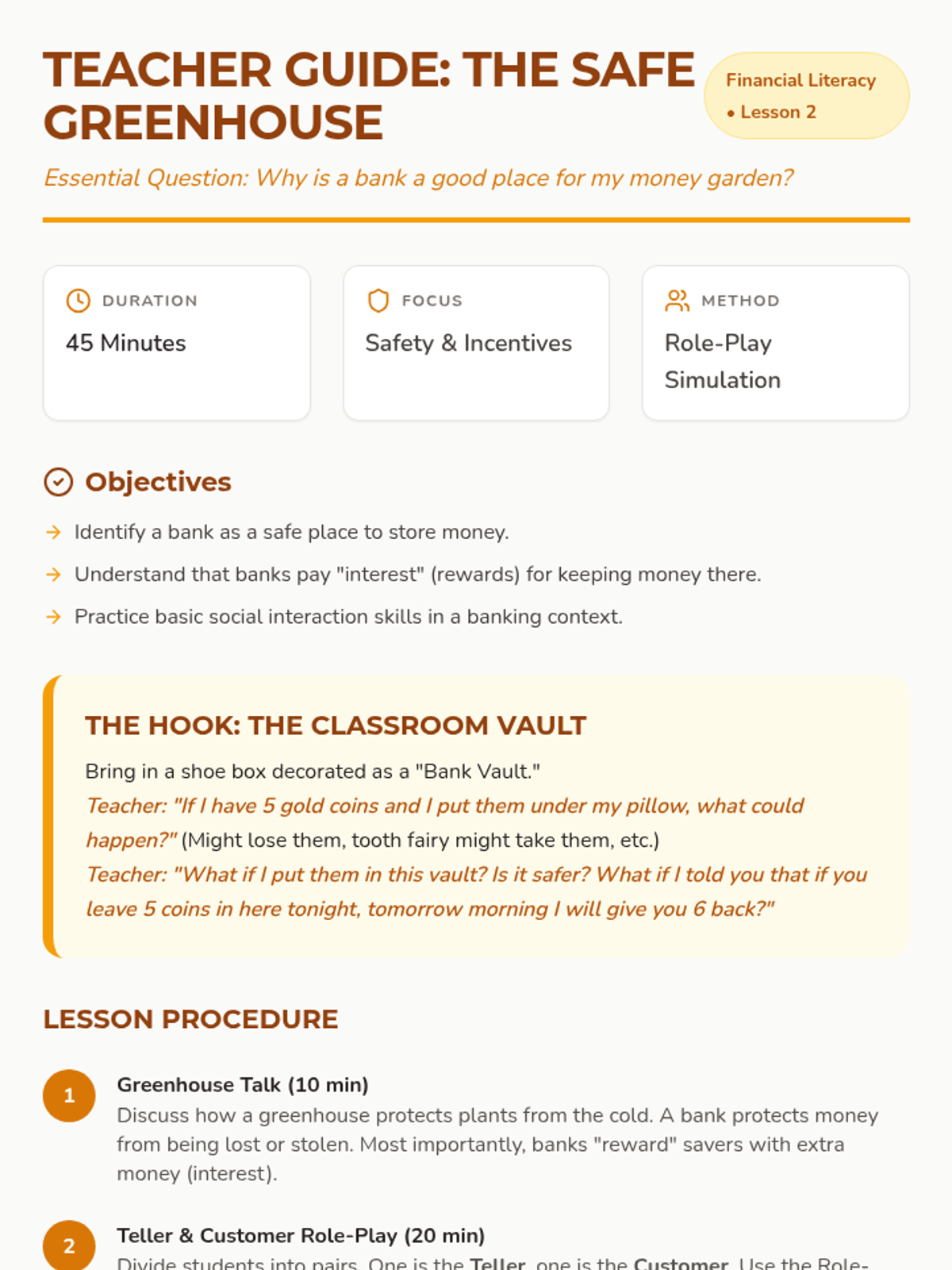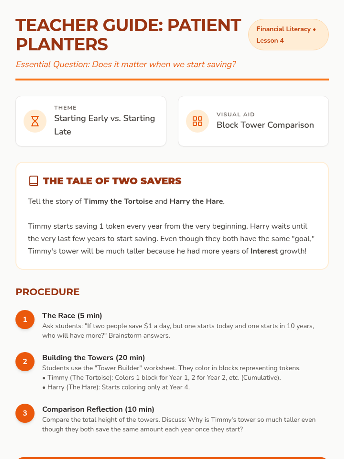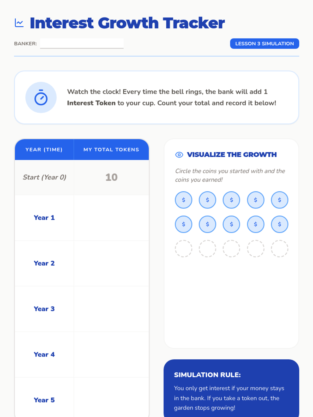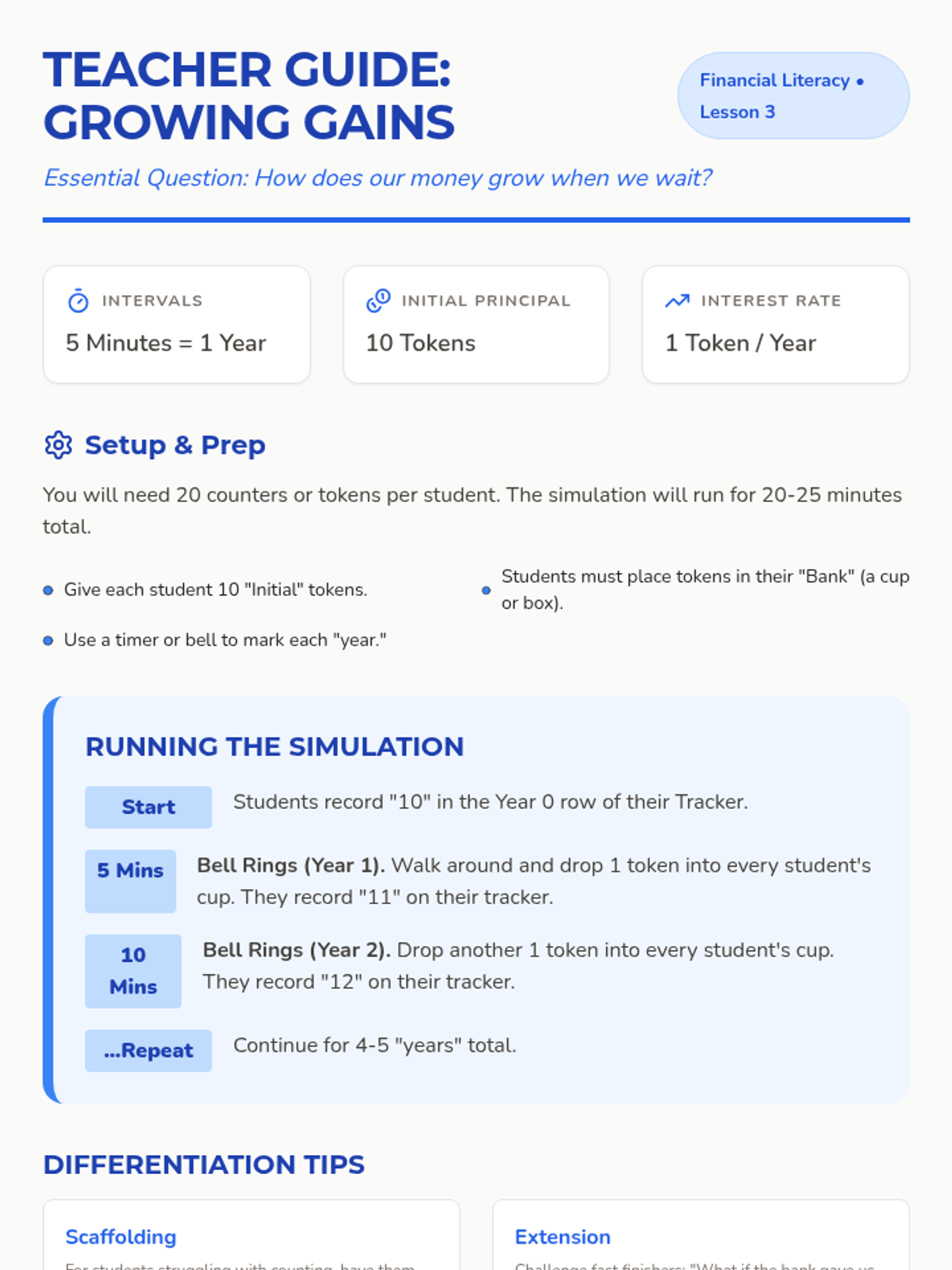 This sequence introduces 2nd-grade students to the concept of interest and money growth using a garden metaphor. Students explore how saving money in a bank leads to growth over time through simulations and hands-on activities.