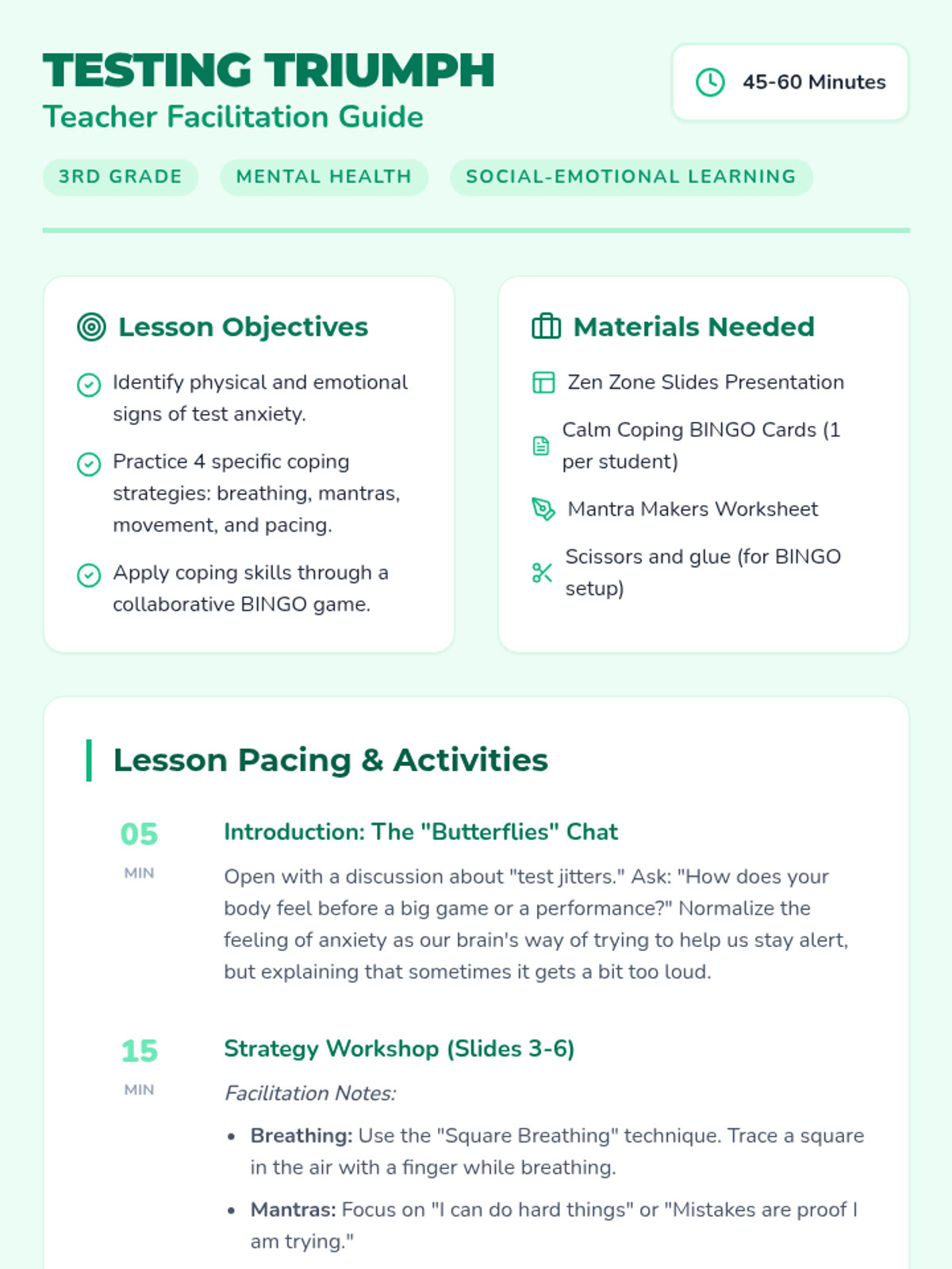 A comprehensive unit designed to support elementary students through the emotional and mental challenges of standardized testing seasons. The sequence covers emotional regulation, practical testing strategies, and building a growth mindset.