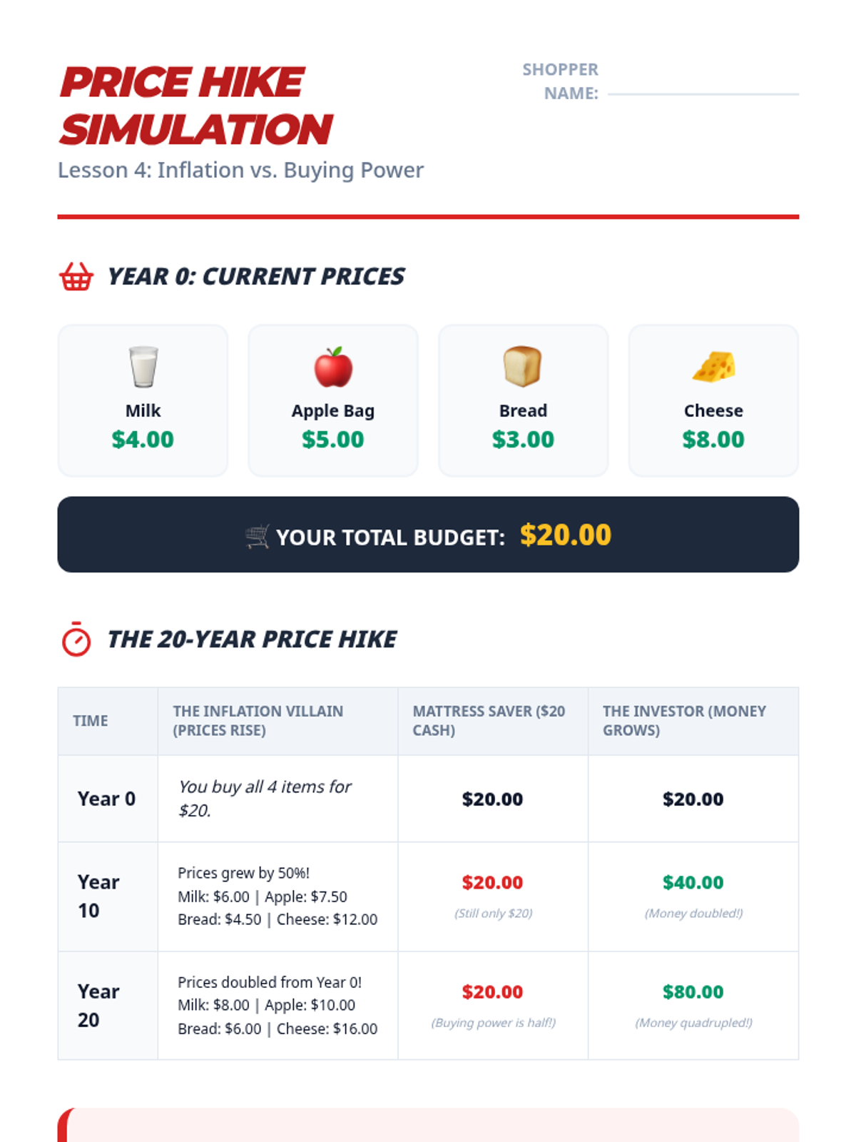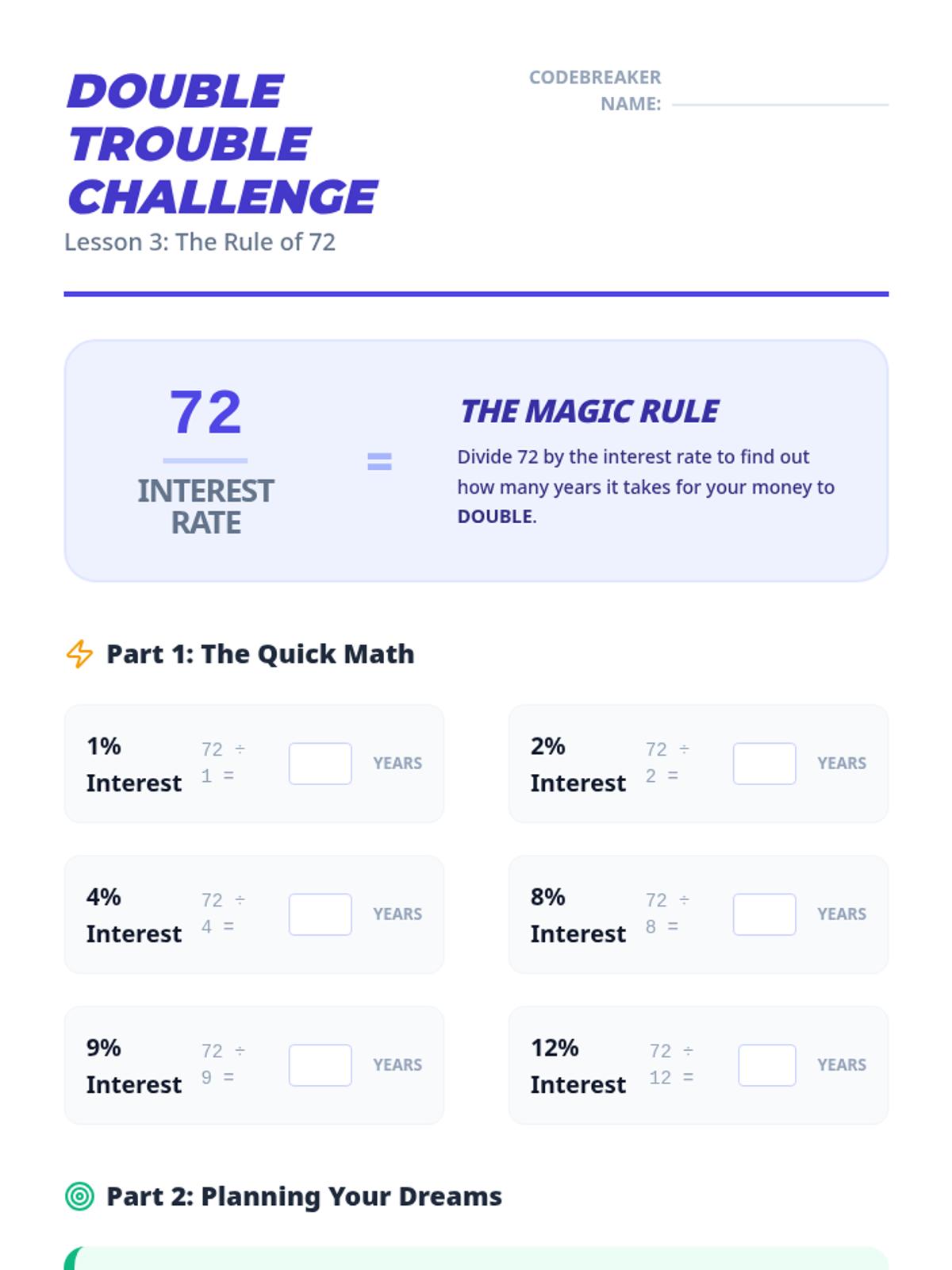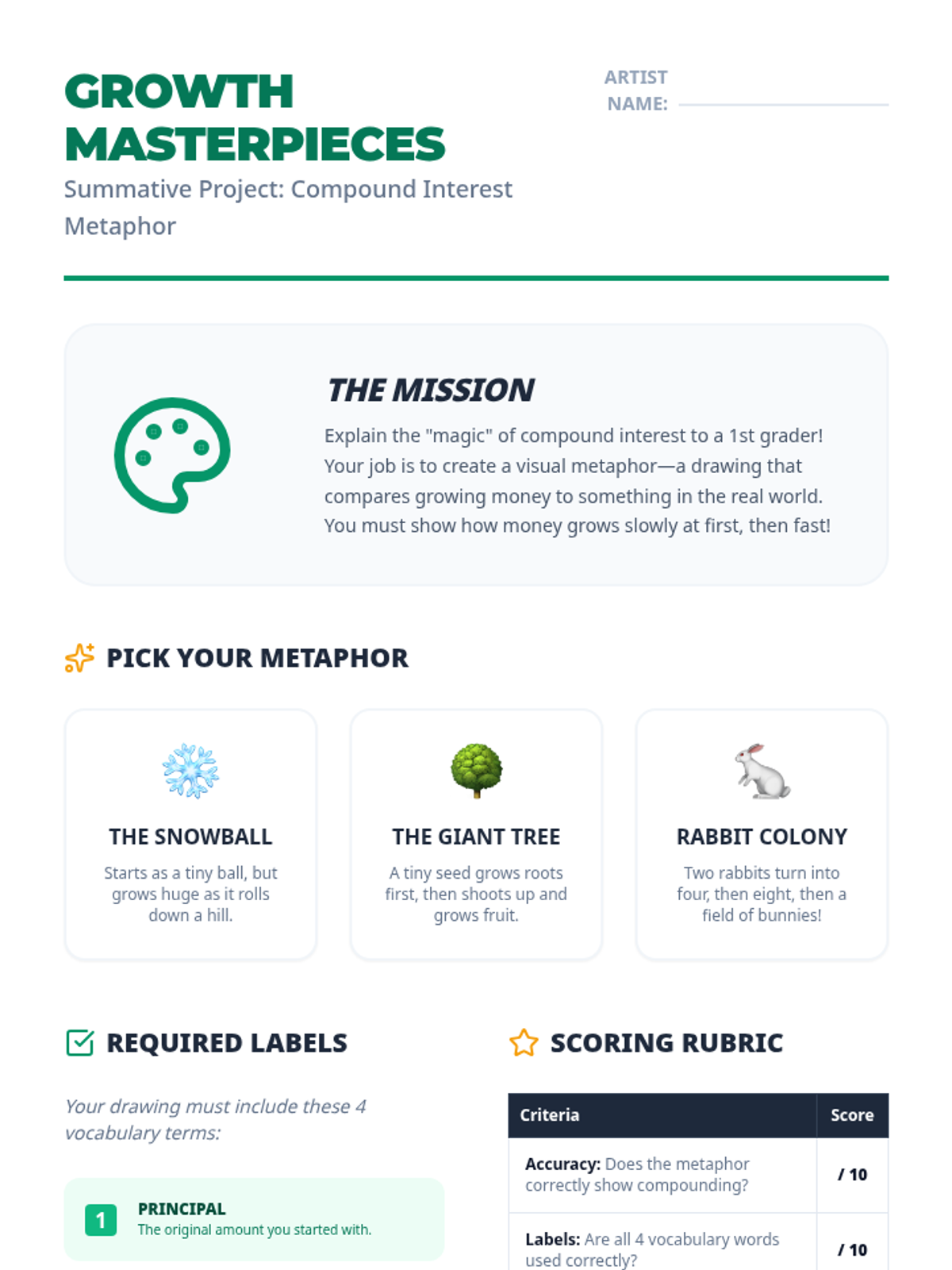 A 4th-grade financial literacy unit that demystifies compound interest through hands-on simulations, mental math challenges, and visual metaphors. Students discover how time and interest rates work together to grow wealth while learning to protect their savings from inflation.