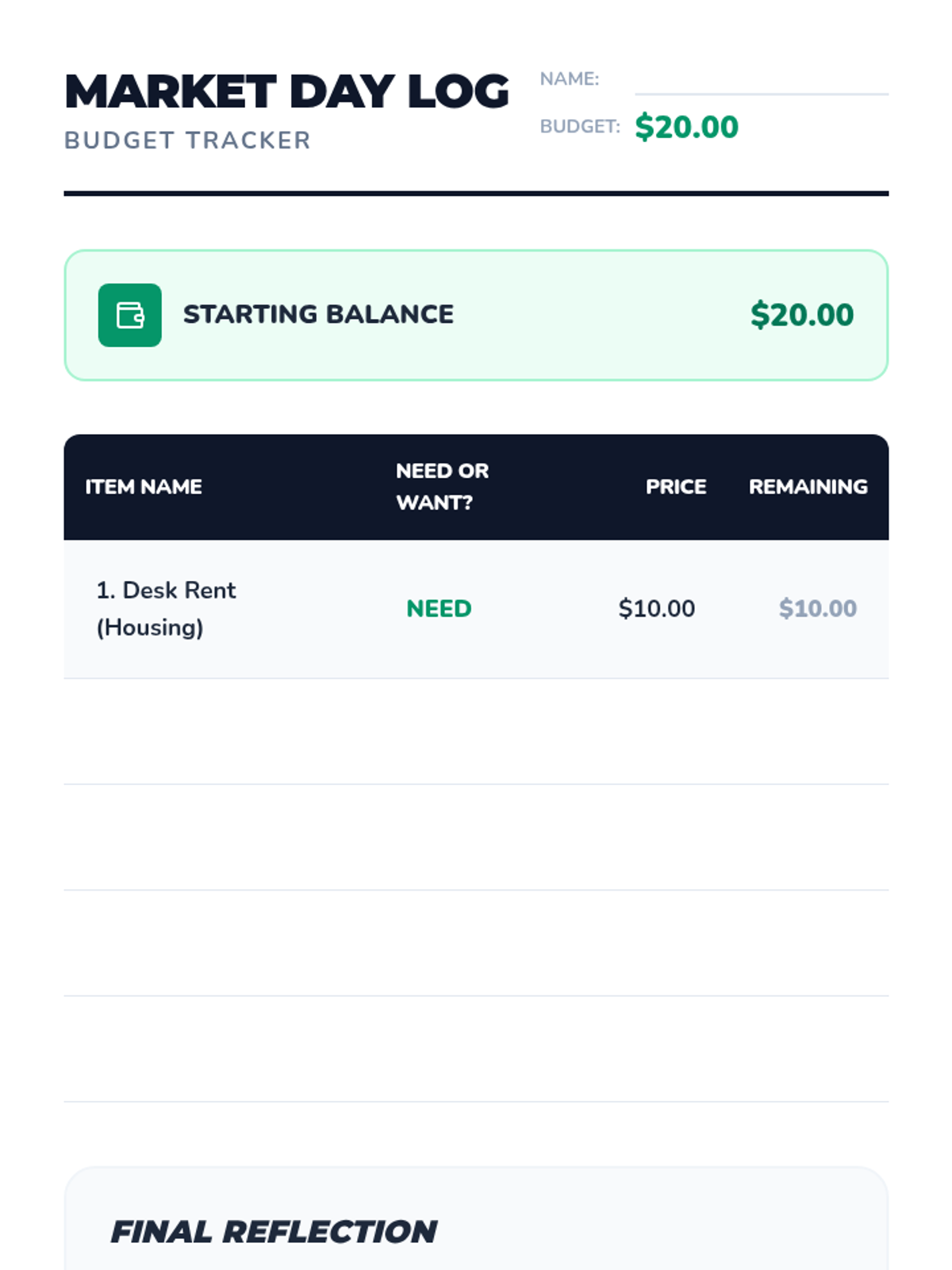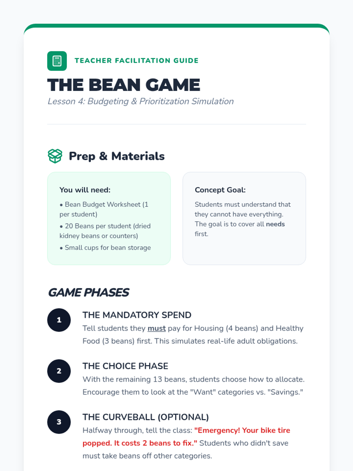 Students navigate a simulated classroom economy to learn budgeting, opportunity cost, and the difference between needs and wants through games and real-world scenarios.