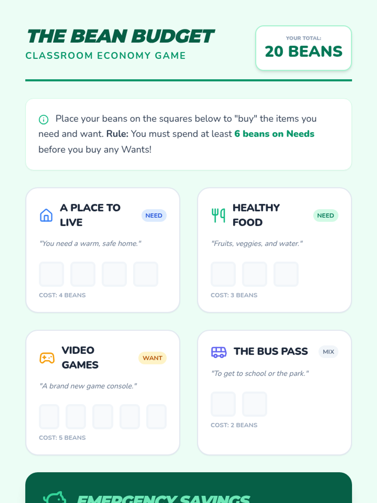 A foundational sequence for 1st graders exploring needs, wants, and scarcity. Students learn to differentiate survival essentials from desires and understand why resources are limited through simulations, games, and creative projects.
