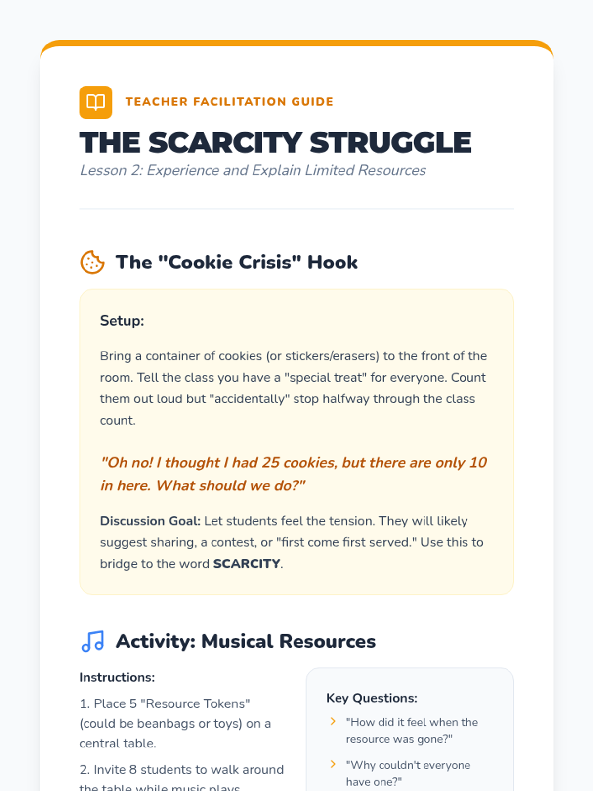 A comprehensive sequence for 1st-grade students to understand financial decision-making, covering scarcity, needs versus wants, and the fundamental concept of opportunity cost through relatable scenarios and creative projects.