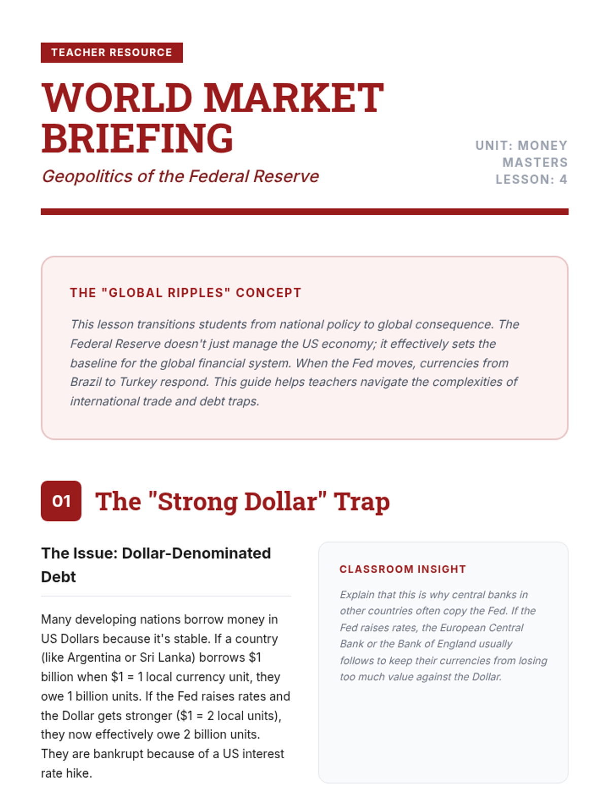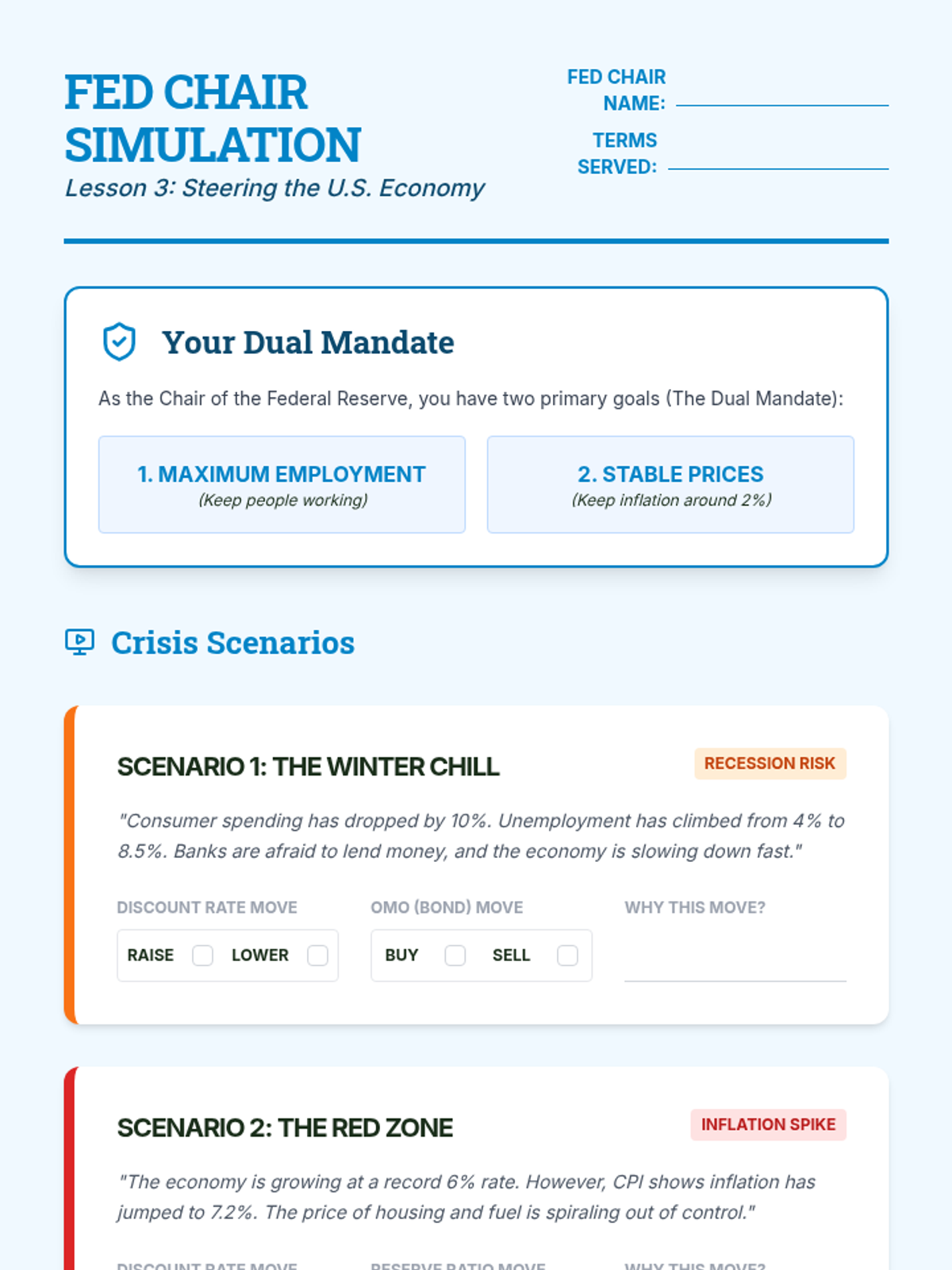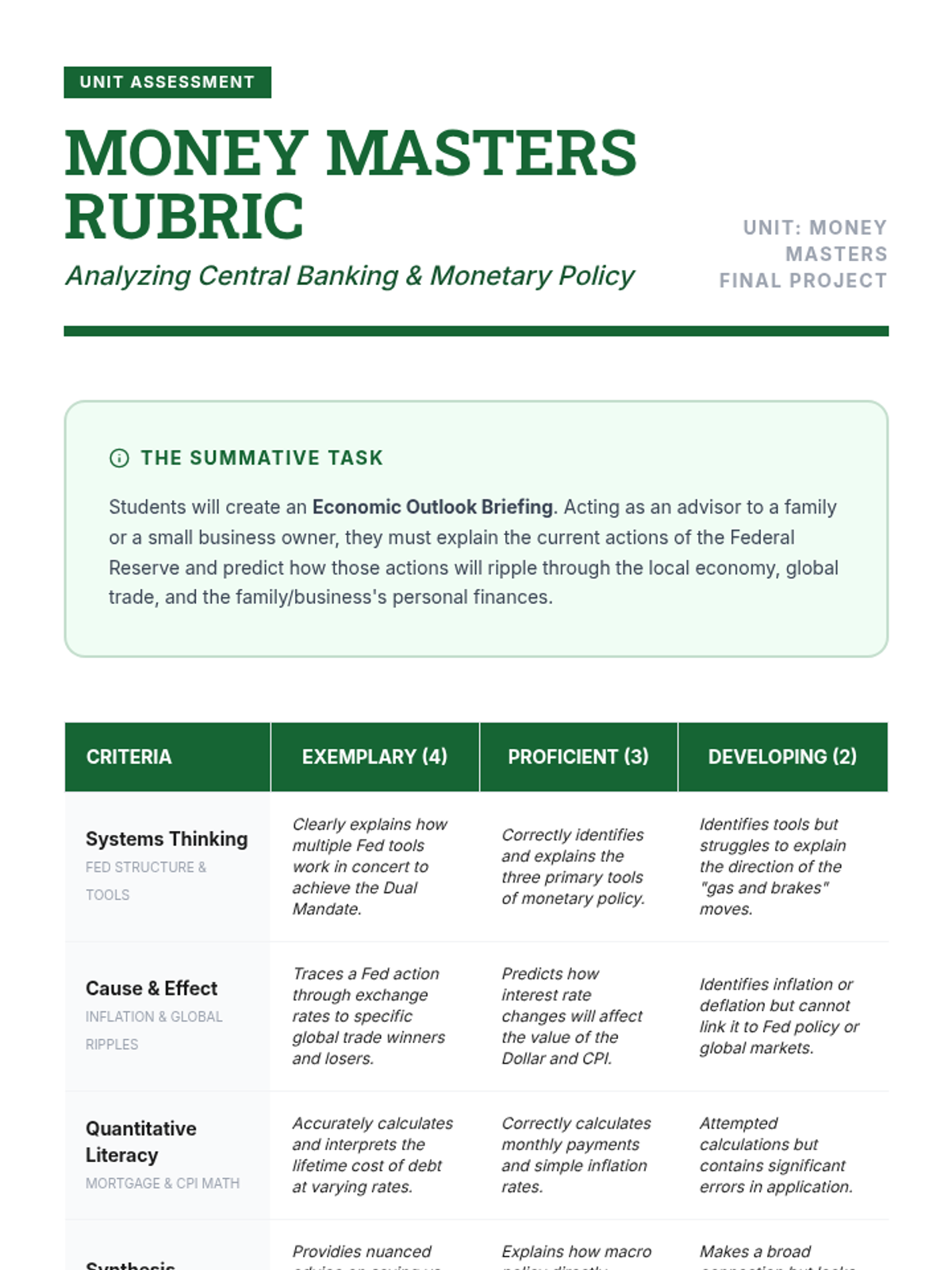 A comprehensive high school economics unit exploring the Federal Reserve, monetary policy tools, inflation, and the global and personal impact of central banking decisions.