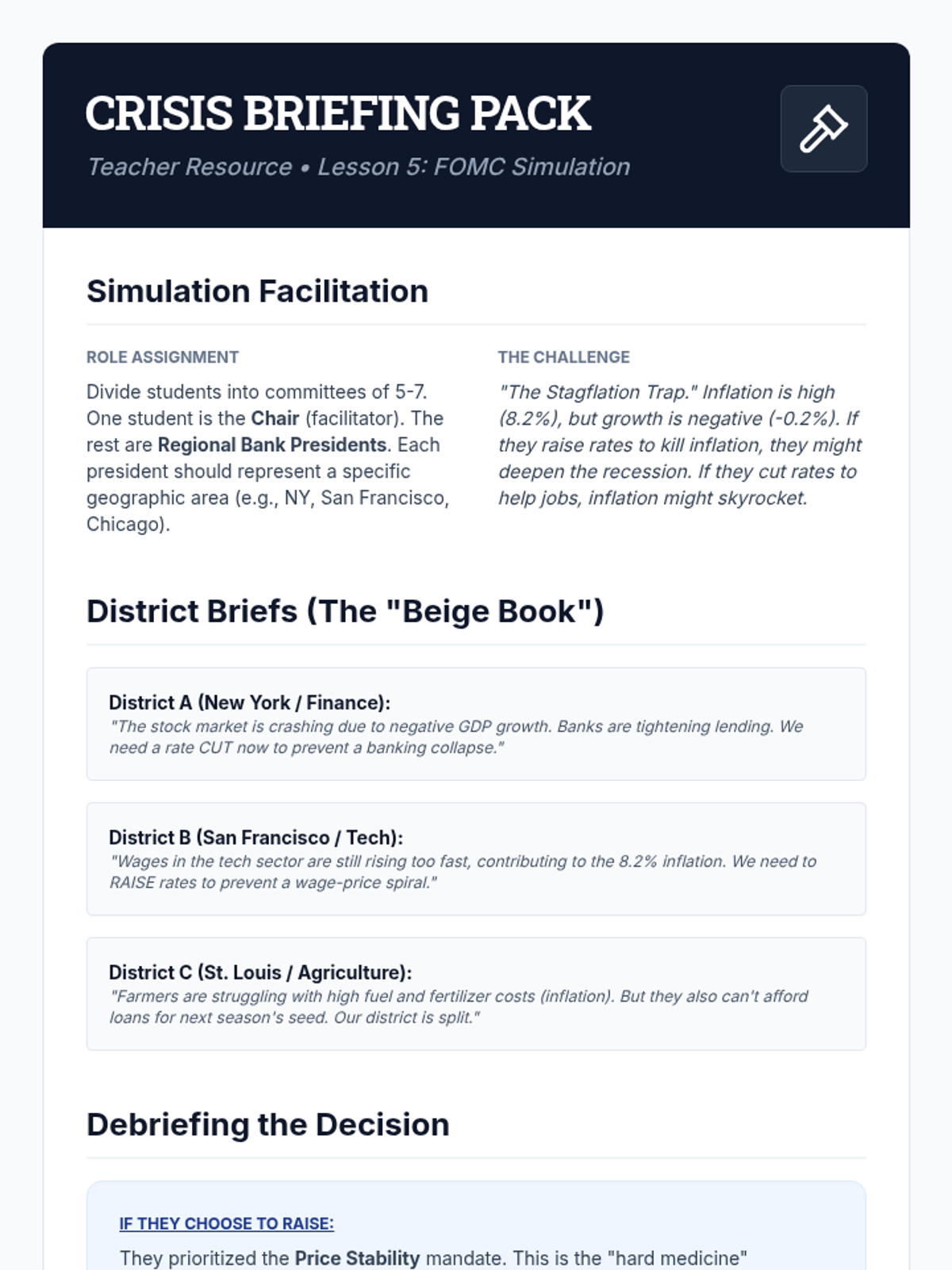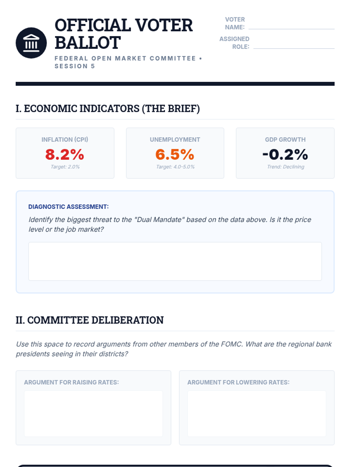 A comprehensive 12th-grade unit on the Federal Reserve, exploring how monetary policy levers influence national stability, employment, and the value of currency through case studies and simulations.