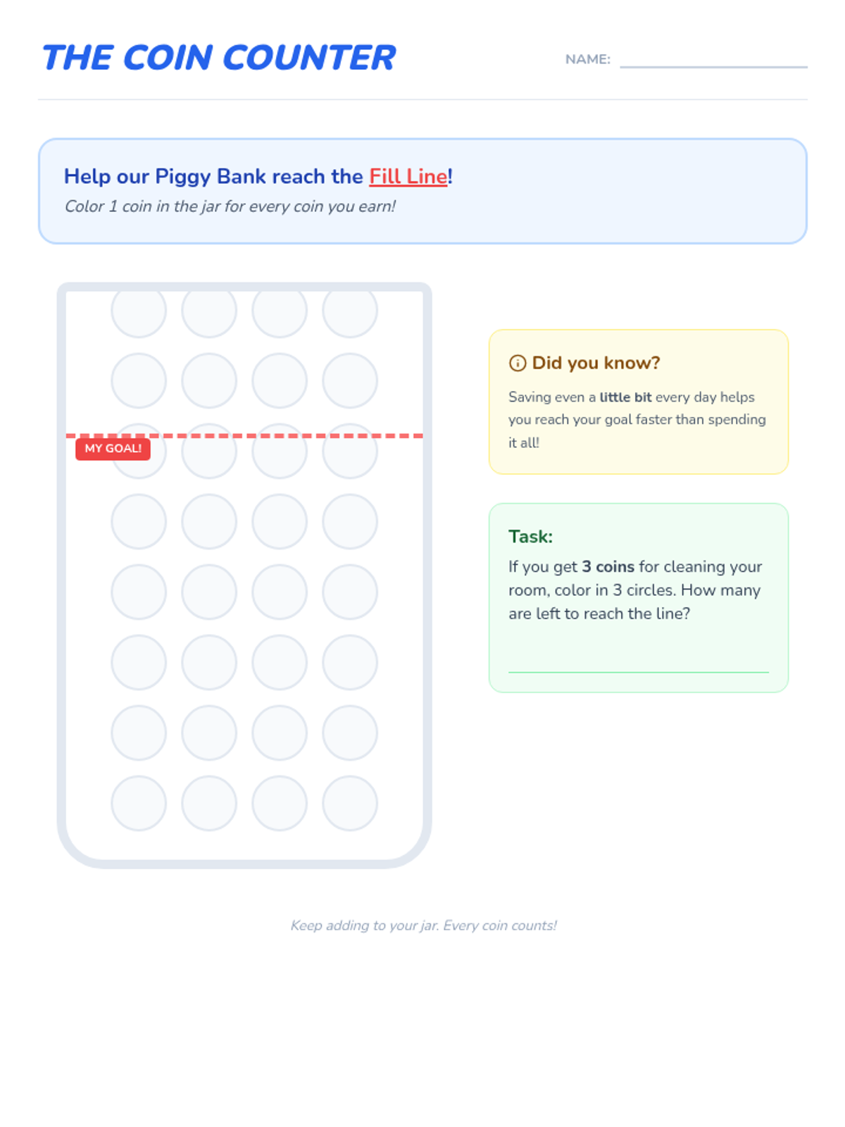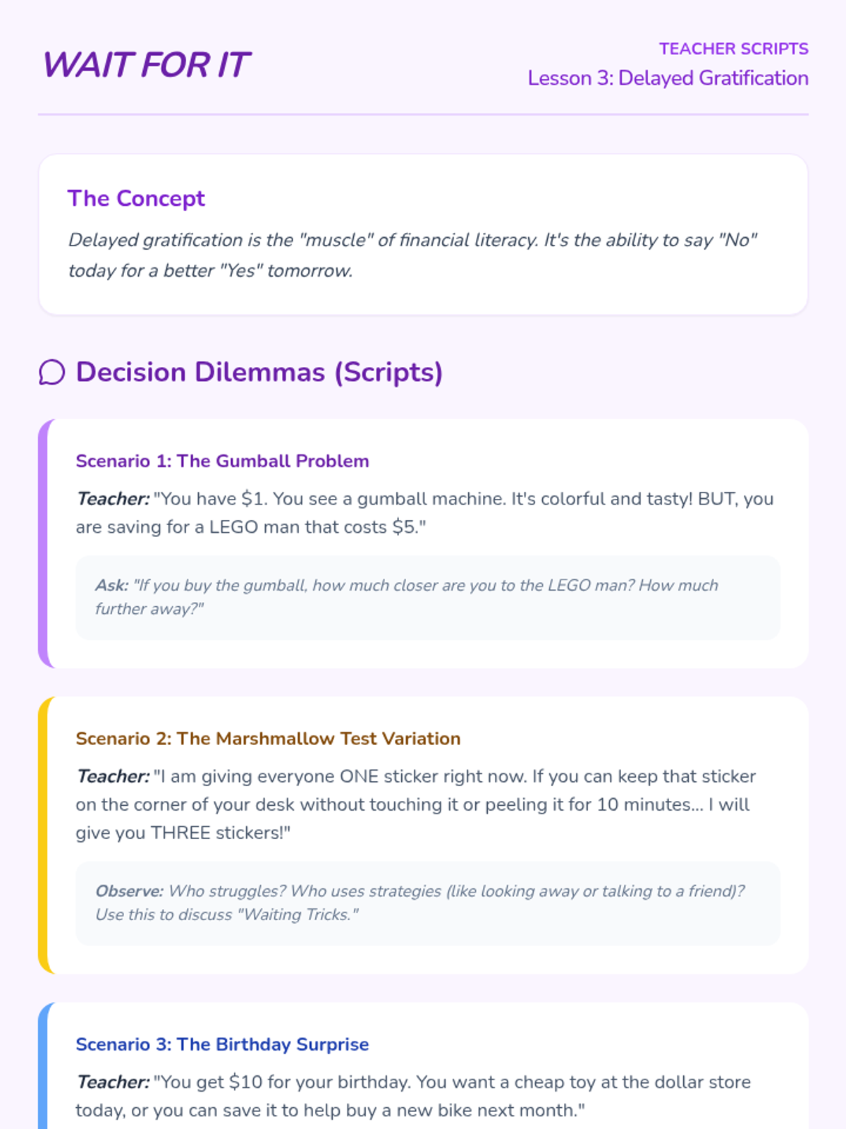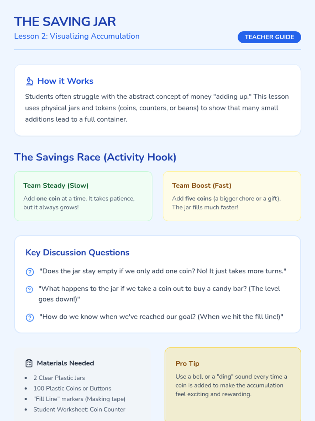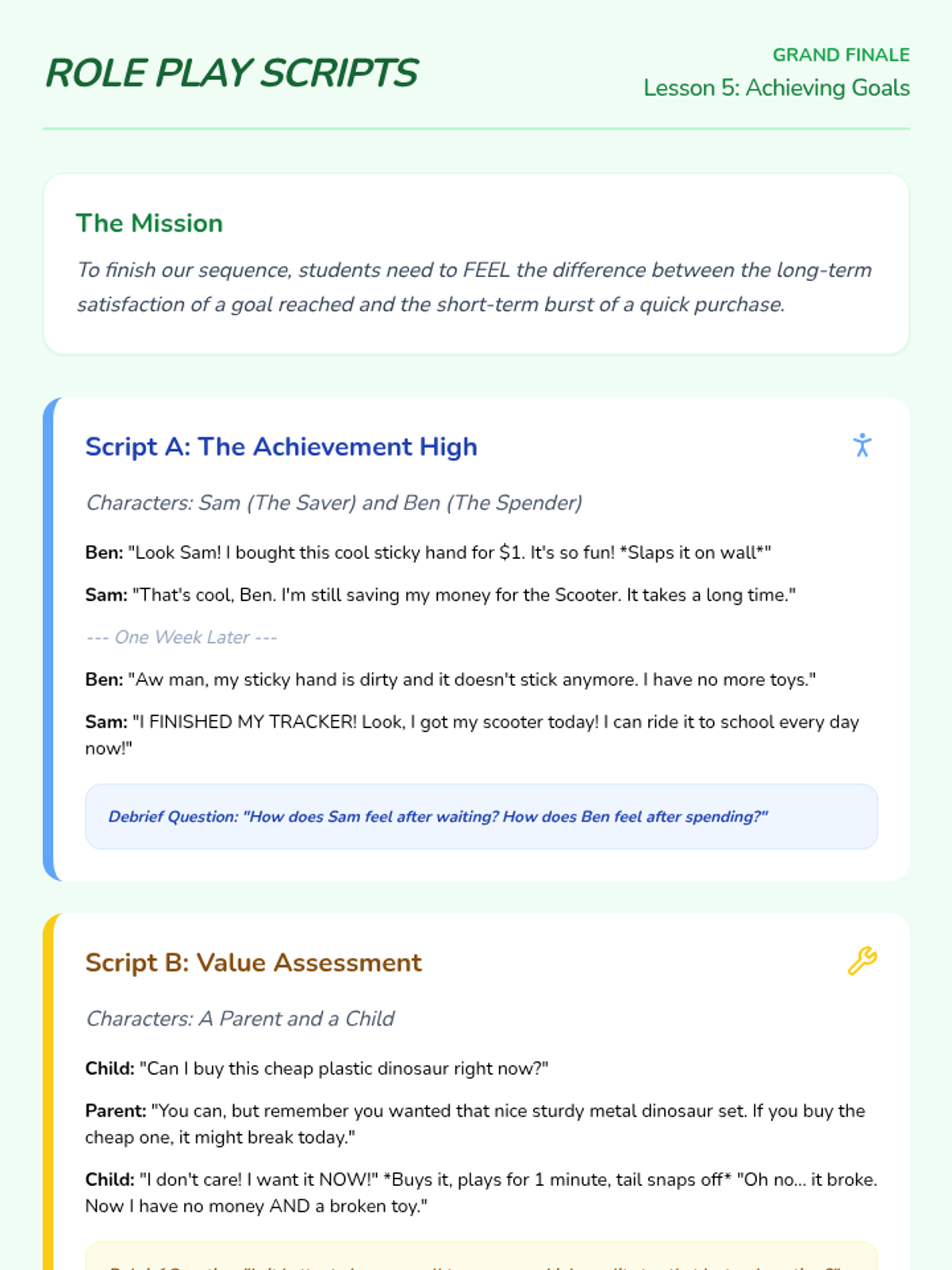 This sequence teaches 1st Grade students the fundamentals of financial goal setting, delayed gratification, and tracking savings. Students learn that patience and planning lead to greater rewards through hands-on activities, visual tracking, and reflective role-play.