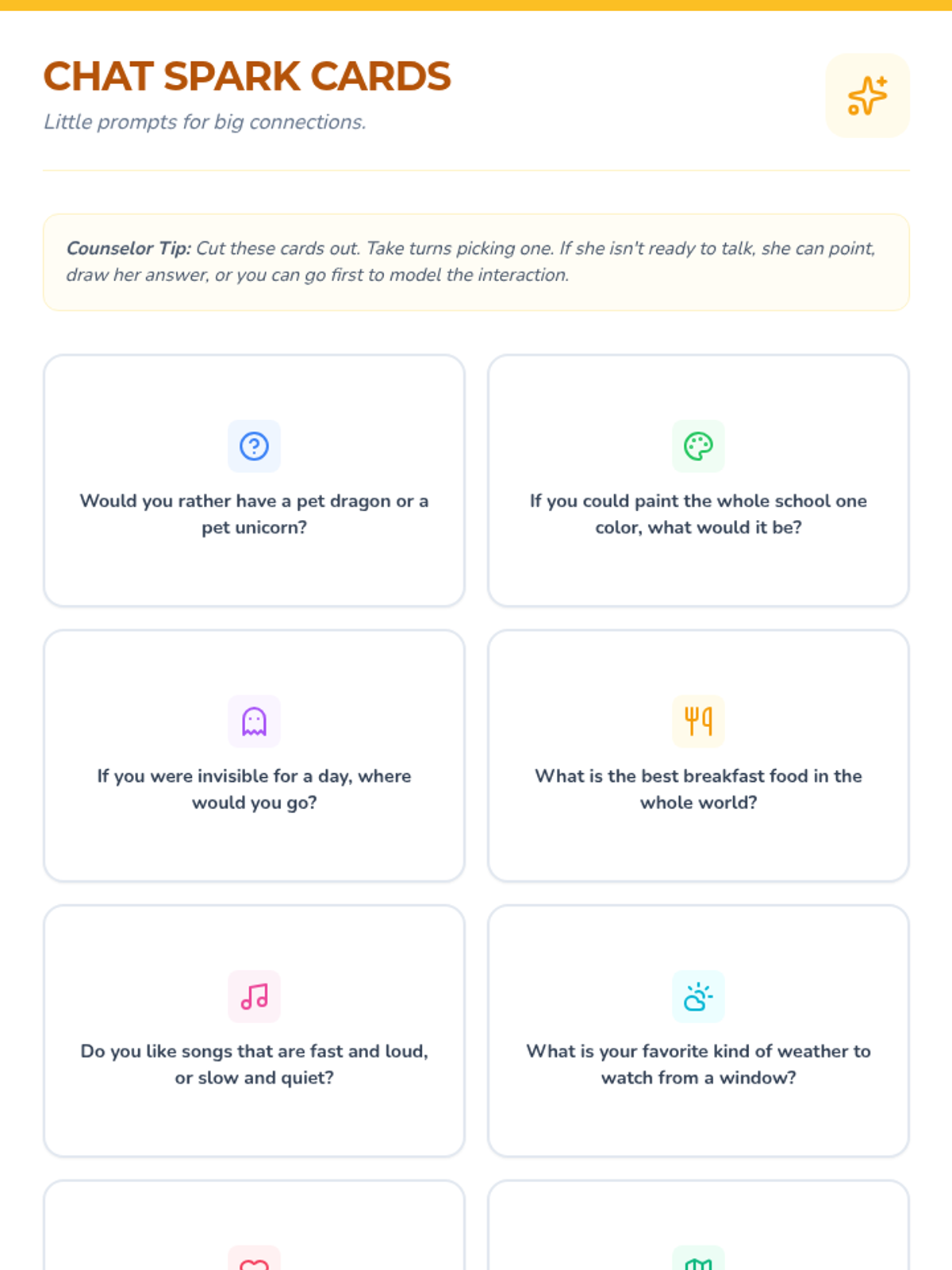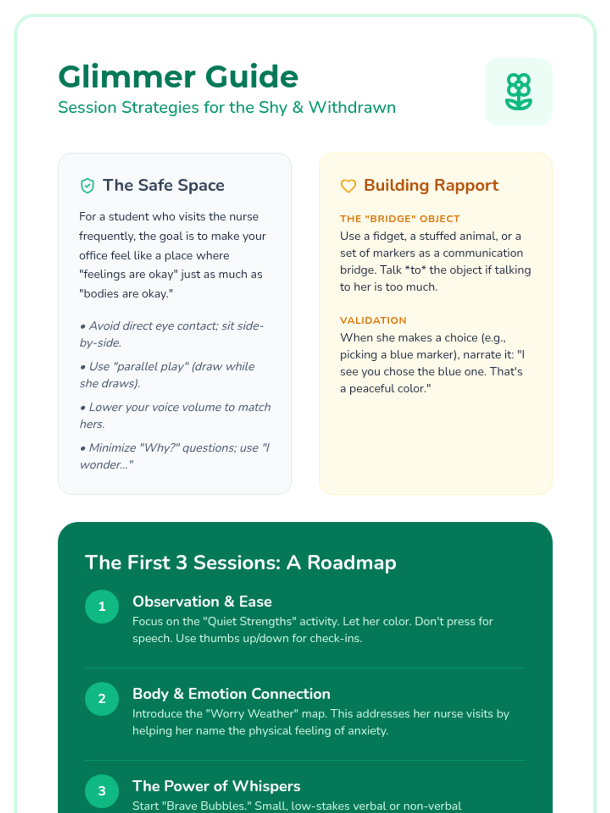 A gentle, supportive sequence of sessions designed for a shy 3rd-grade student to build trust, explore emotions, and gradually find her voice through low-pressure activities and creative expression.