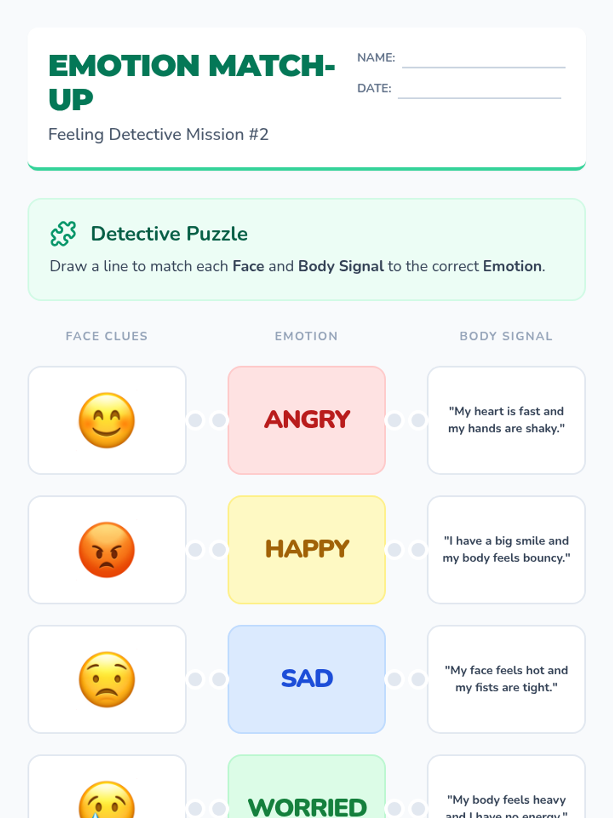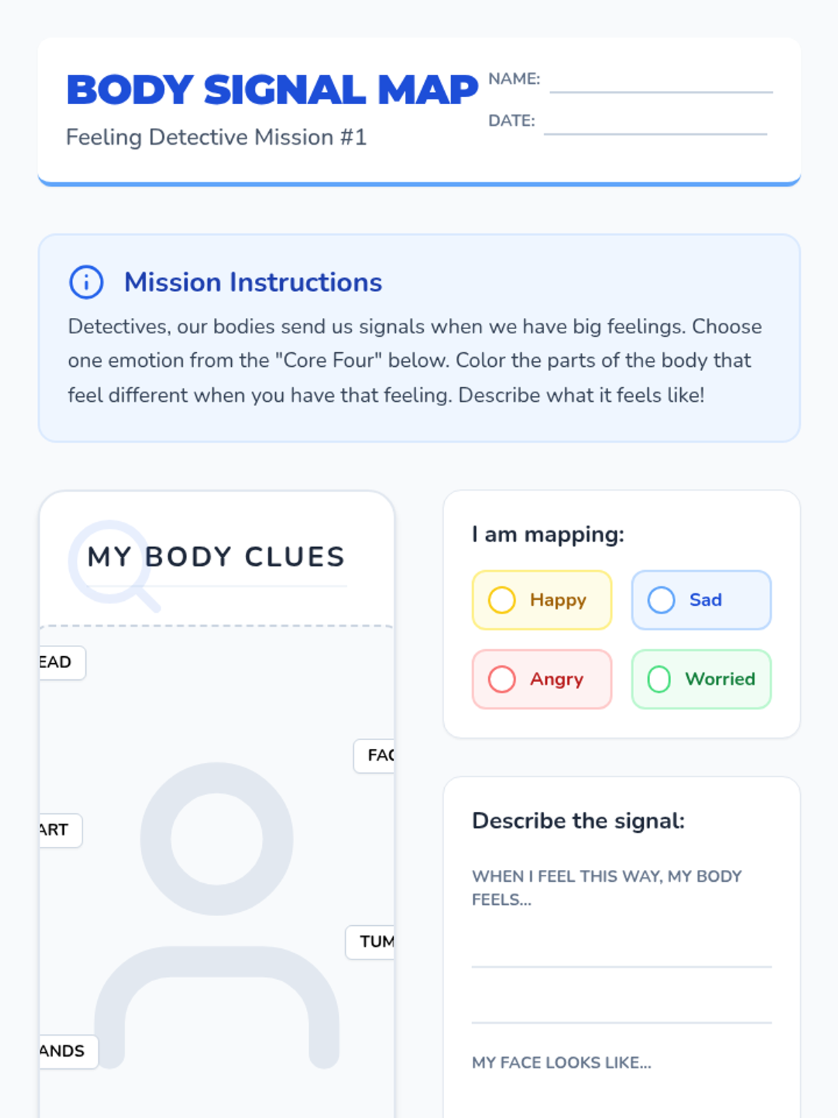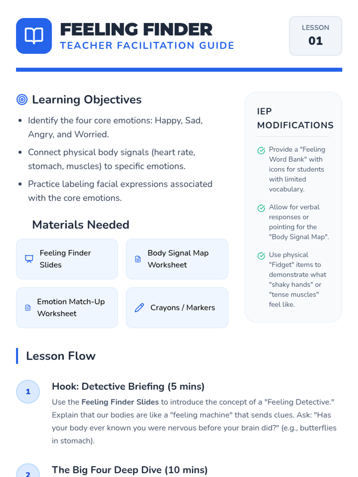 A comprehensive 3-lesson unit for 3rd-grade IEP counseling students focused on identifying emotions through body signals, situational context, and intensity levels. Using a 'Feeling Detective' theme, students develop the foundational skills for self-regulation.