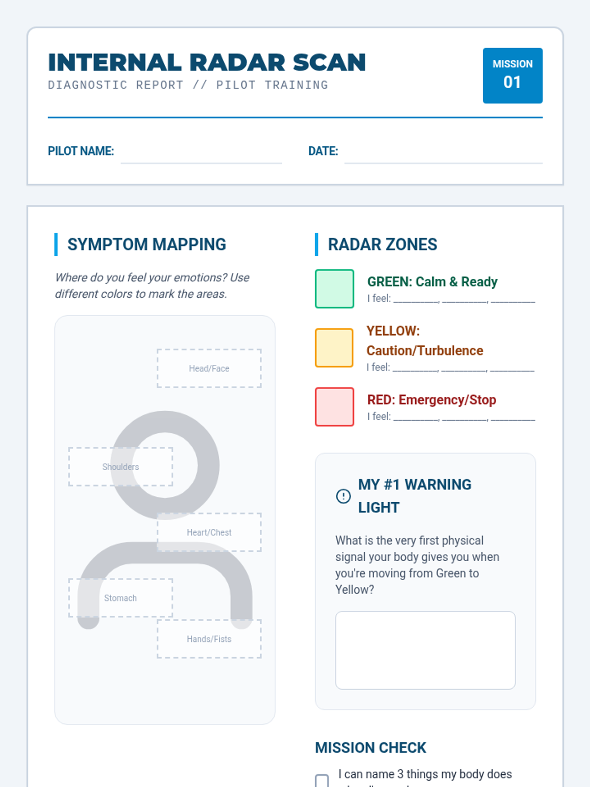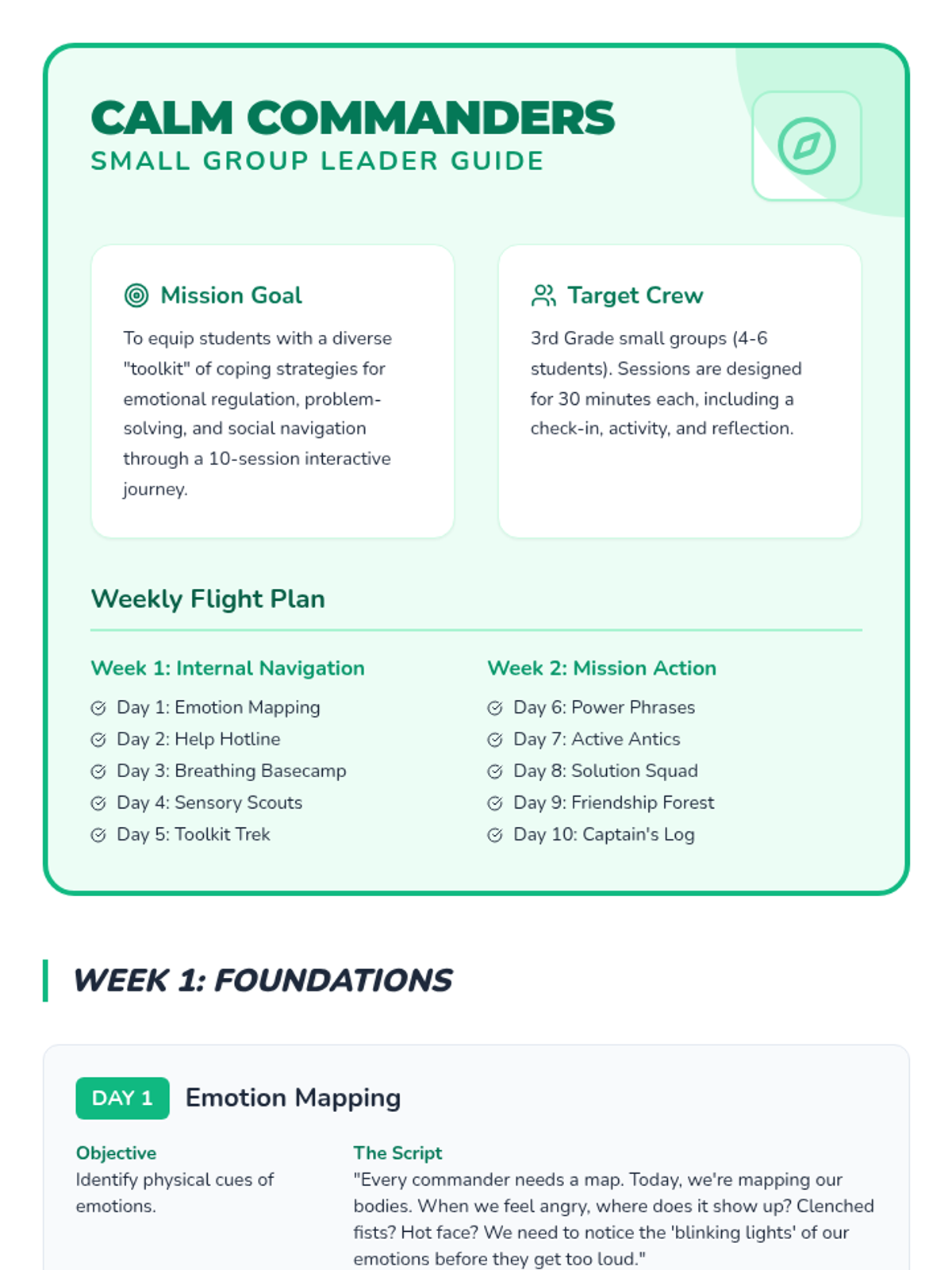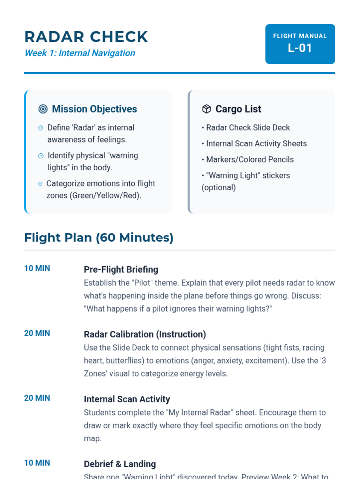 A 5-week emotional regulation and social skills program designed for boys, using a flight navigation theme to teach emotional awareness, calming techniques, and conflict resolution.