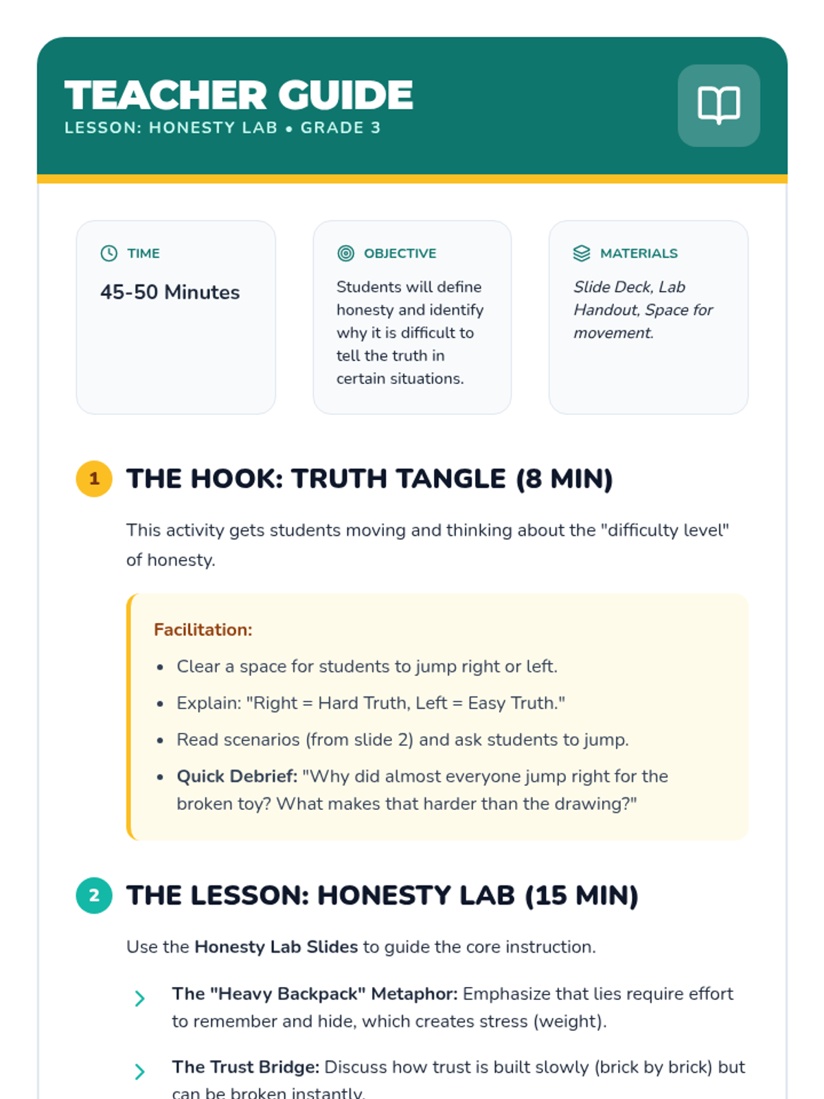 A multi-grade progression (3rd-5th) exploring honesty, integrity, and accountability. Students move from basic truth-telling to navigating complex social ethics and building community trust.