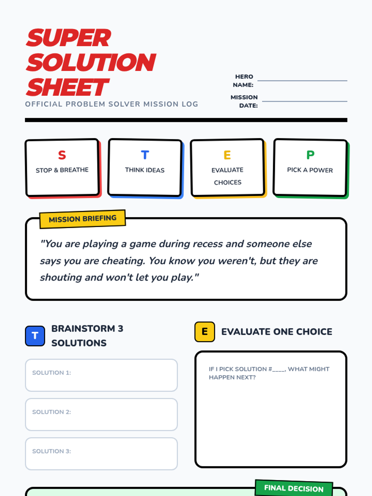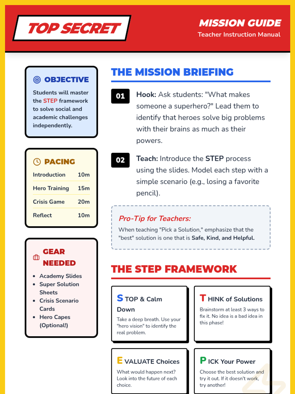 A comprehensive lesson sequence designed to teach 3rd graders a practical problem-solving framework using a superhero theme. Students learn the 'STEP' method to identify, brainstorm, evaluate, and act on everyday challenges.