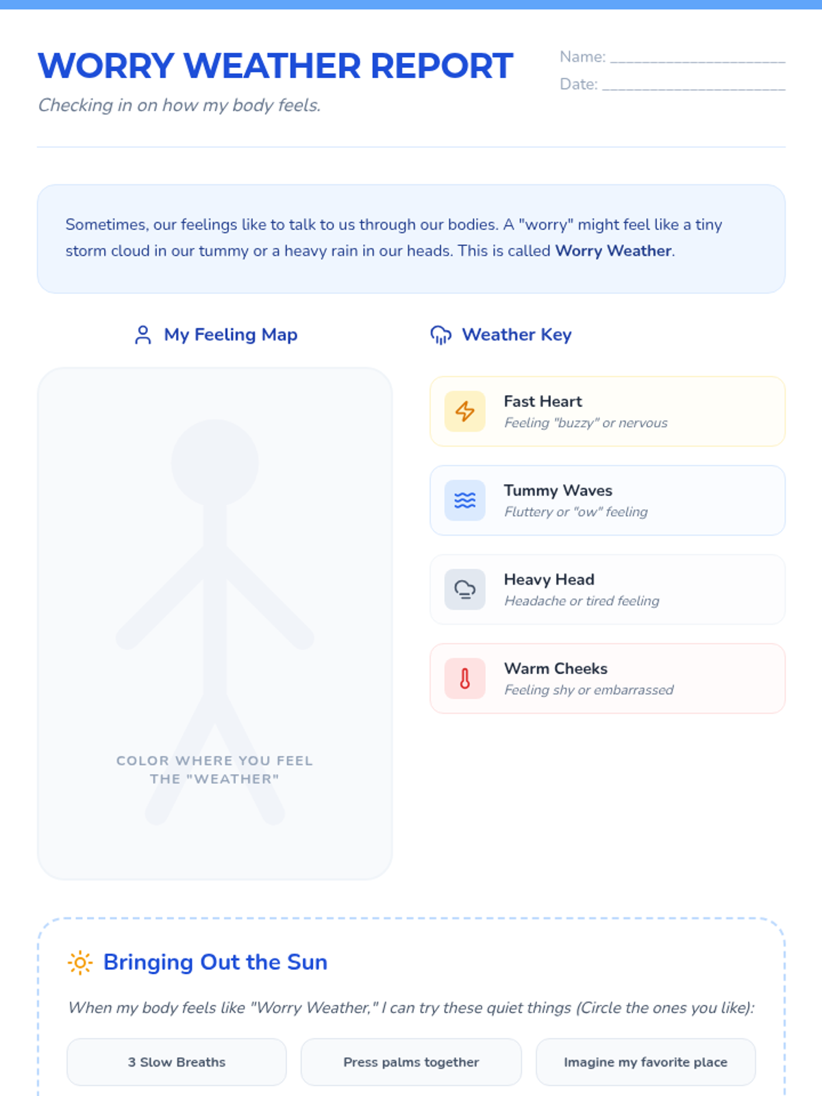 A two-session psychoeducation sequence for 3rd graders designed to normalize worries and introduce the 'Worry Box' as a tool for emotional regulation and communication. Students learn to identify physical and mental signs of worry, name their trusted adults, and practice externalizing their concerns through writing and drawing.