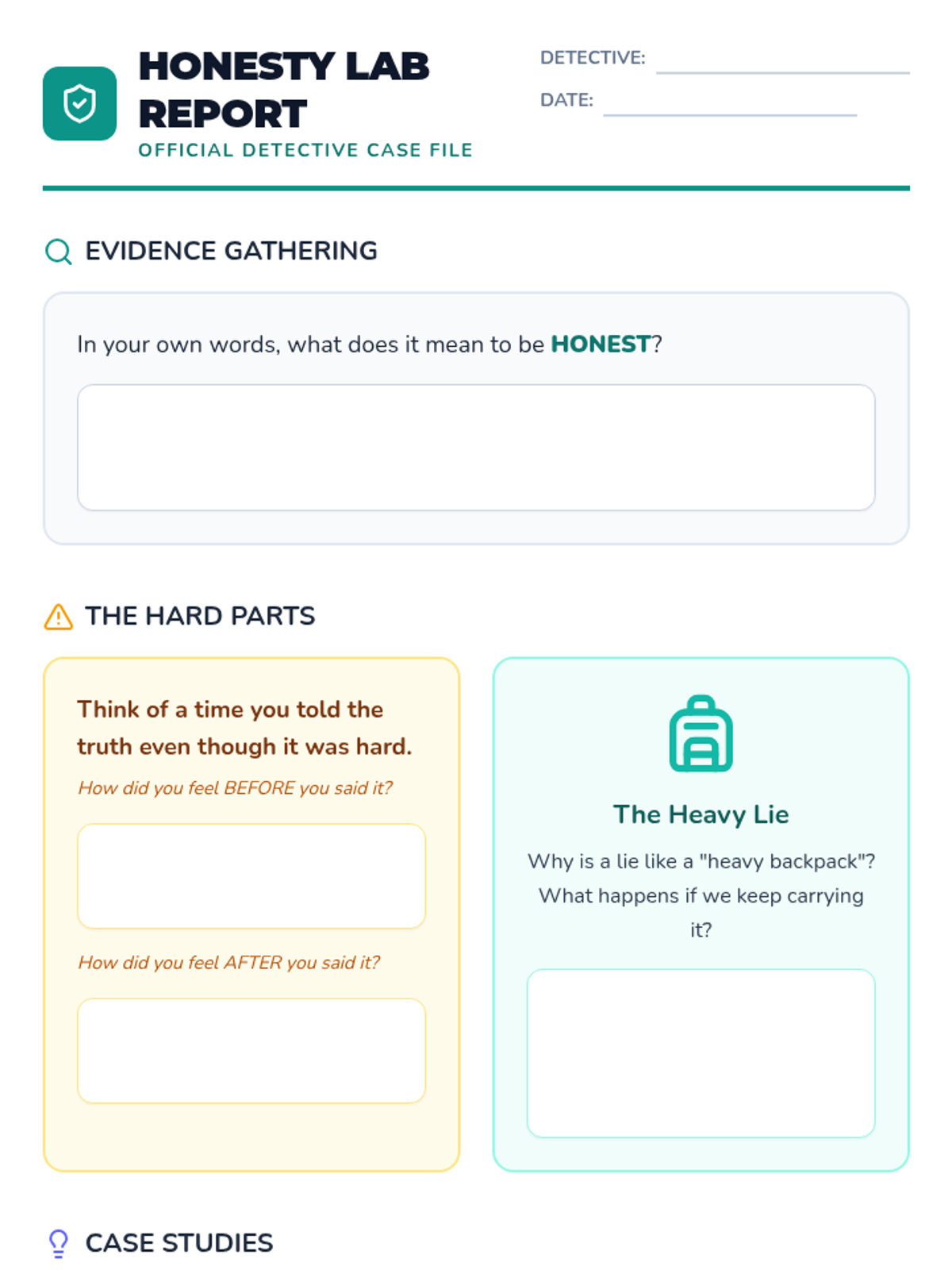 A 3-lesson SEL unit for Grades 3-5 focused on honesty, understanding the impact of stealing, and developing strategies to resist temptation. Students act as 'Integrity Investigators' to solve cases involving social-emotional dilemmas.