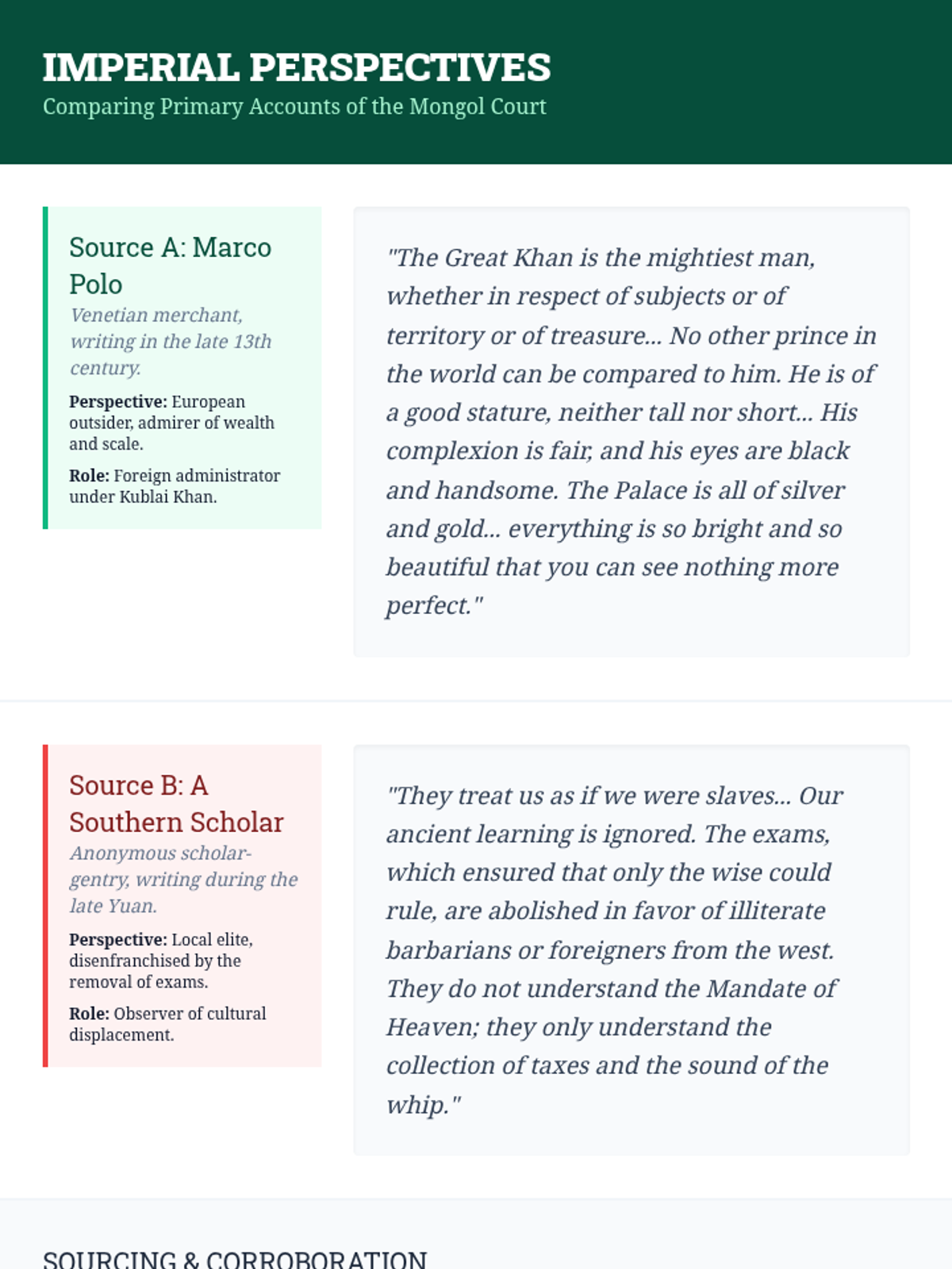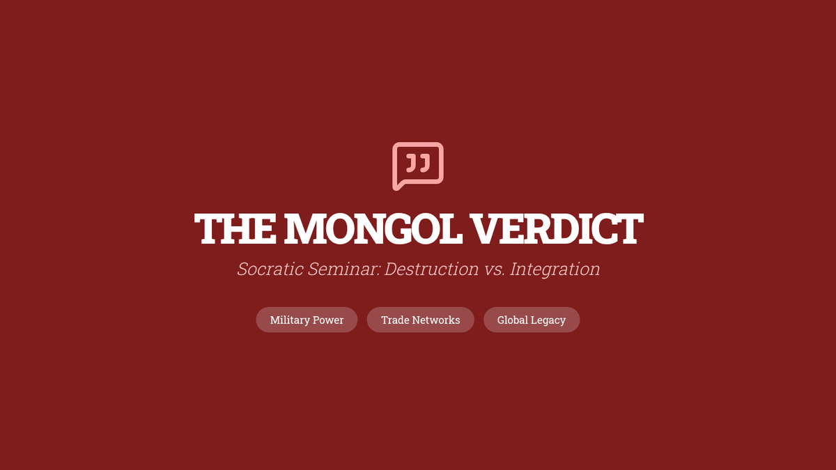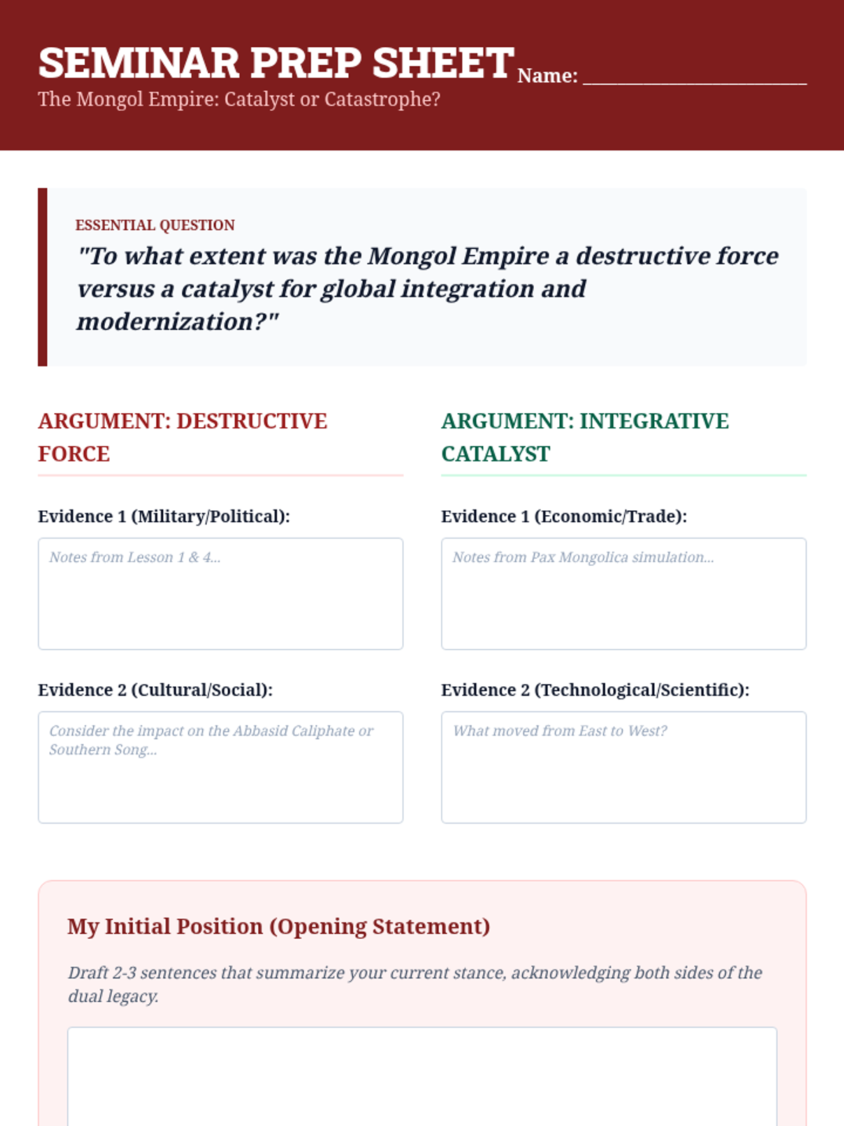 This sequence investigates the rise of the Mongol Empire and its dual legacy of destruction and connection. Students move beyond the stereotype of 'barbarian hordes' to analyze the sophisticated administration, military tactics, and trade networks (Pax Mongolica) established by Genghis and Kublai Khan, culminating in a student-led seminar evaluating historical revisionism regarding the Mongols' role in world history.