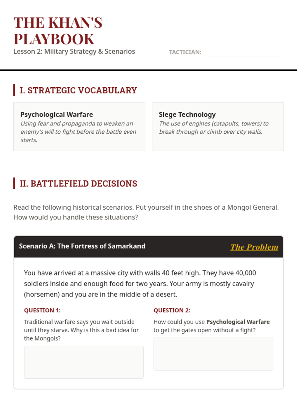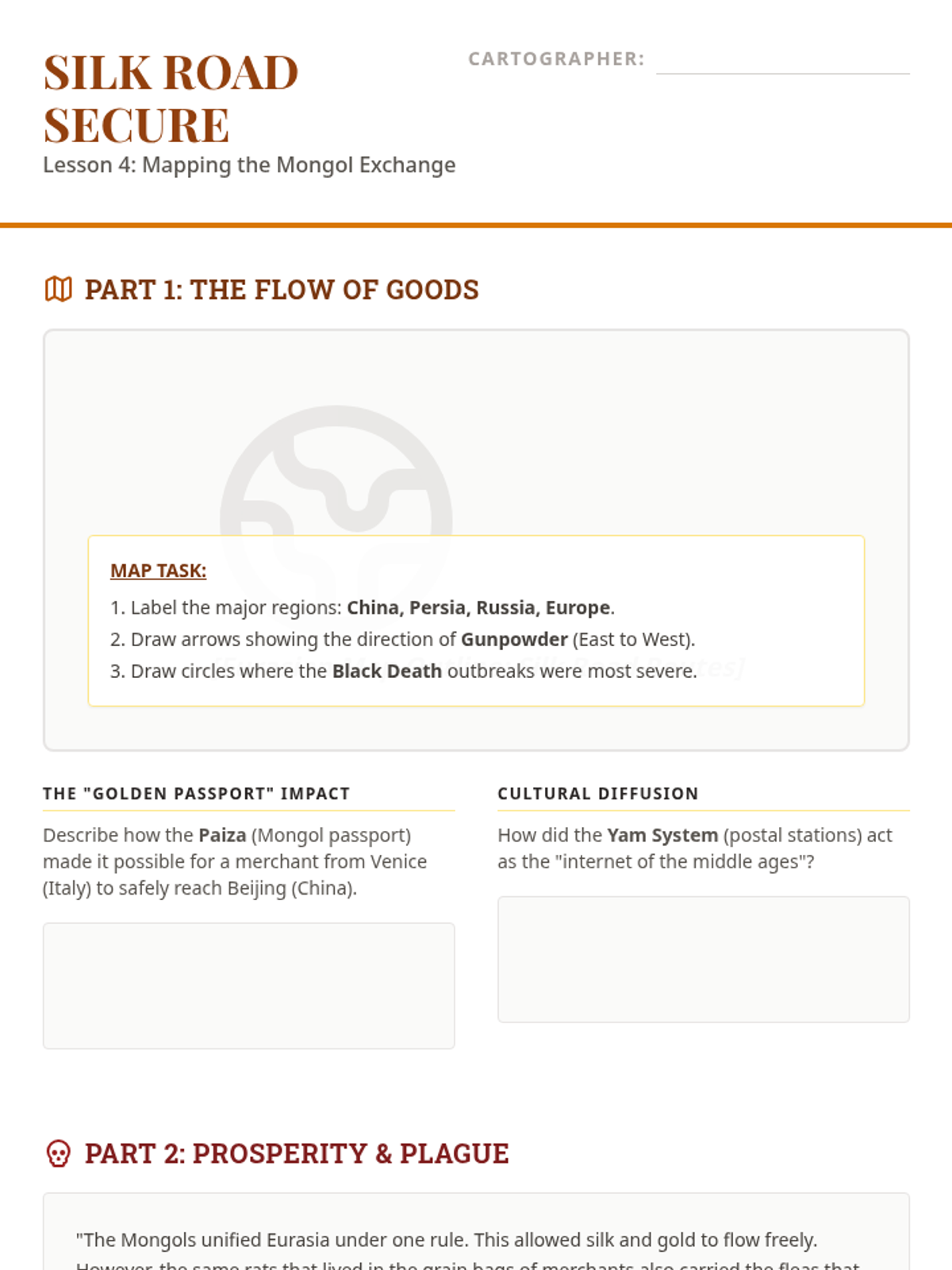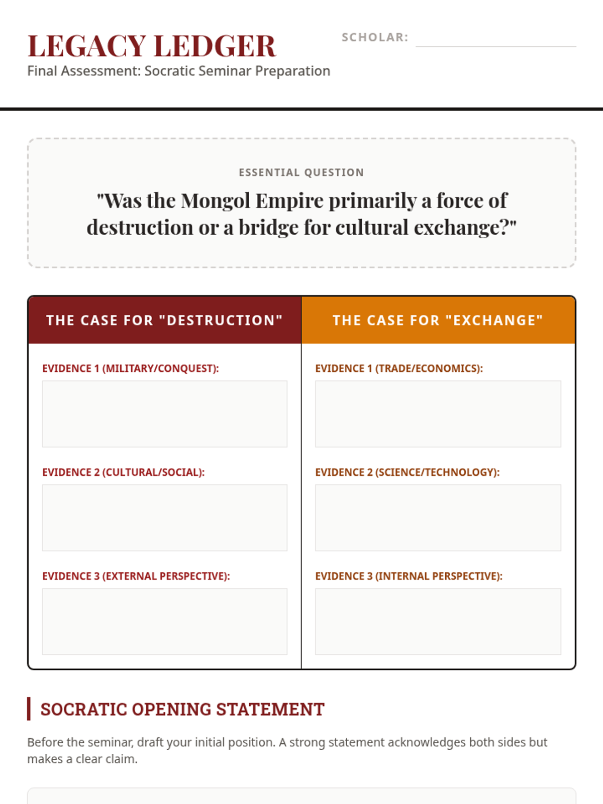 A 5-lesson unit exploring the Mongol Empire's rise, military tactics, governance of China, and long-term impact on global trade and culture. Students analyze the tension between the empire's destructive origins and its constructive legacy as a bridge between East and West.