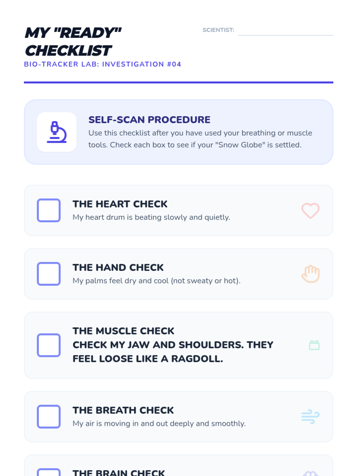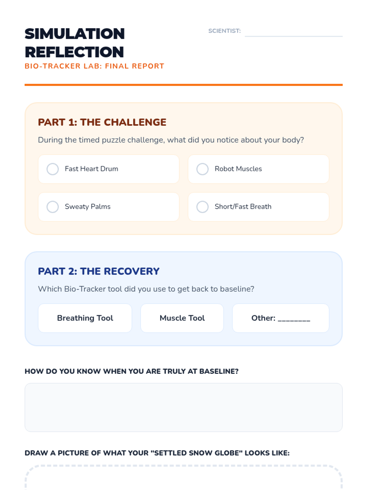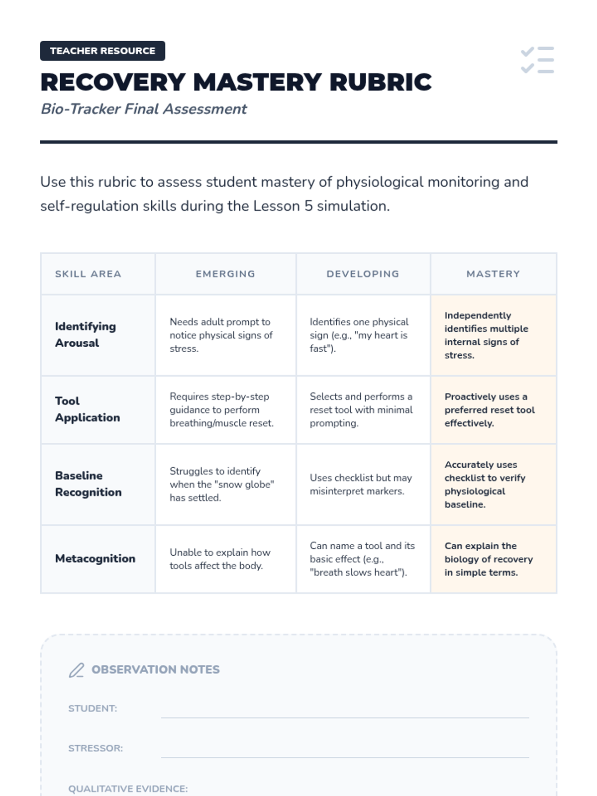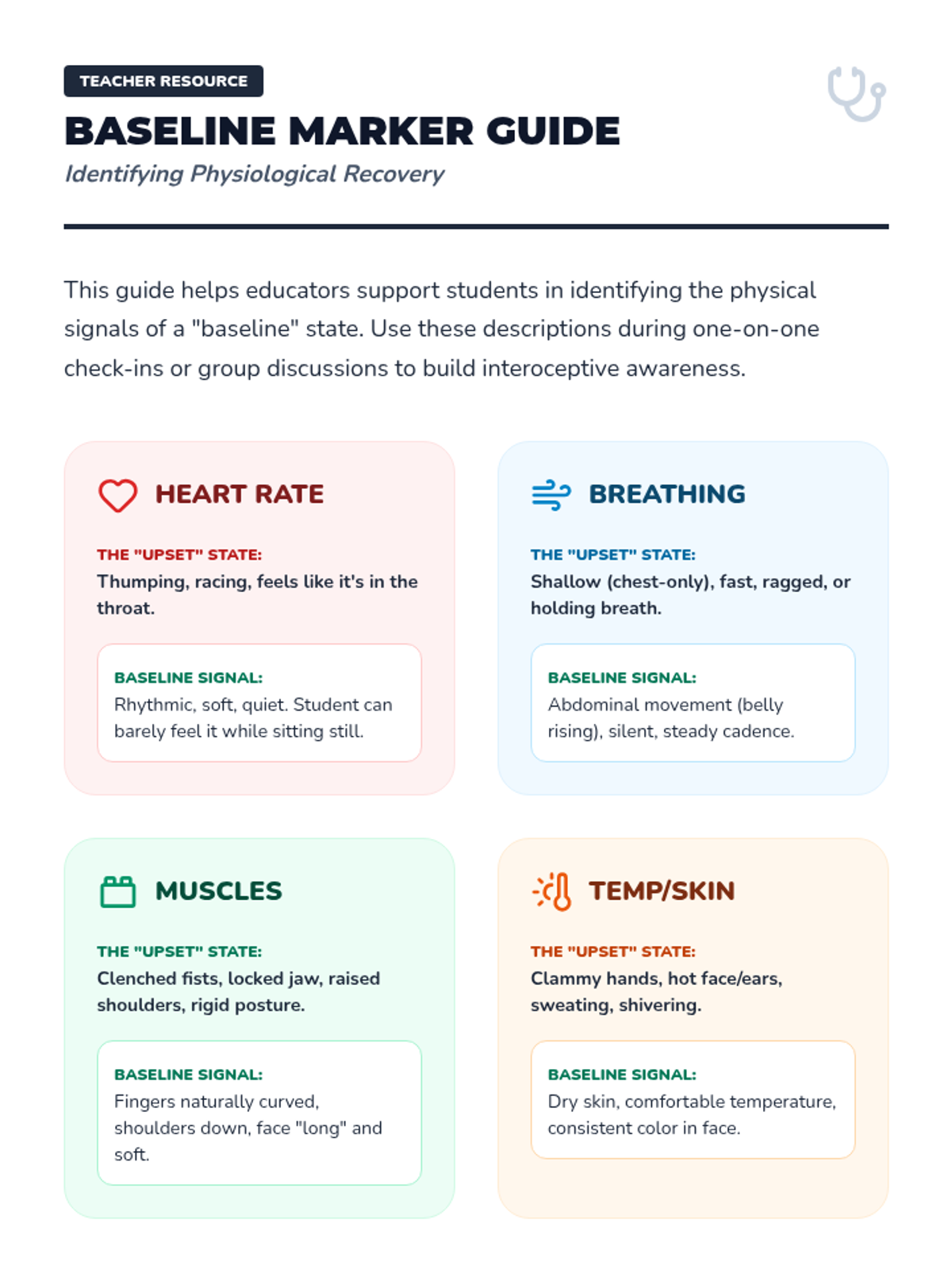 An inquiry-based sequence where students investigate the internal biology of dysregulation and recovery, focusing on heart rate, muscle tension, and breath to identify their physiological baseline.