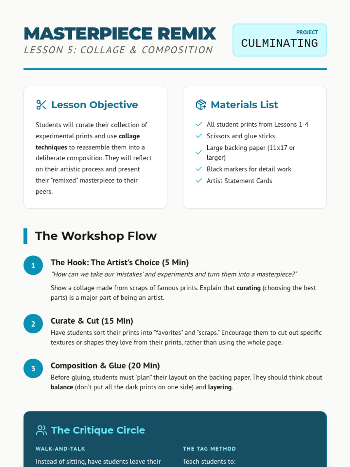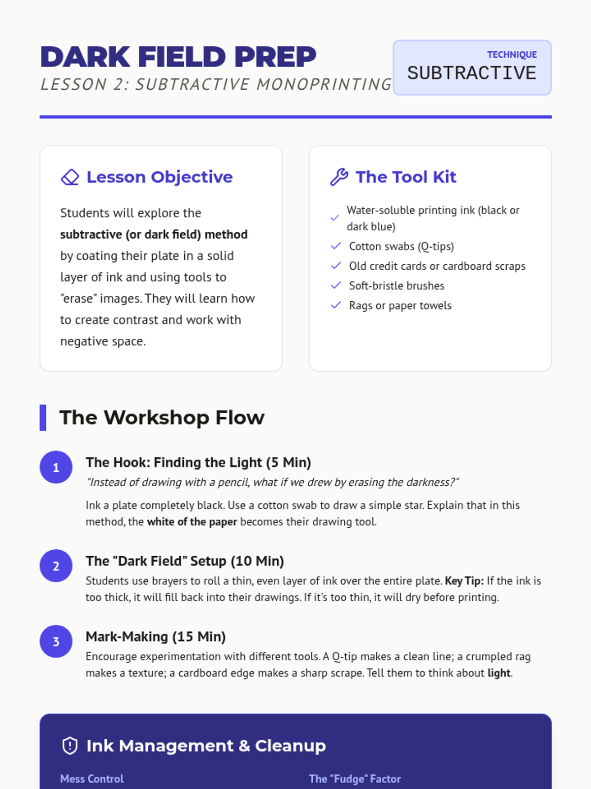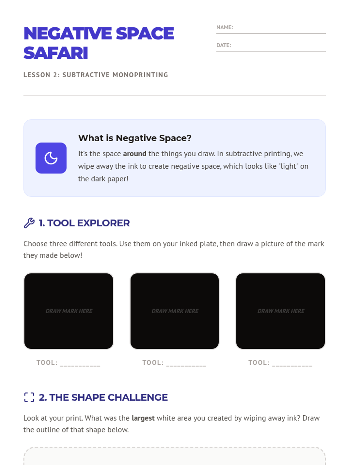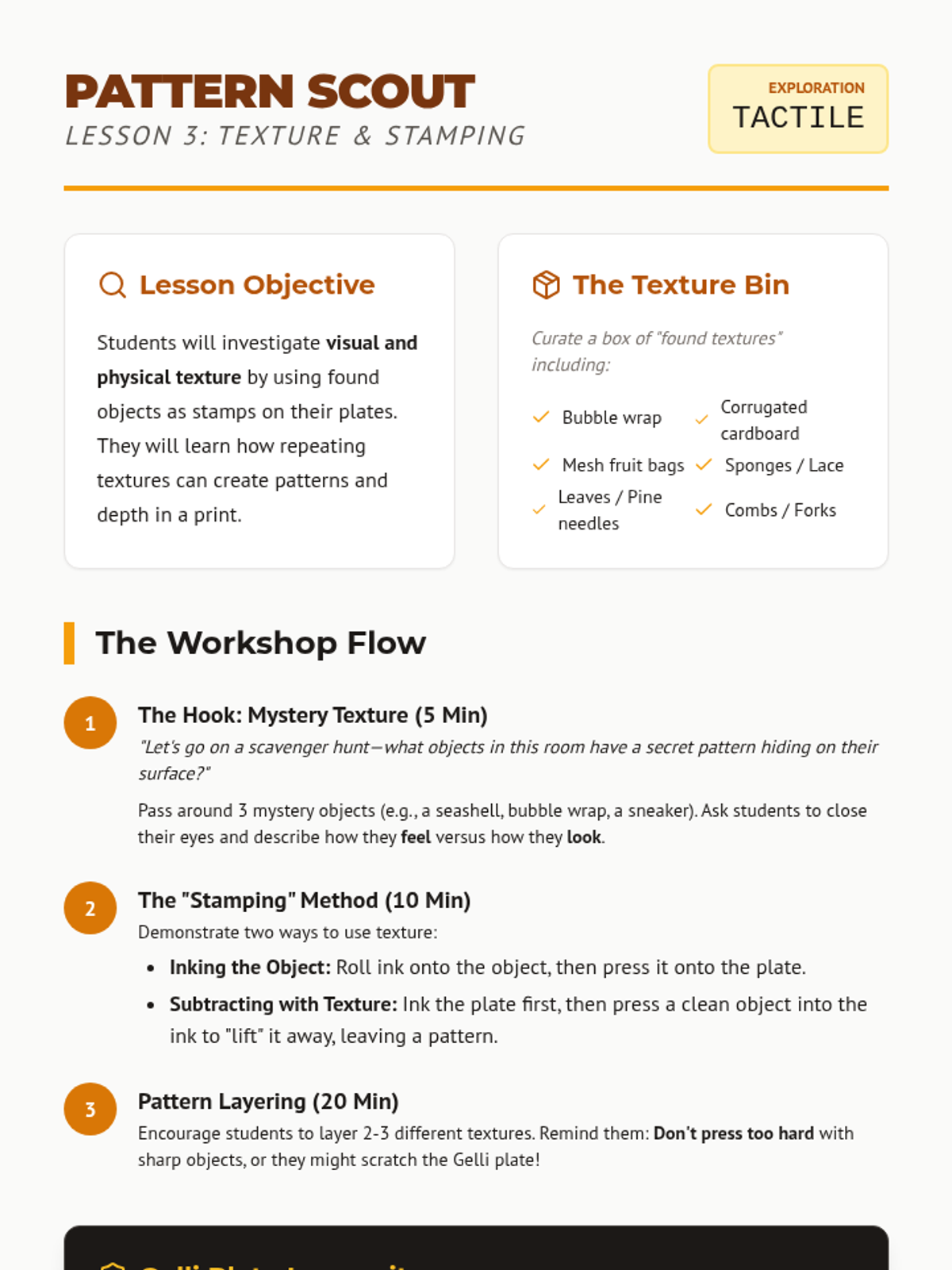 An inquiry-based exploration of monoprinting for 3rd graders, focusing on additive and subtractive methods, texture discovery, and trace techniques using Gelli plates or plexiglass. Students move from experimental mark-making to a final mixed-media collage, learning that every print is a unique 'one-of-a-kind' impression.