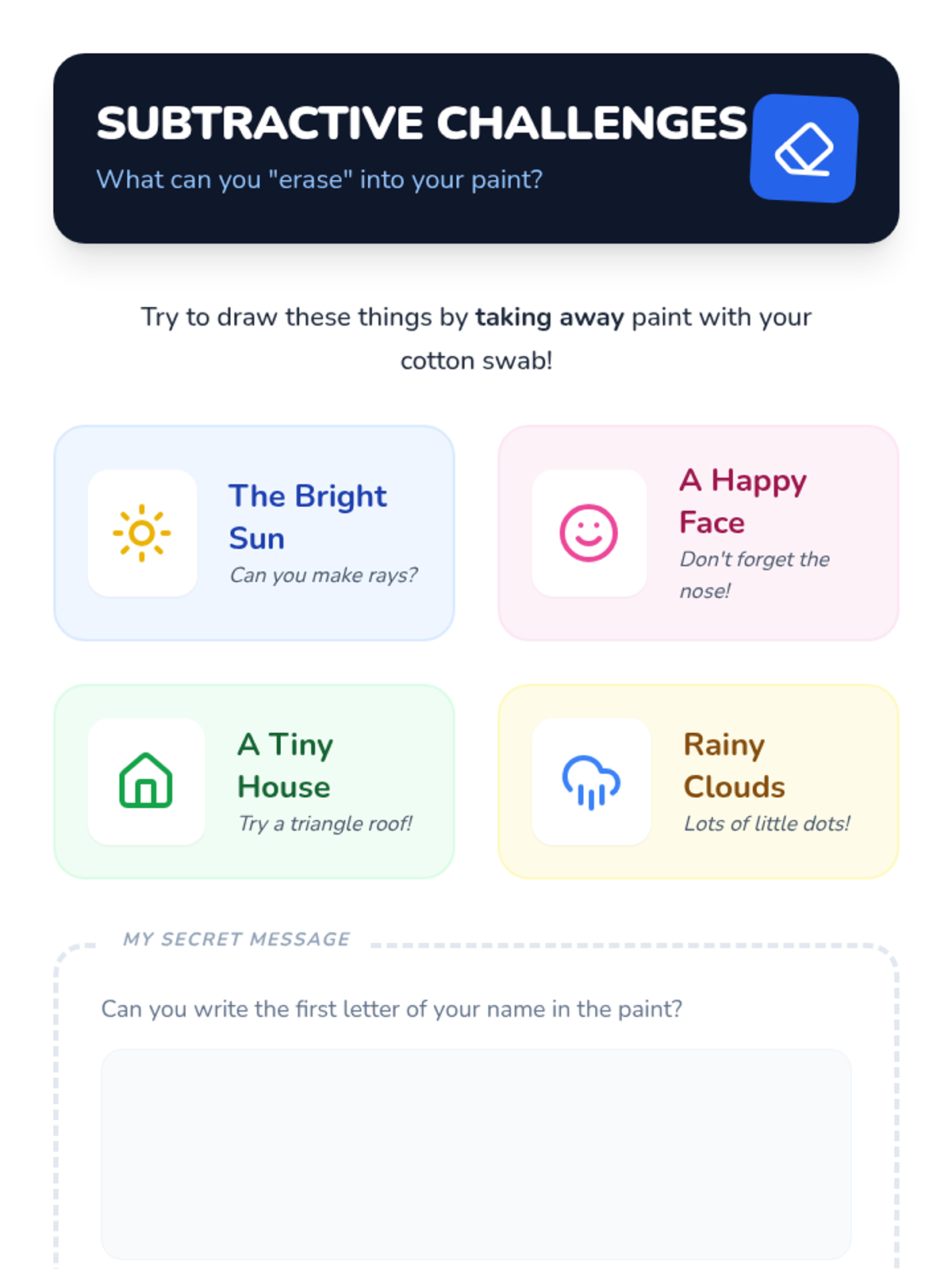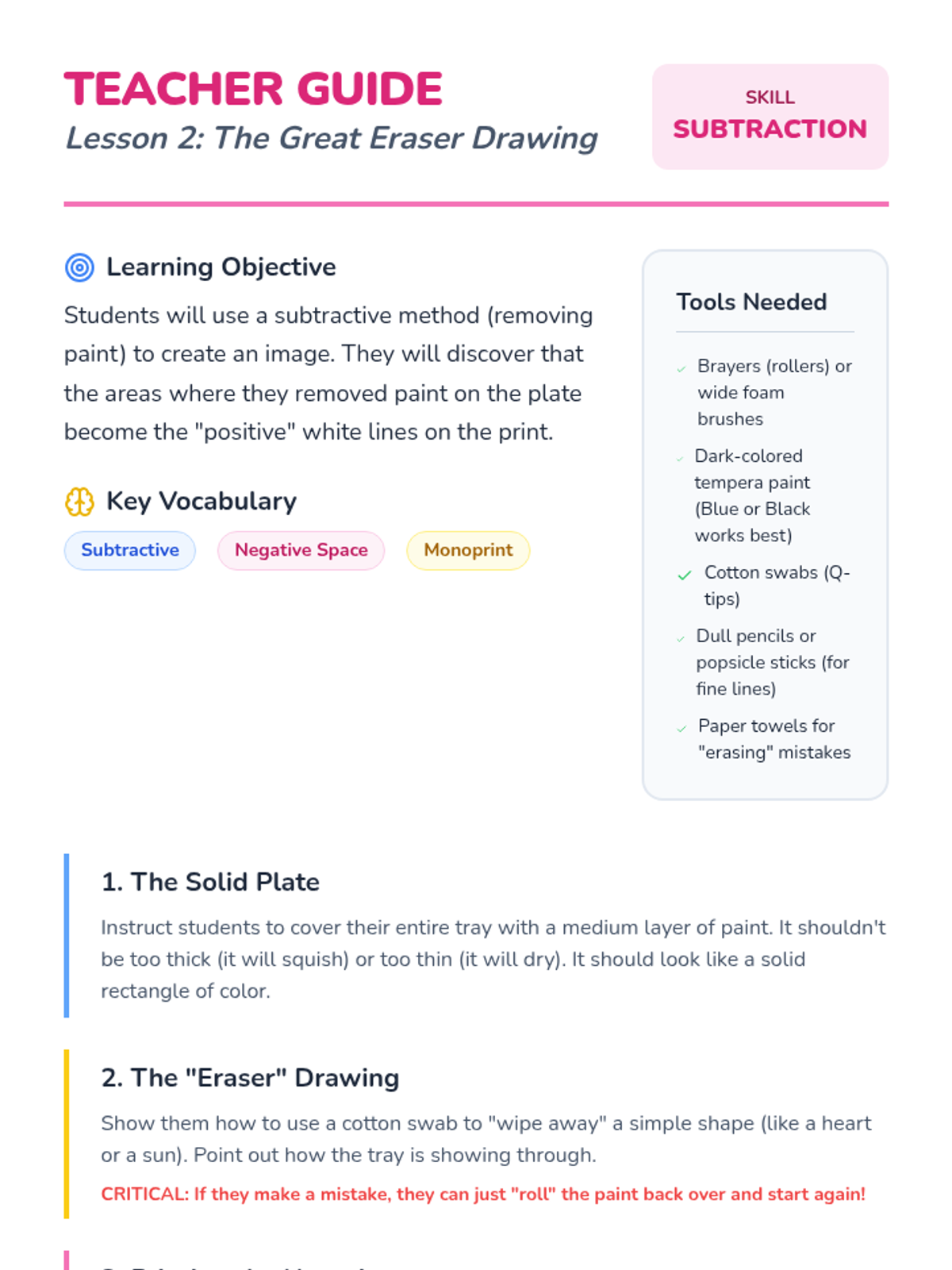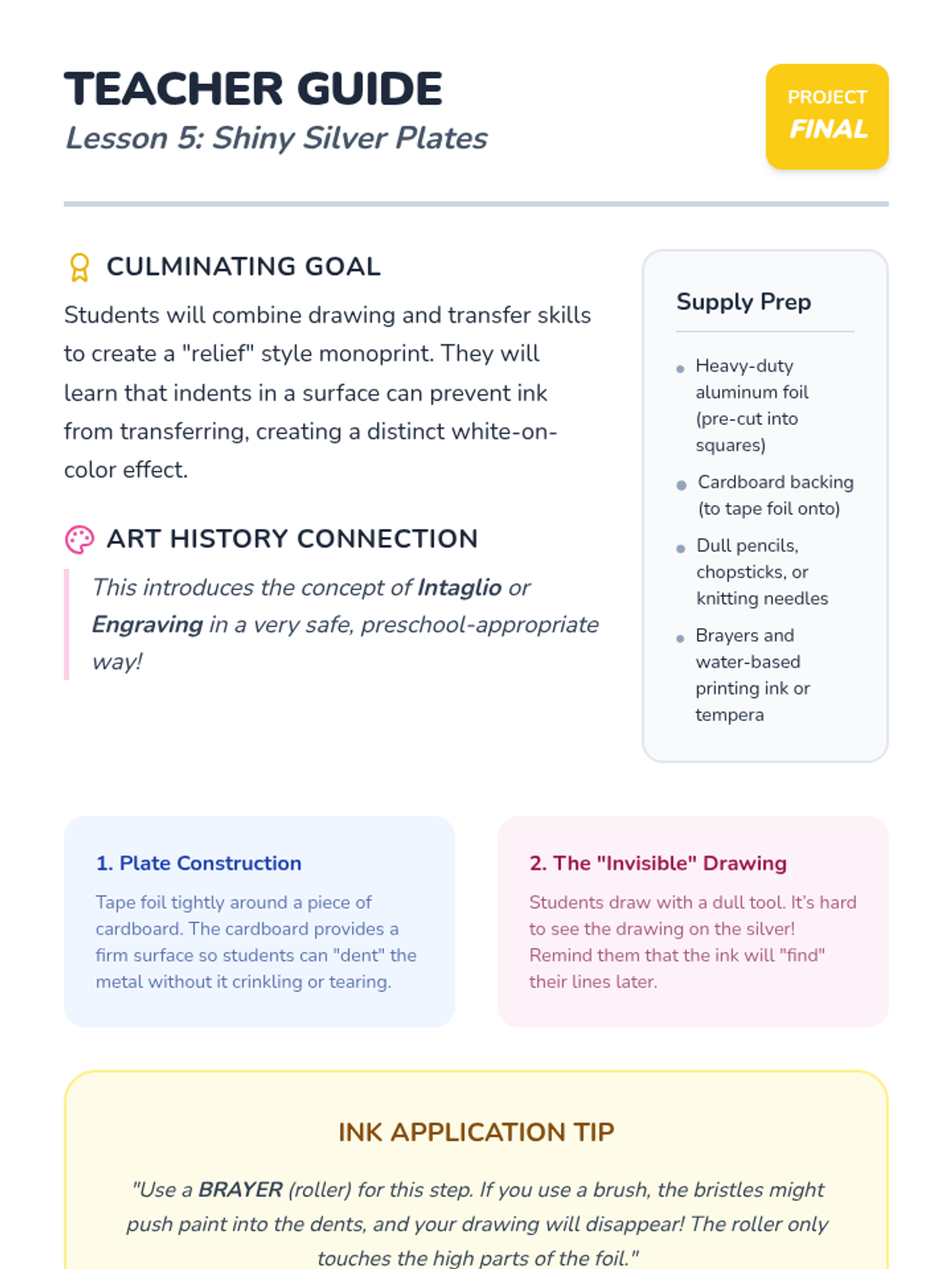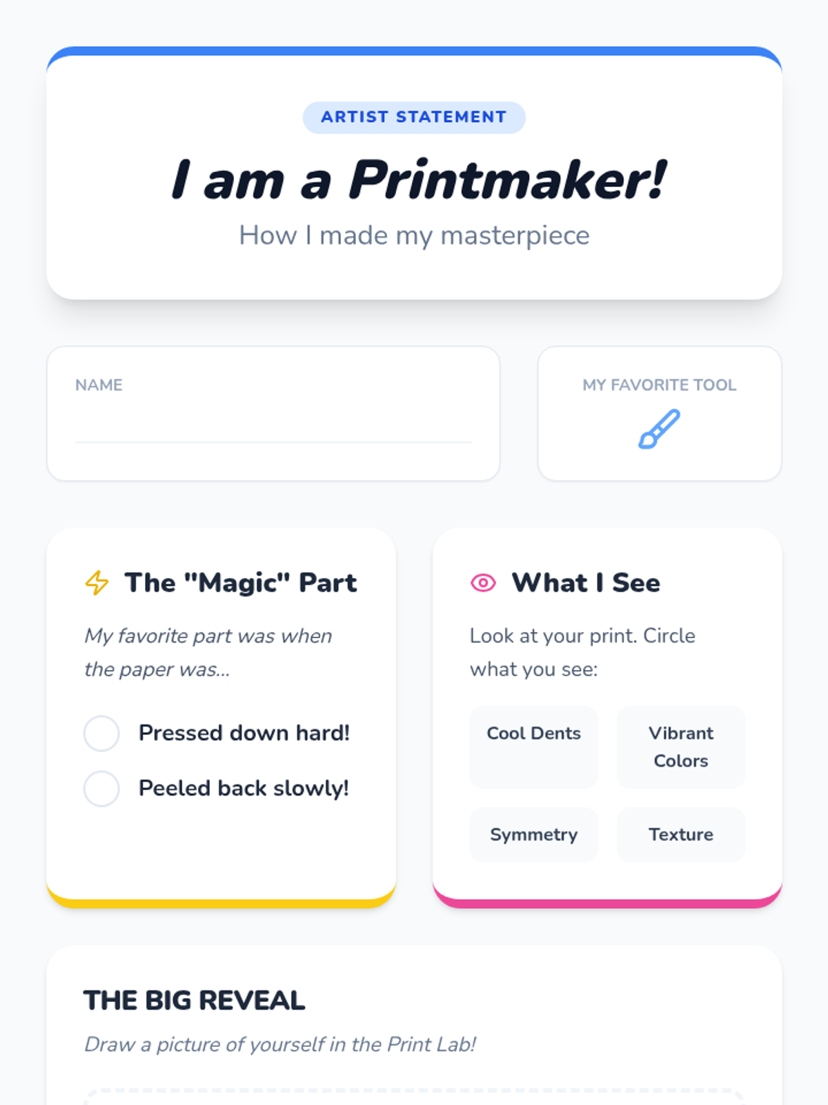 A comprehensive introduction to printmaking for Kindergarteners, focusing on monoprinting, subtractive drawing, symmetry, texture rubbings, and foil plate processes. Students learn the 'magic' of transfer and the relationship between a plate and a print.