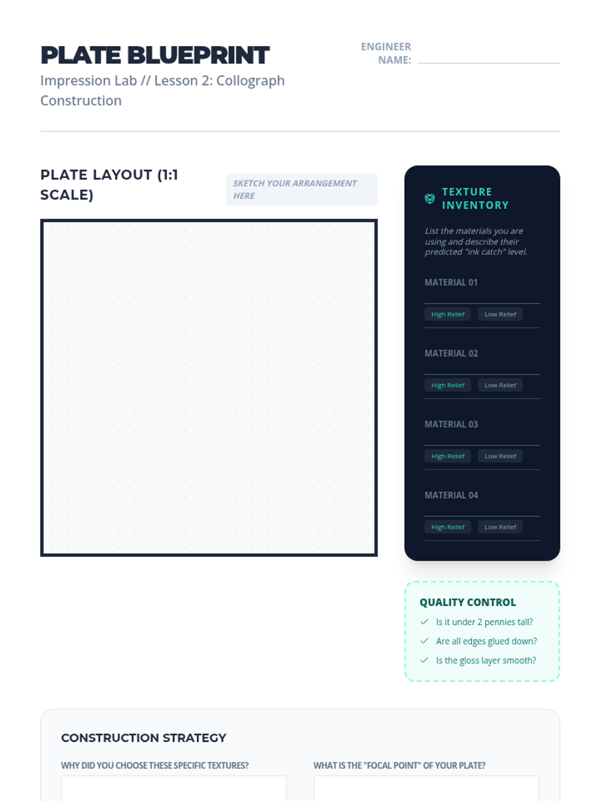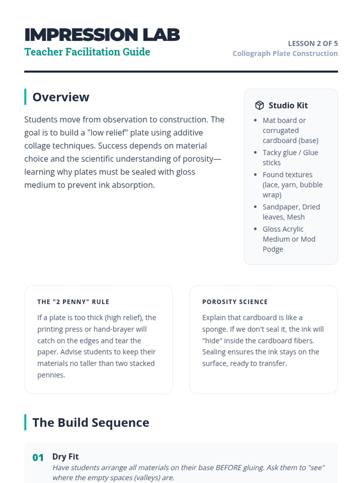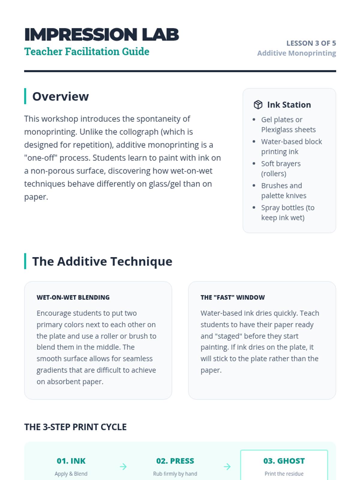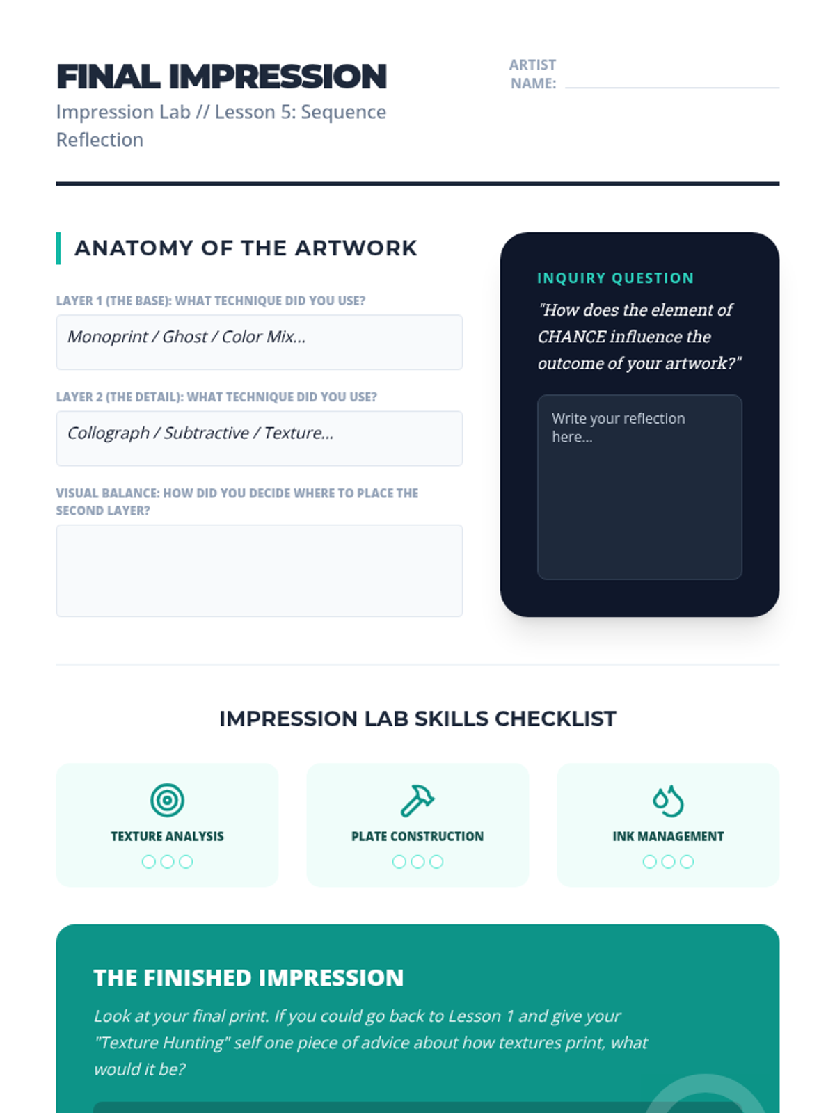 An inquiry-based exploration of monoprinting and collography for 6th-grade students, focusing on the element of chance, tactile textures, and the difference between relief and unique prints.