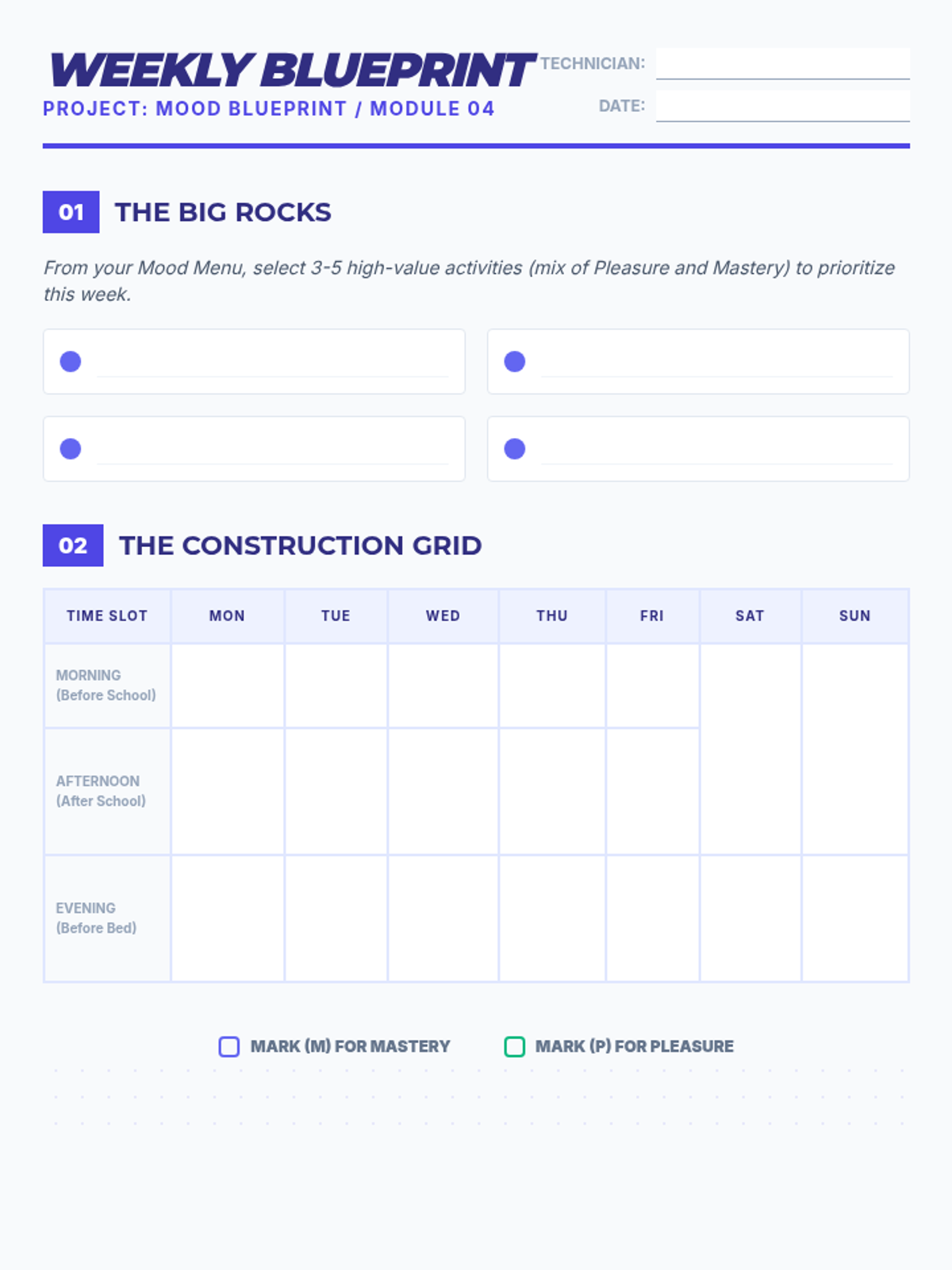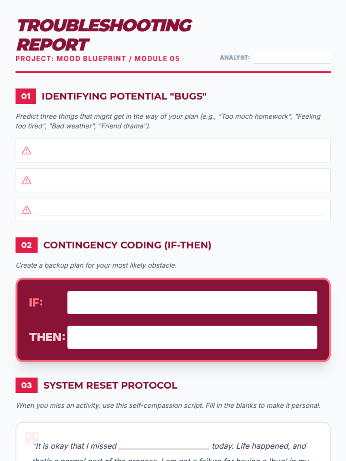 A 5-lesson series for 8th graders to design personalized behavioral activation plans. Students learn to balance pleasure and mastery, create activity menus, set micro-goals, and troubleshoot barriers to build a sustainable mood-boosting routine.