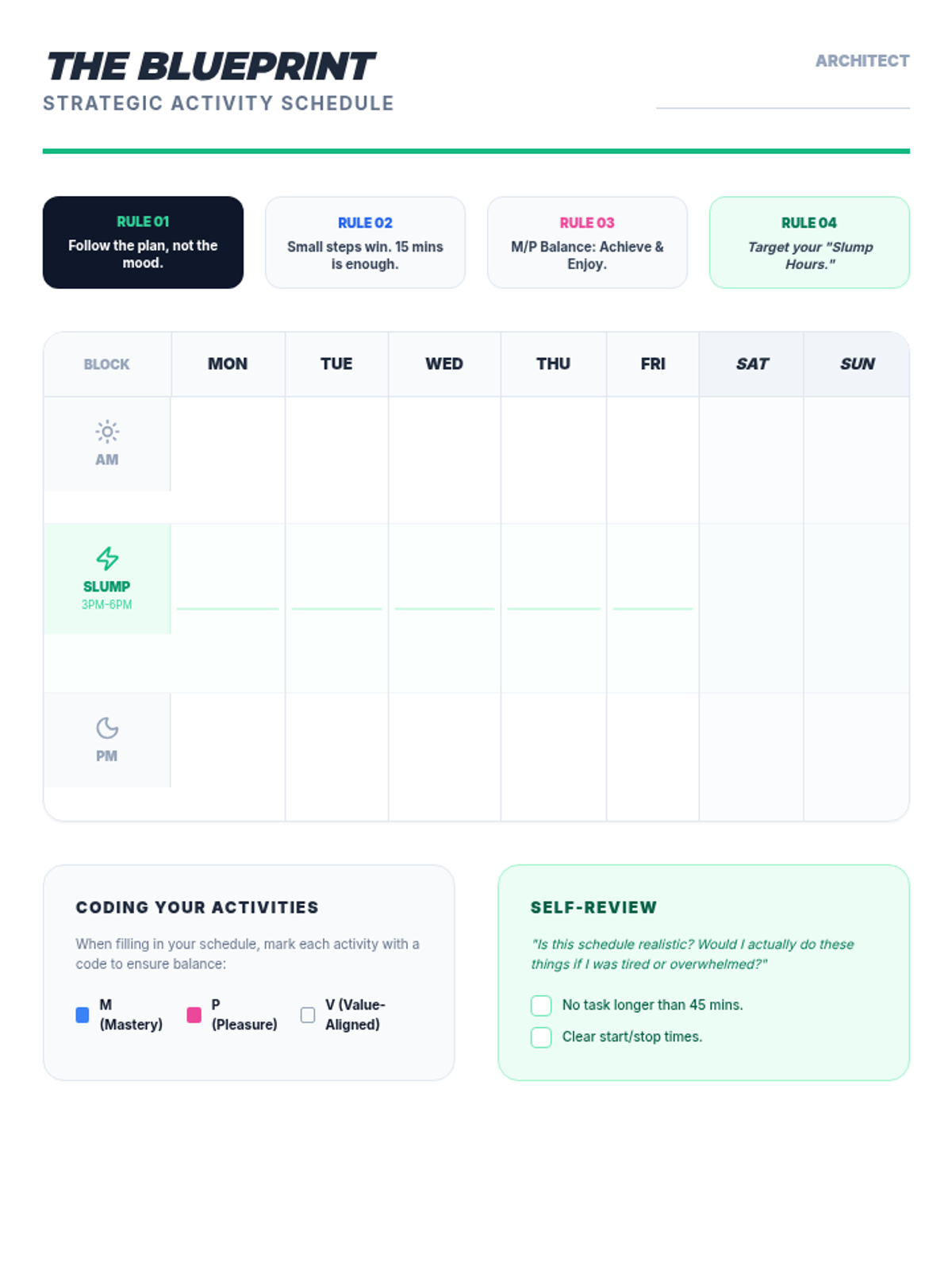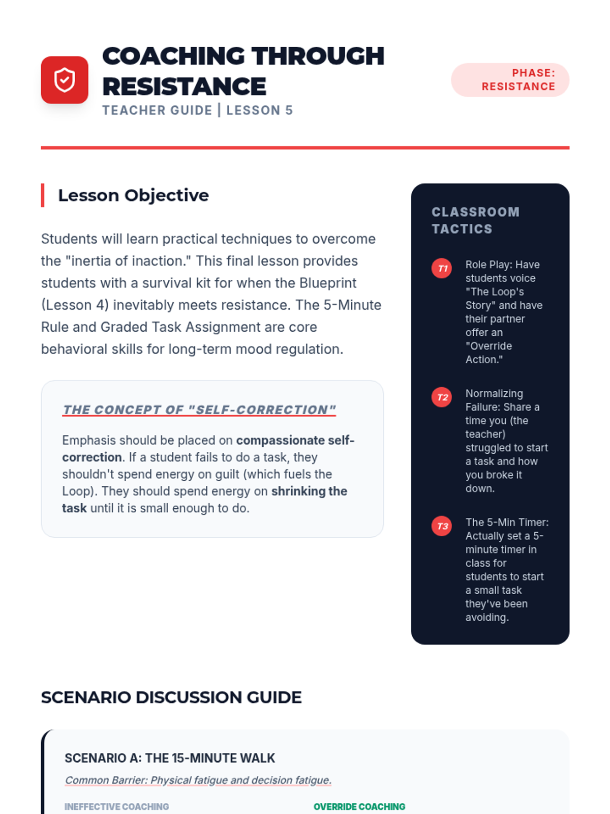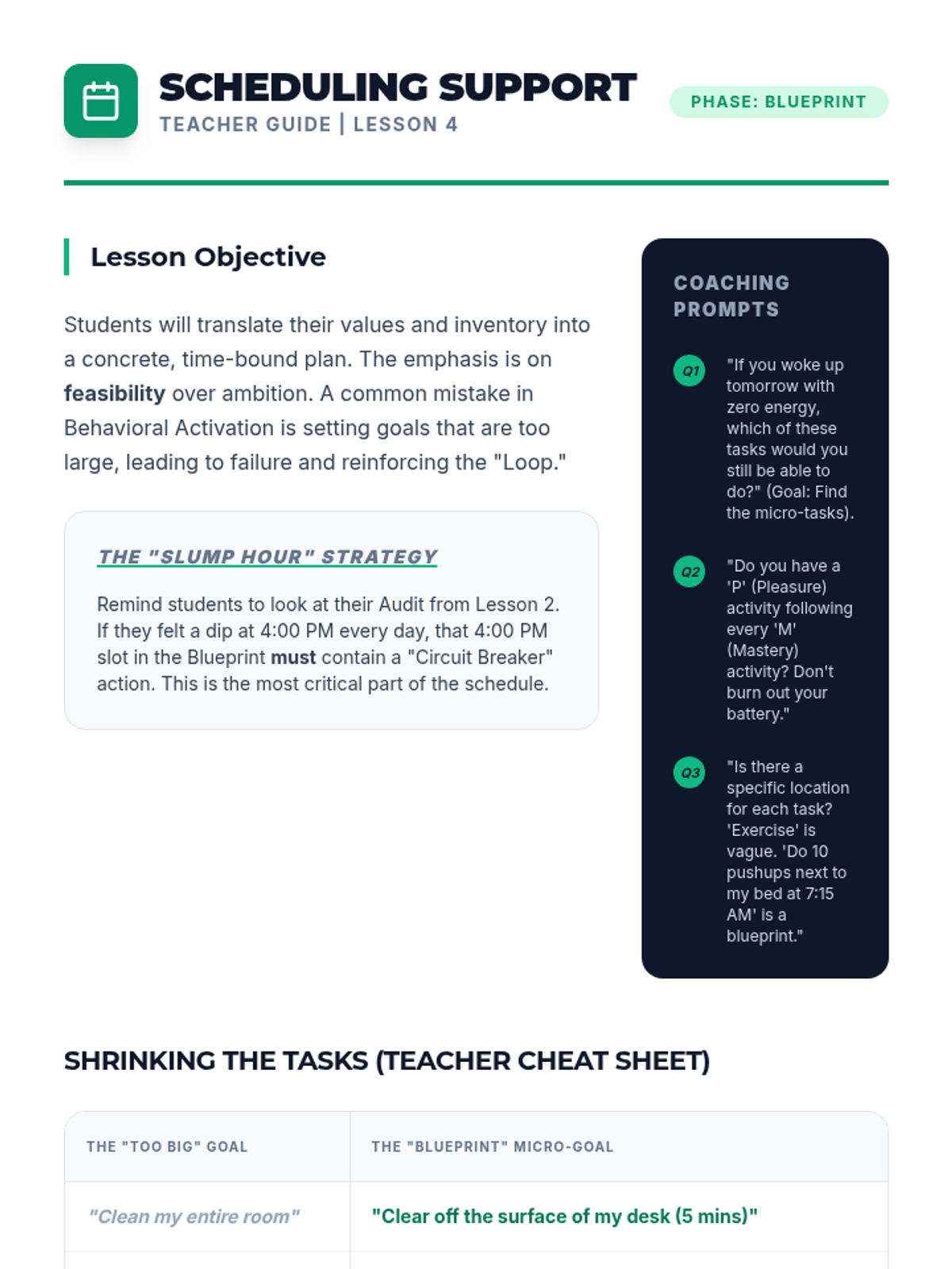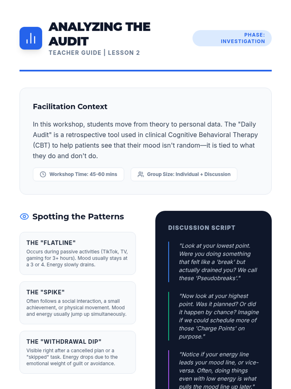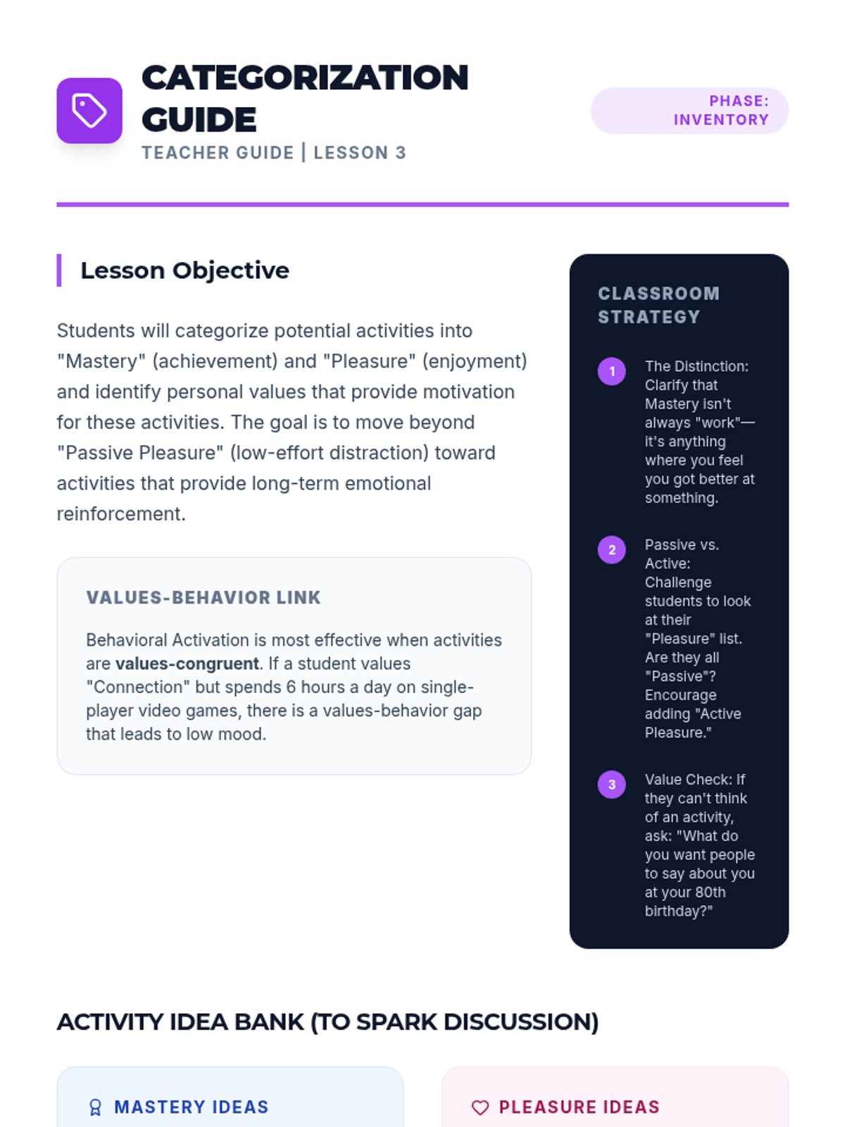 This sequence guides 11th-grade students through Behavioral Activation, teaching them to audit their routines, categorize activities by mastery and pleasure, and design a personalized schedule to proactively manage their mood and mental well-being.