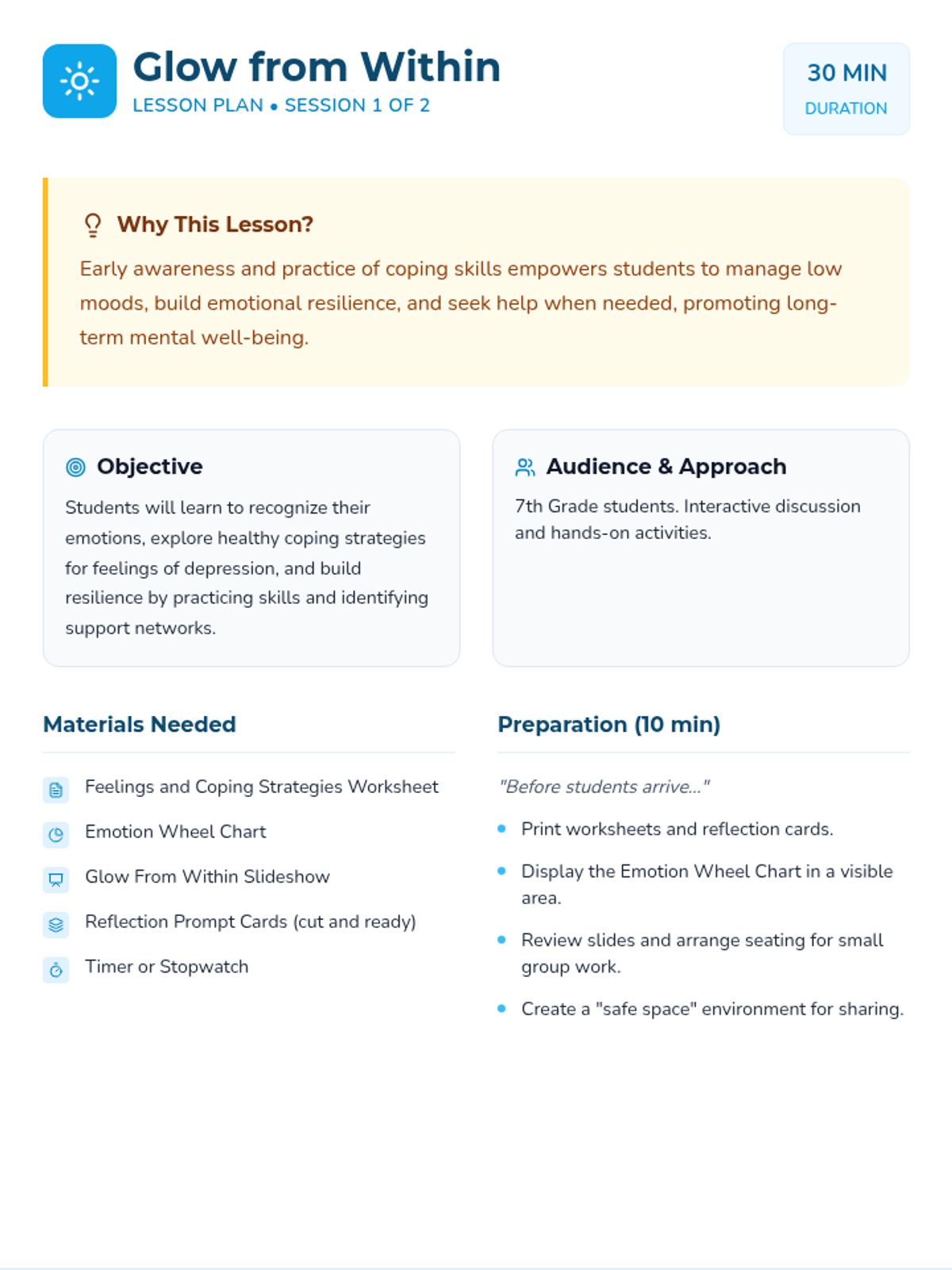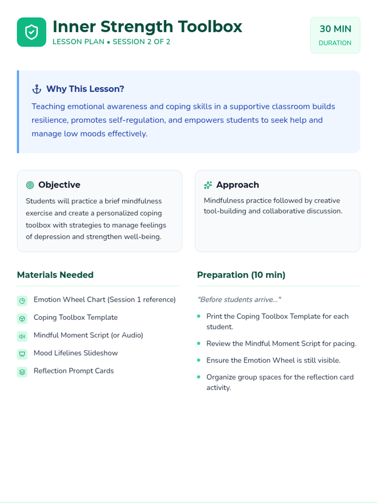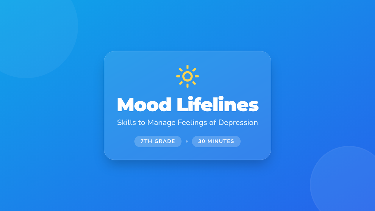 A two-part classroom-based series for 7th graders focused on emotional literacy, mindfulness, and the development of a personalized coping toolbox to manage low moods and build resilience.