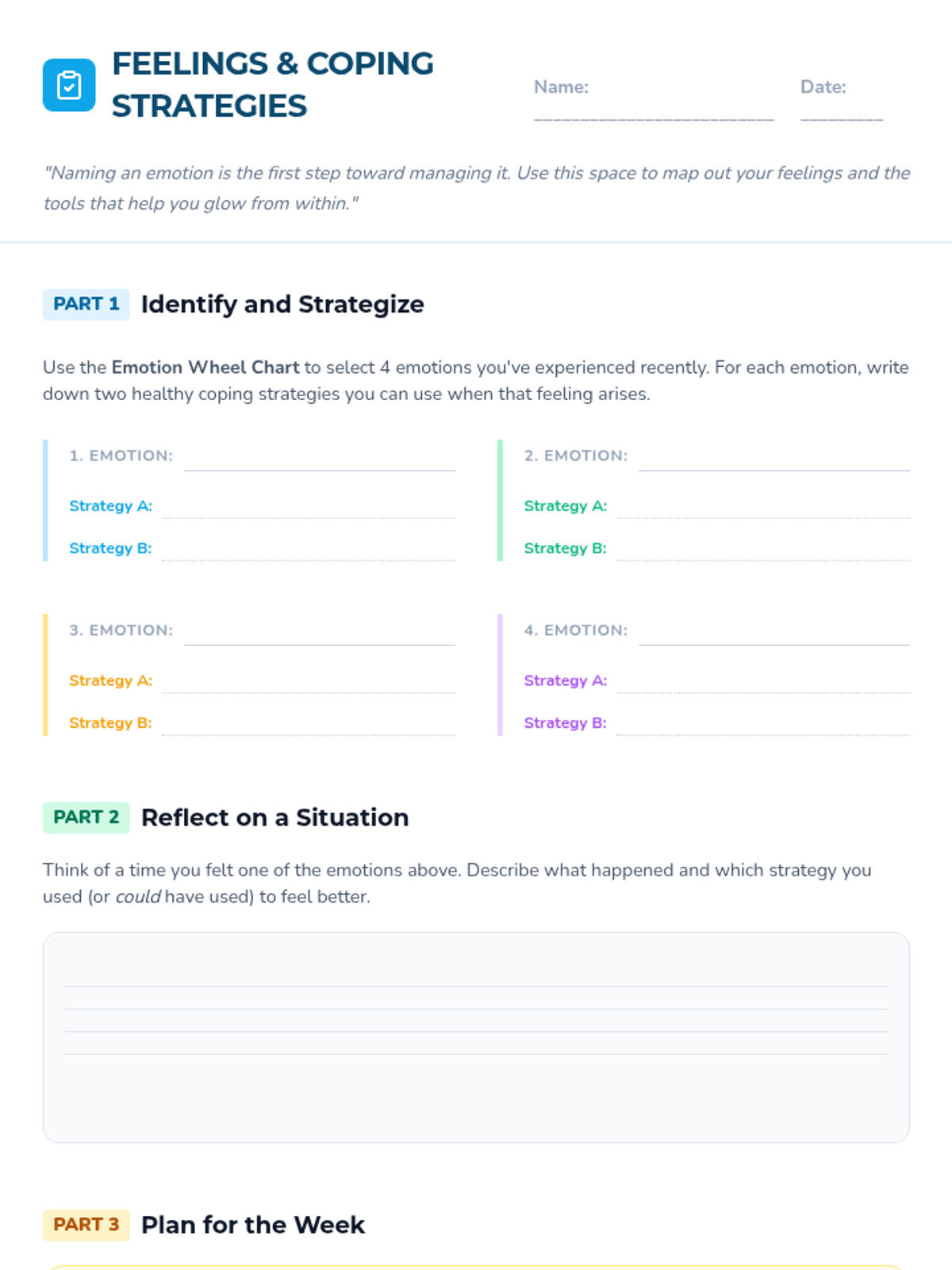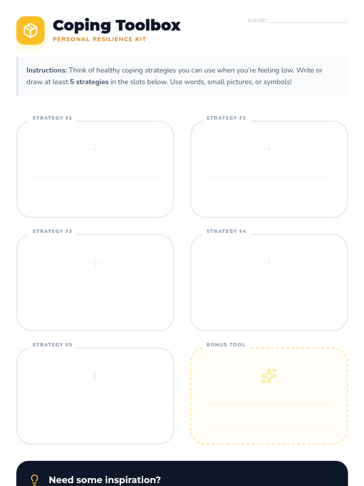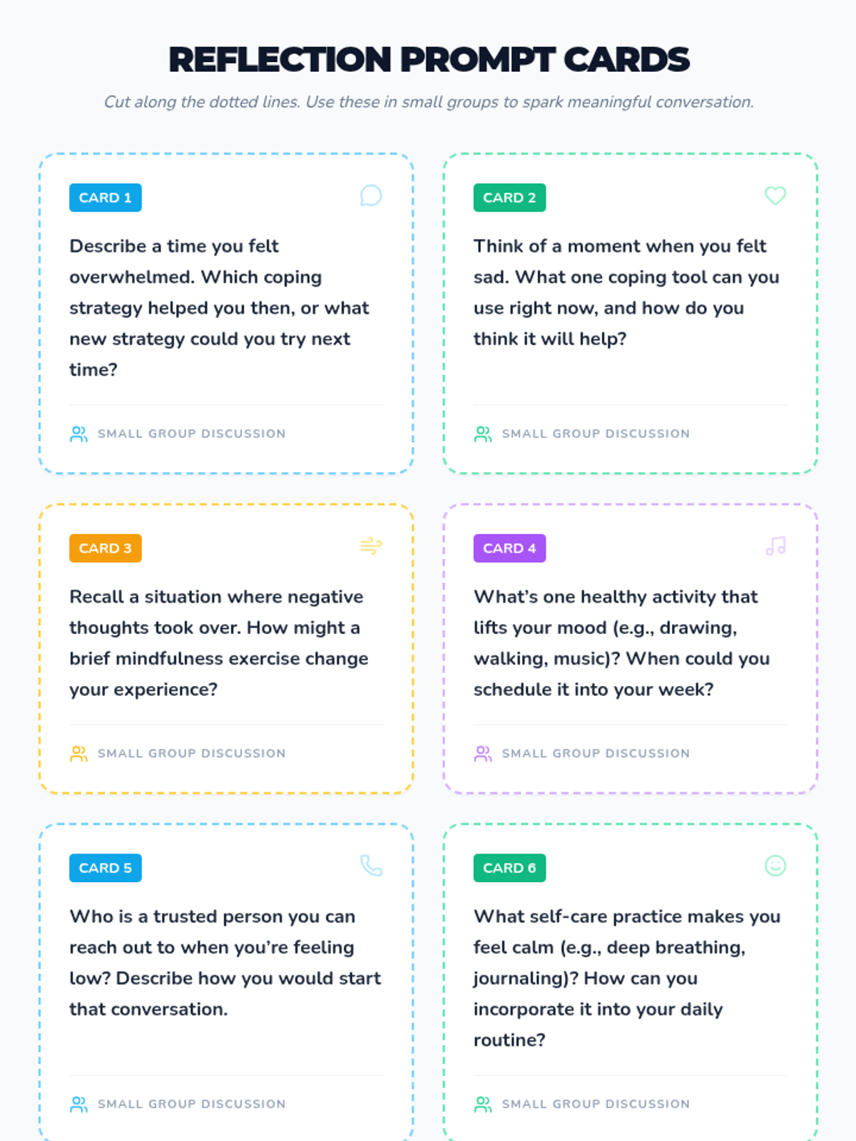 A two-part classroom-based series for 7th graders focused on emotional literacy, mindfulness, and the development of a personalized coping toolbox to manage low moods and build resilience.