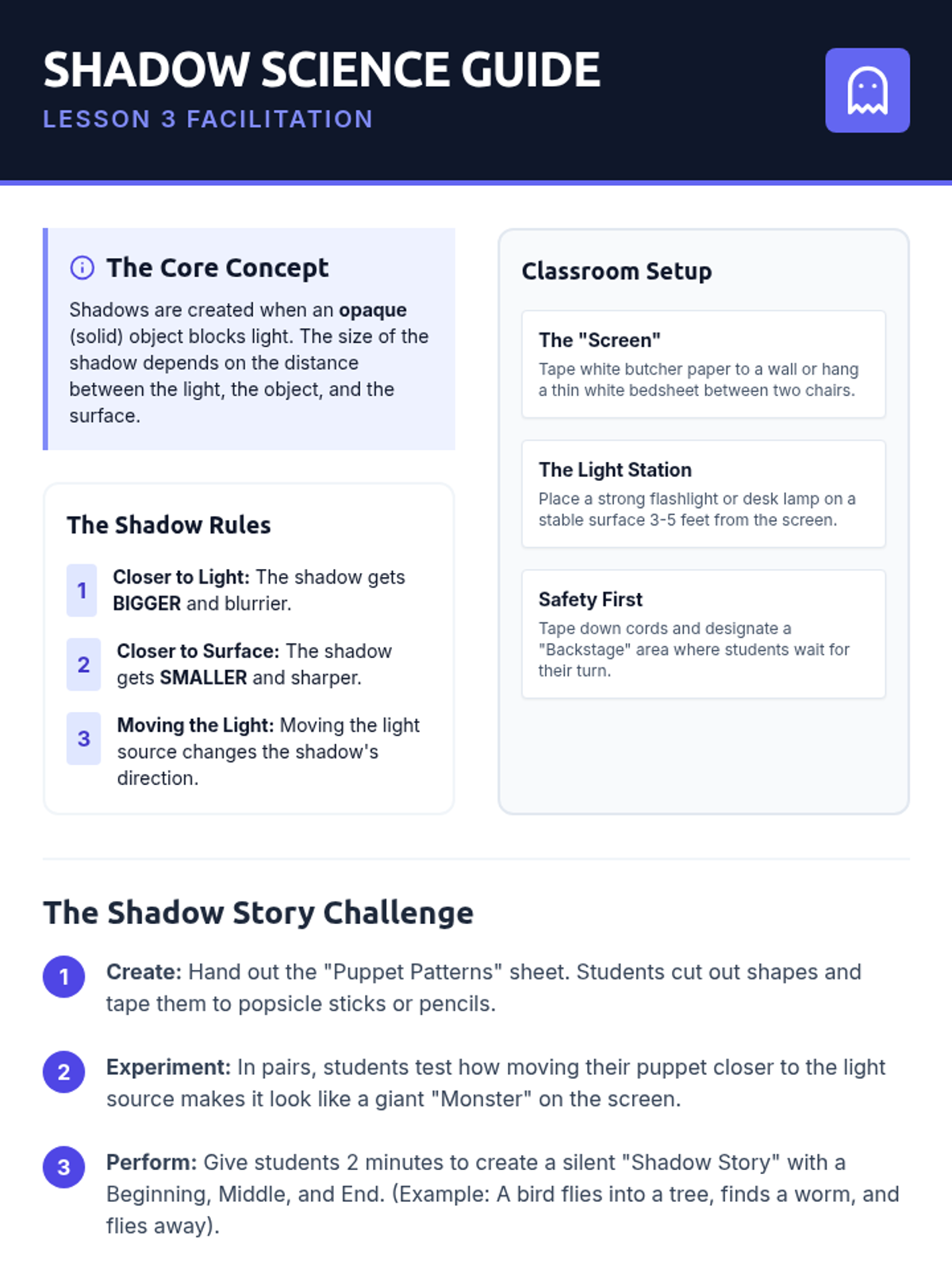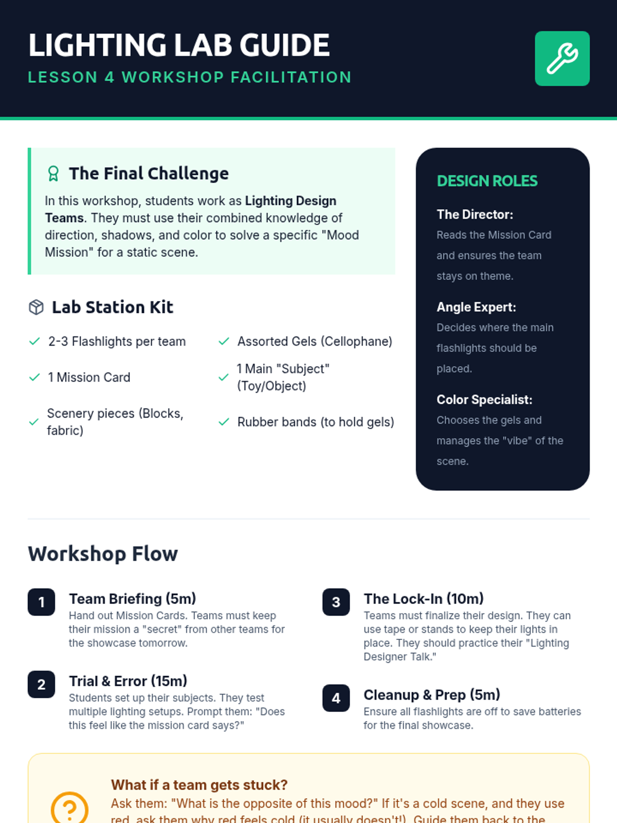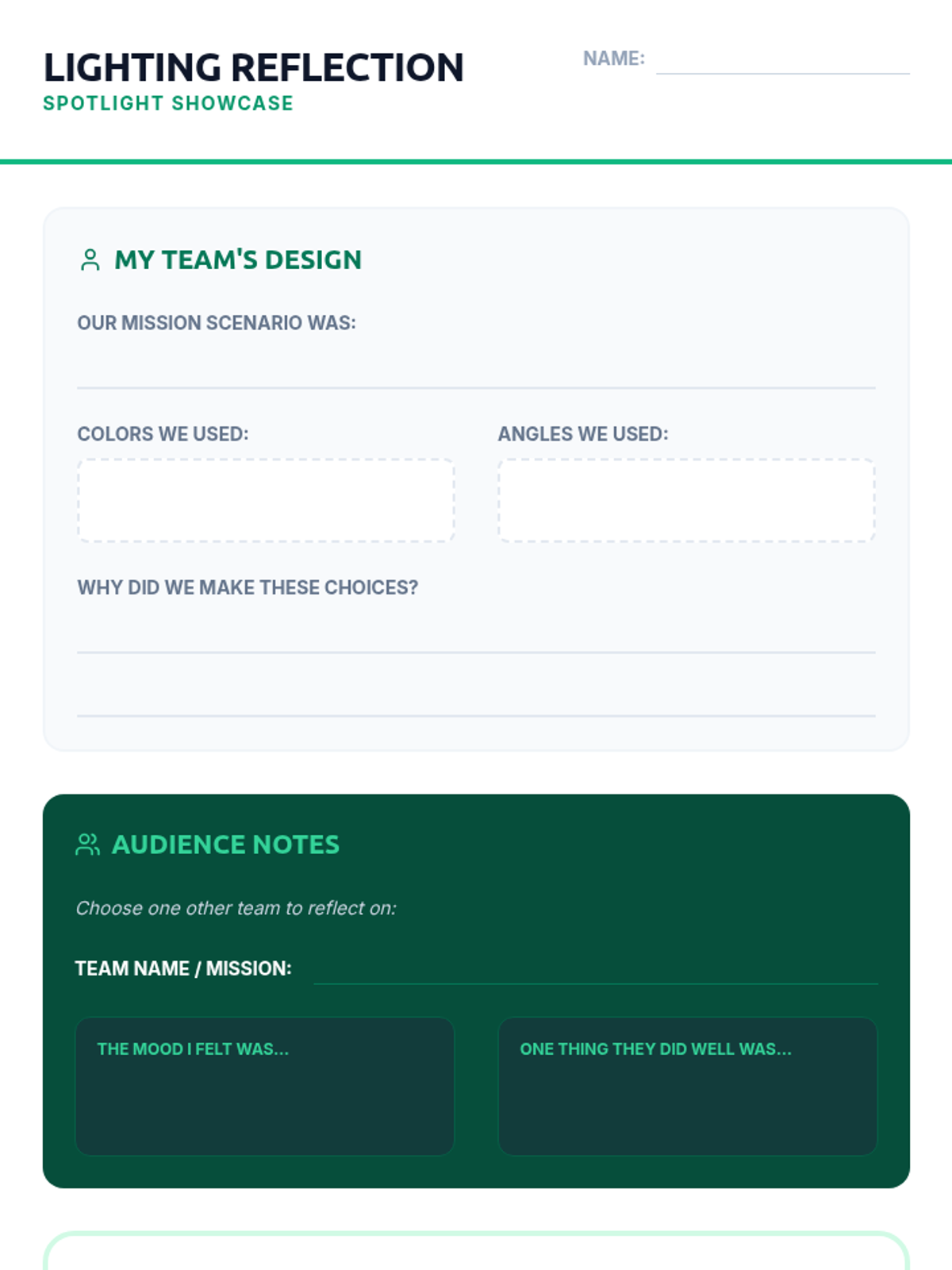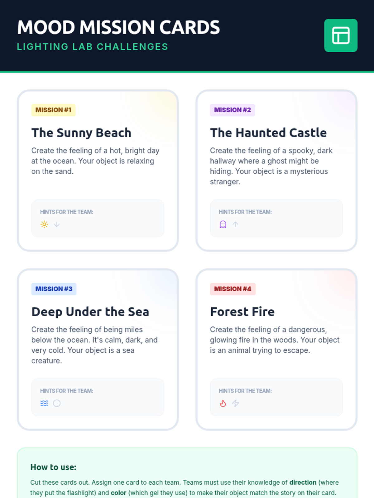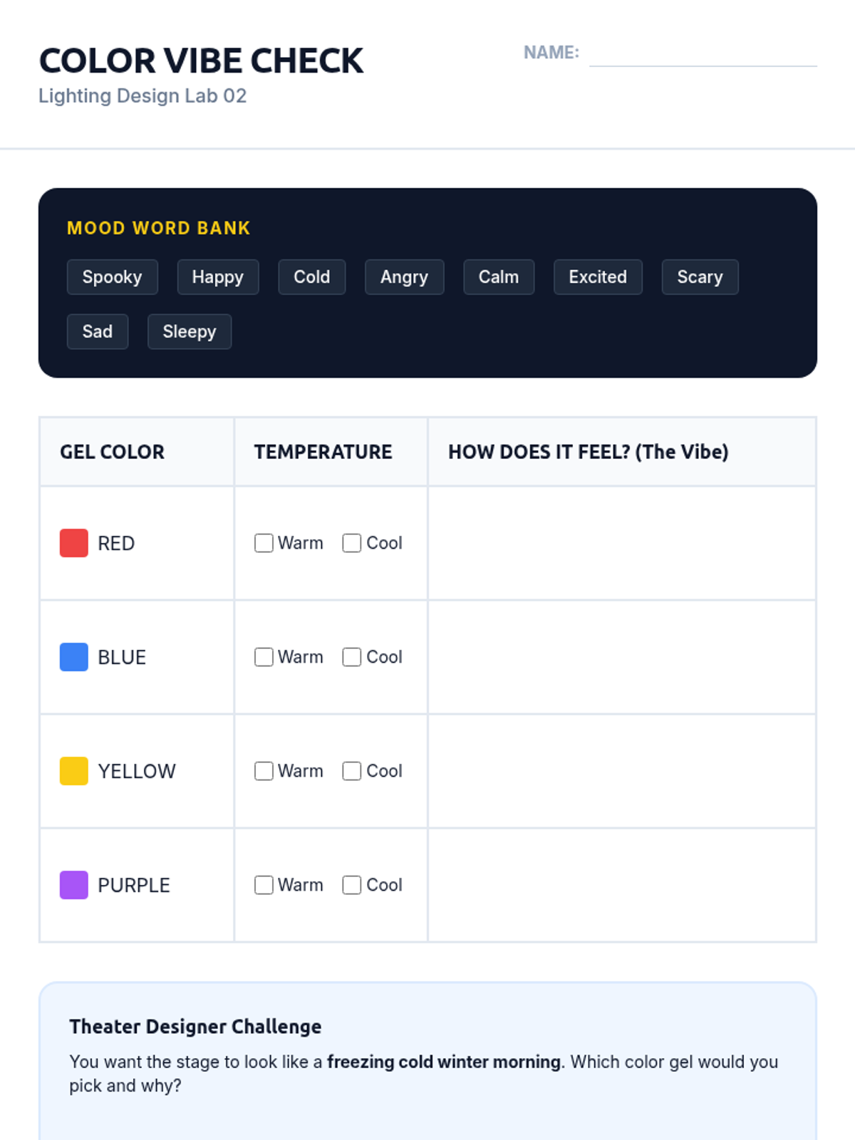 Students explore the basics of stage lighting, including direction, shadow, and color, to understand how lighting design creates mood and tells stories in theater.