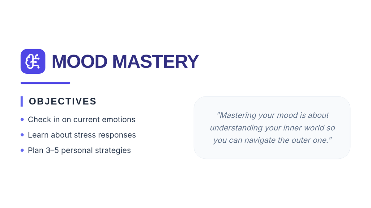 A high-impact 5-lesson sequence designed for credit-deficient high school sophomores to reclaim their academic path. The curriculum reframes impulse control as a strategic 'power move' for achieving independence, career success, and graduation through cognitive discipline and environmental awareness.