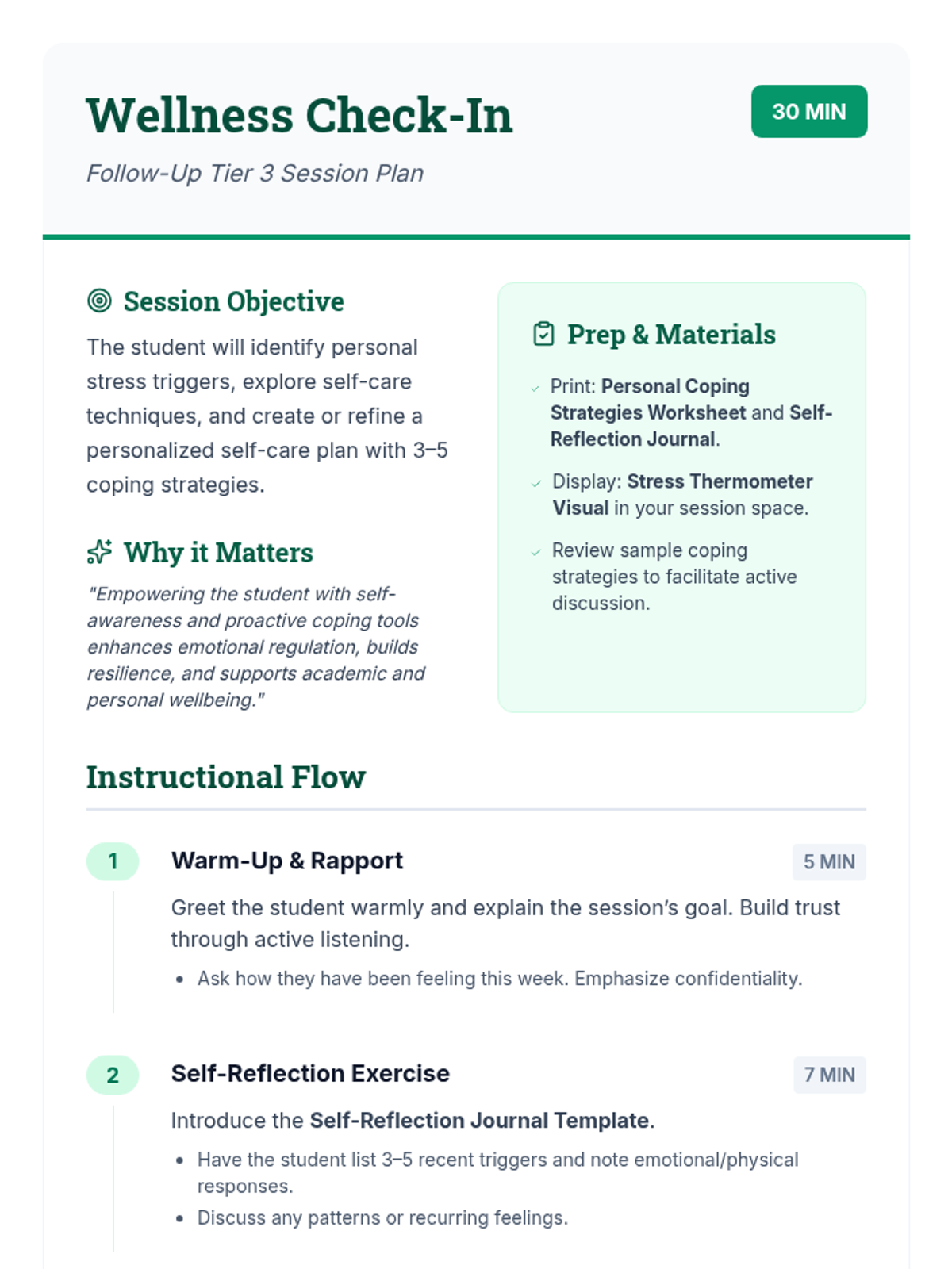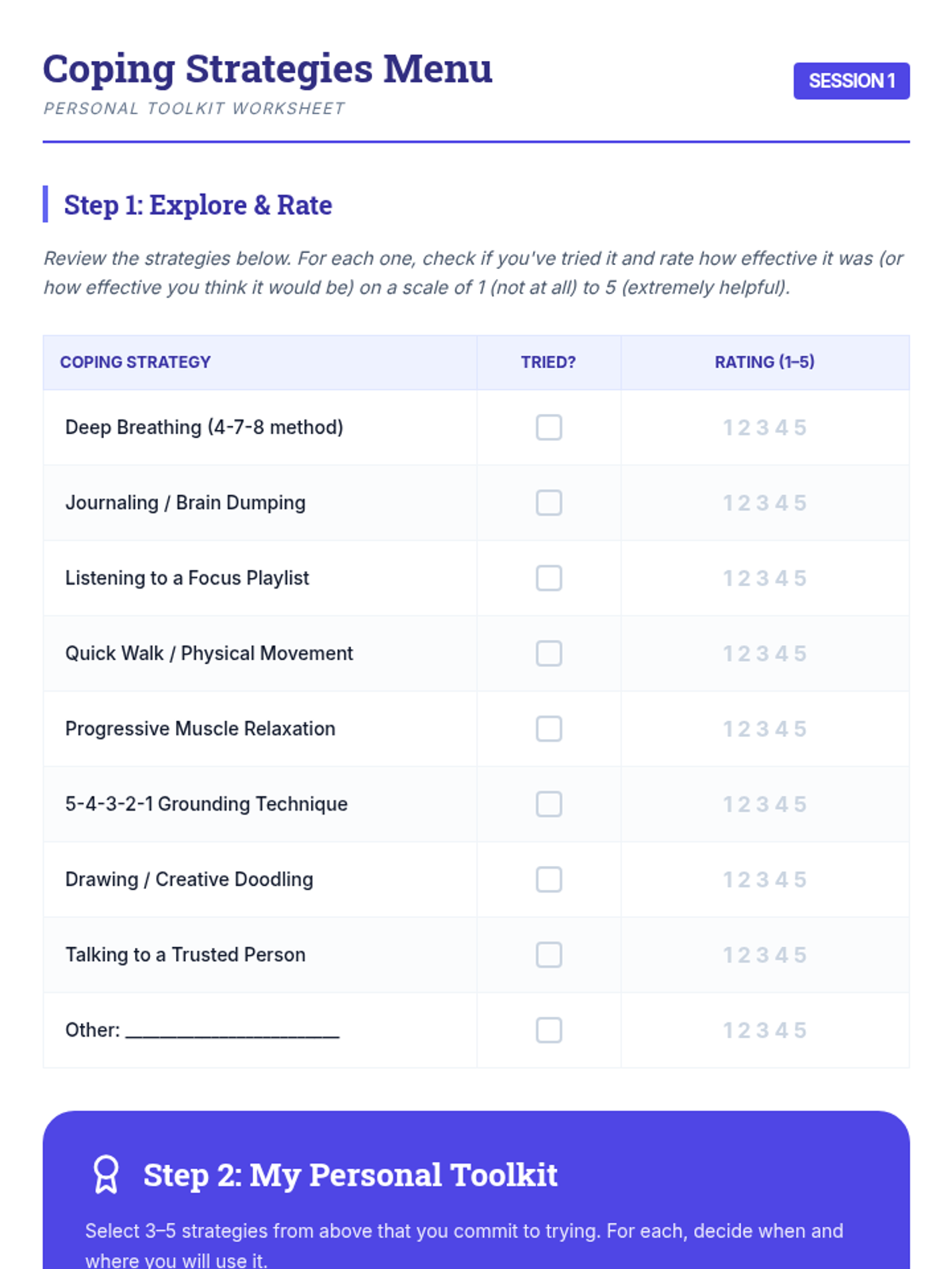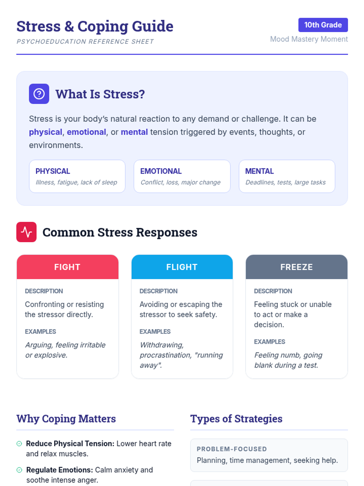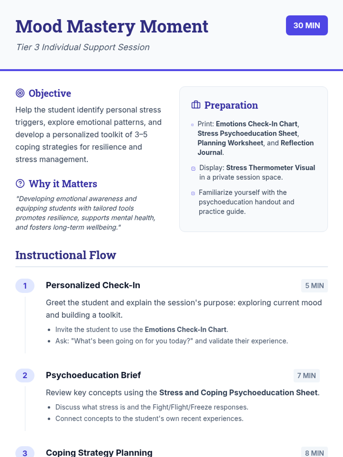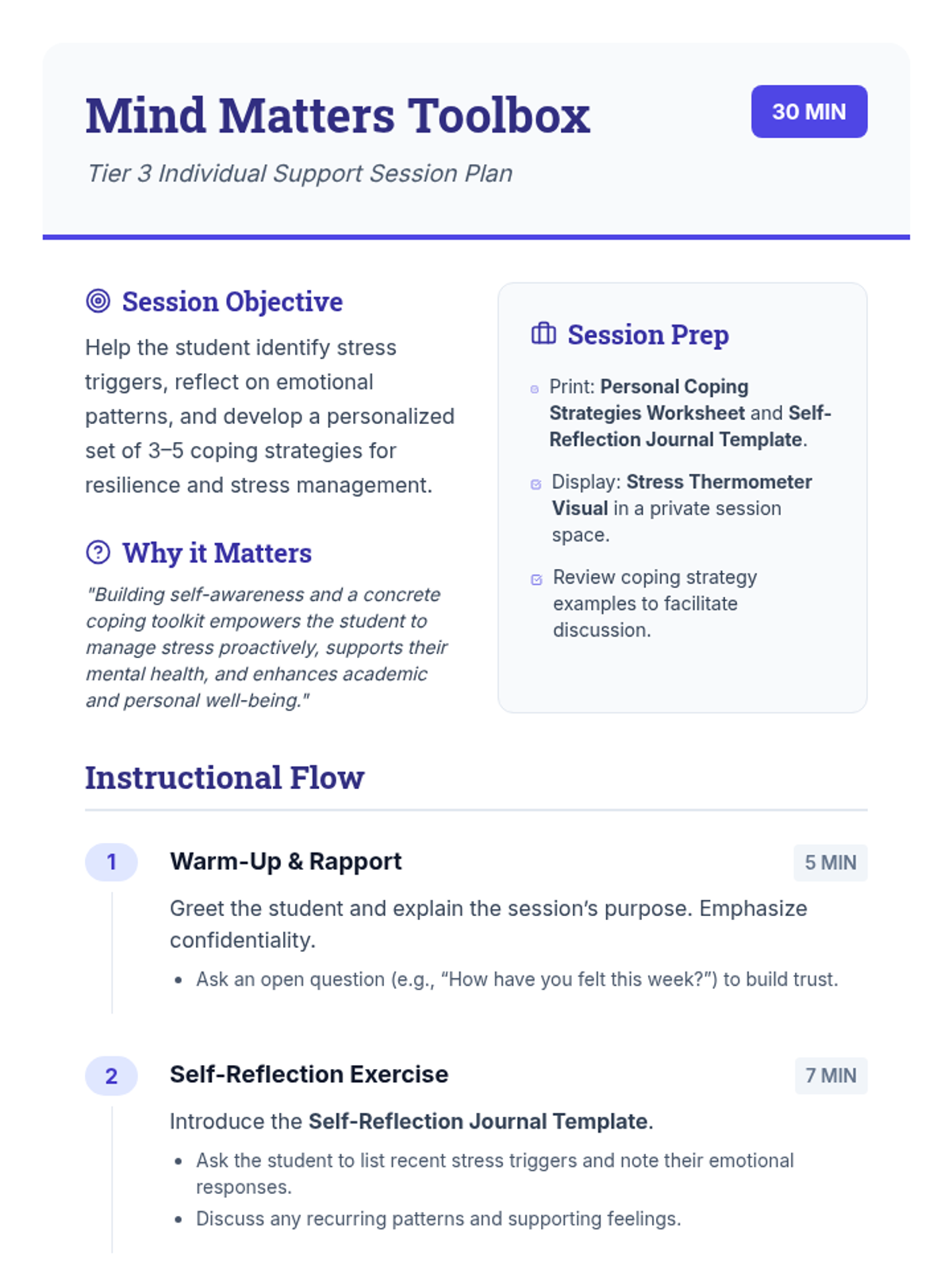 A Tier 3 individual support sequence designed for 10th-grade students to build emotional resilience, identify stress triggers, and develop a customized toolkit of healthy coping strategies through guided reflection and practice.