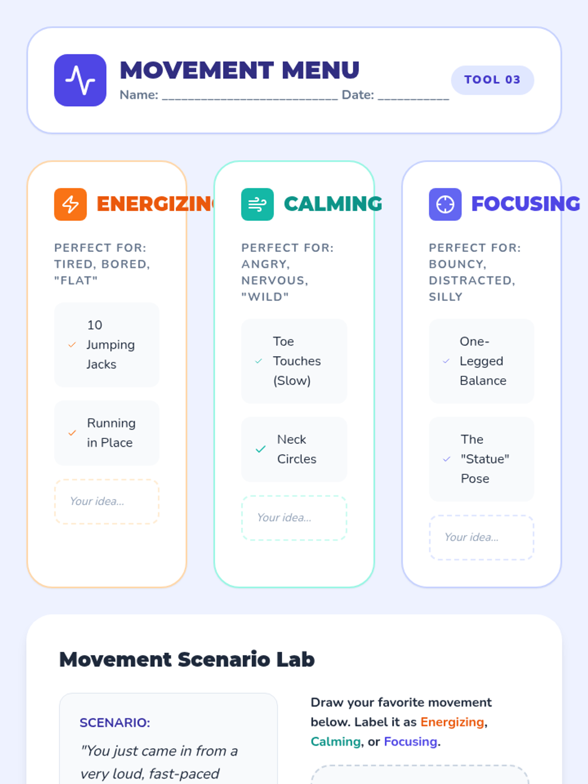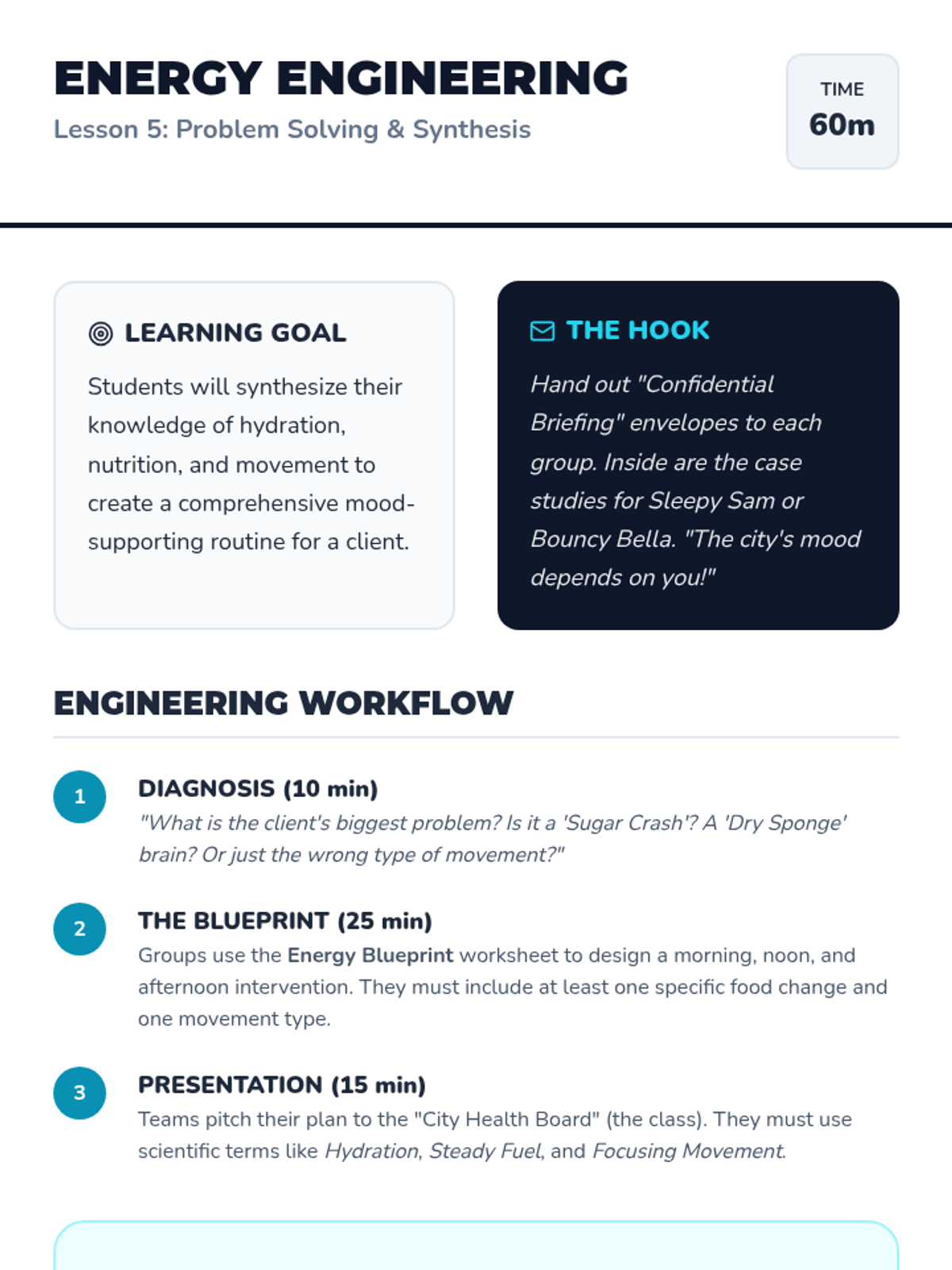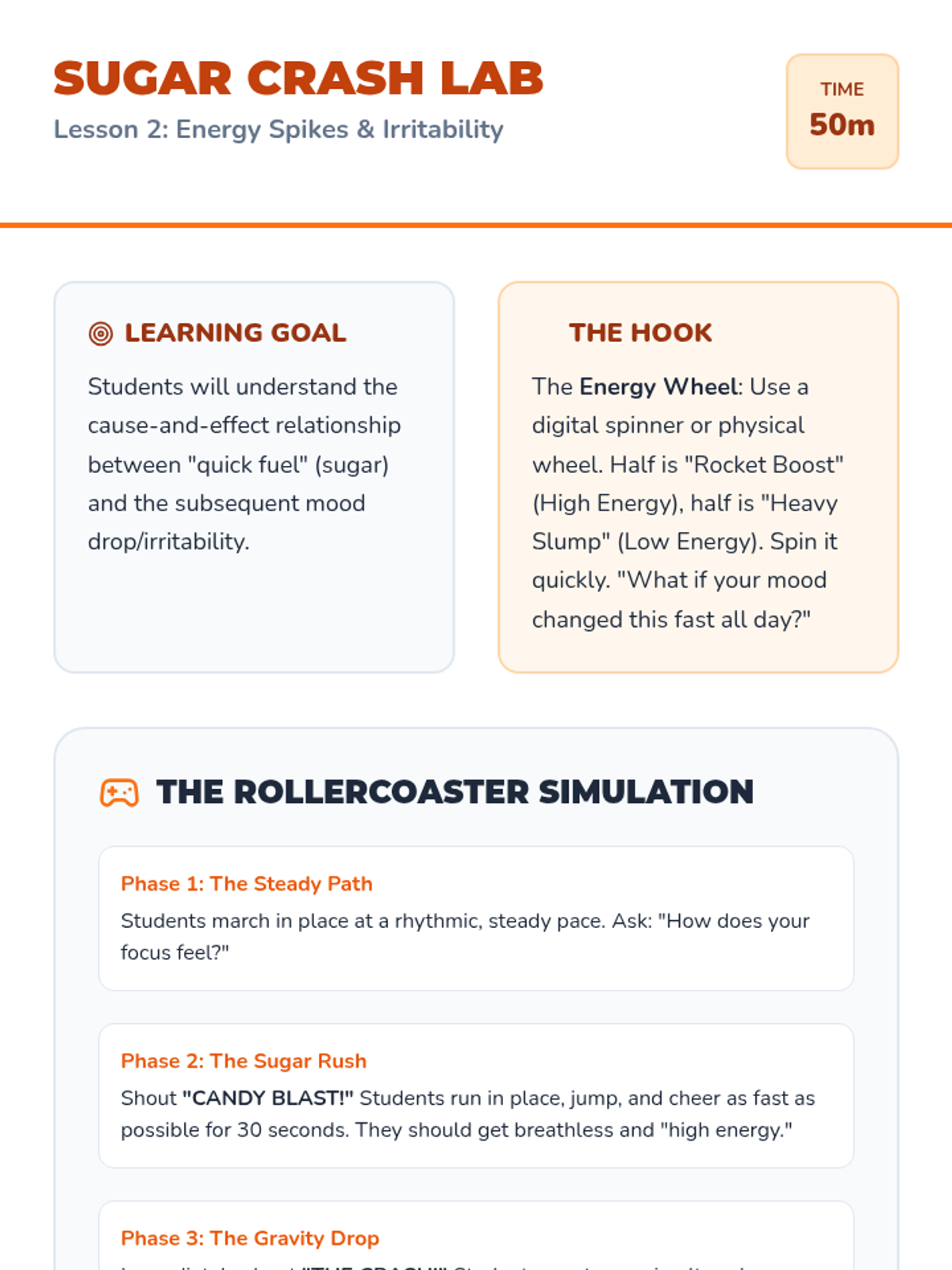 A game-based sequence exploring how hydration, nutrition, and movement impact emotional regulation and focus for 4th graders. Students learn to 'fuel their feelings' through simulations and active gameplay.