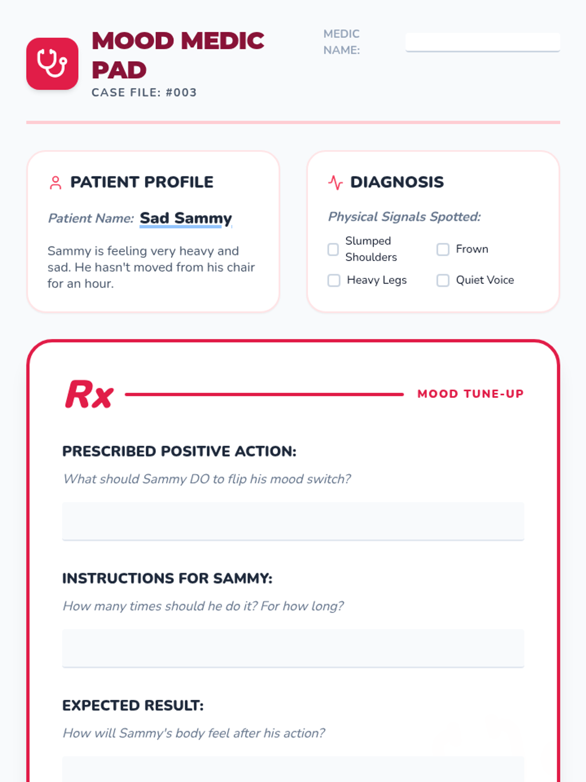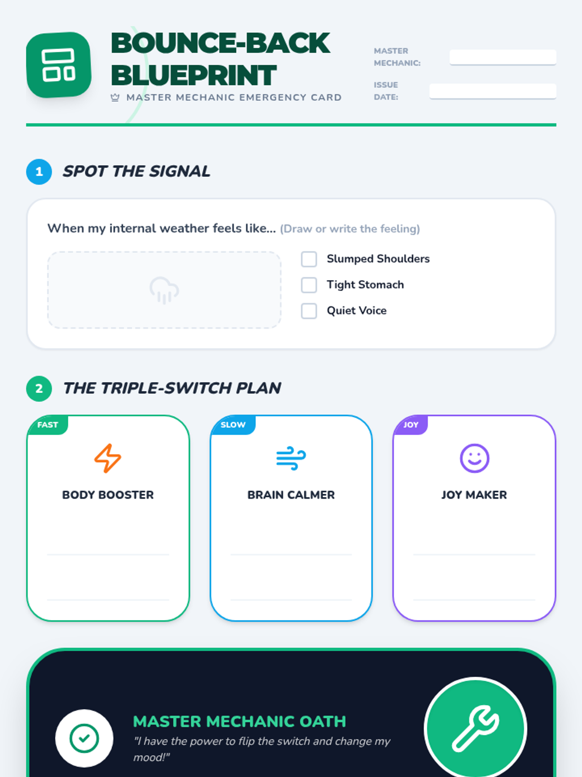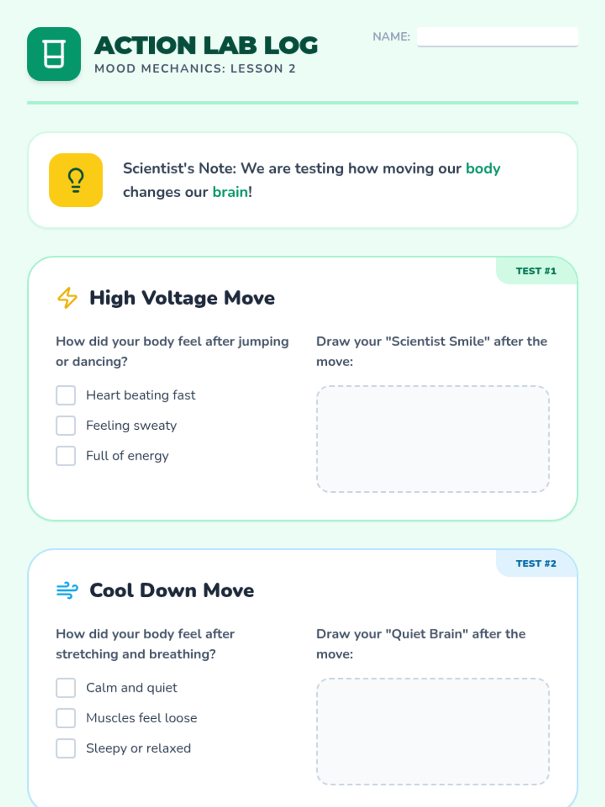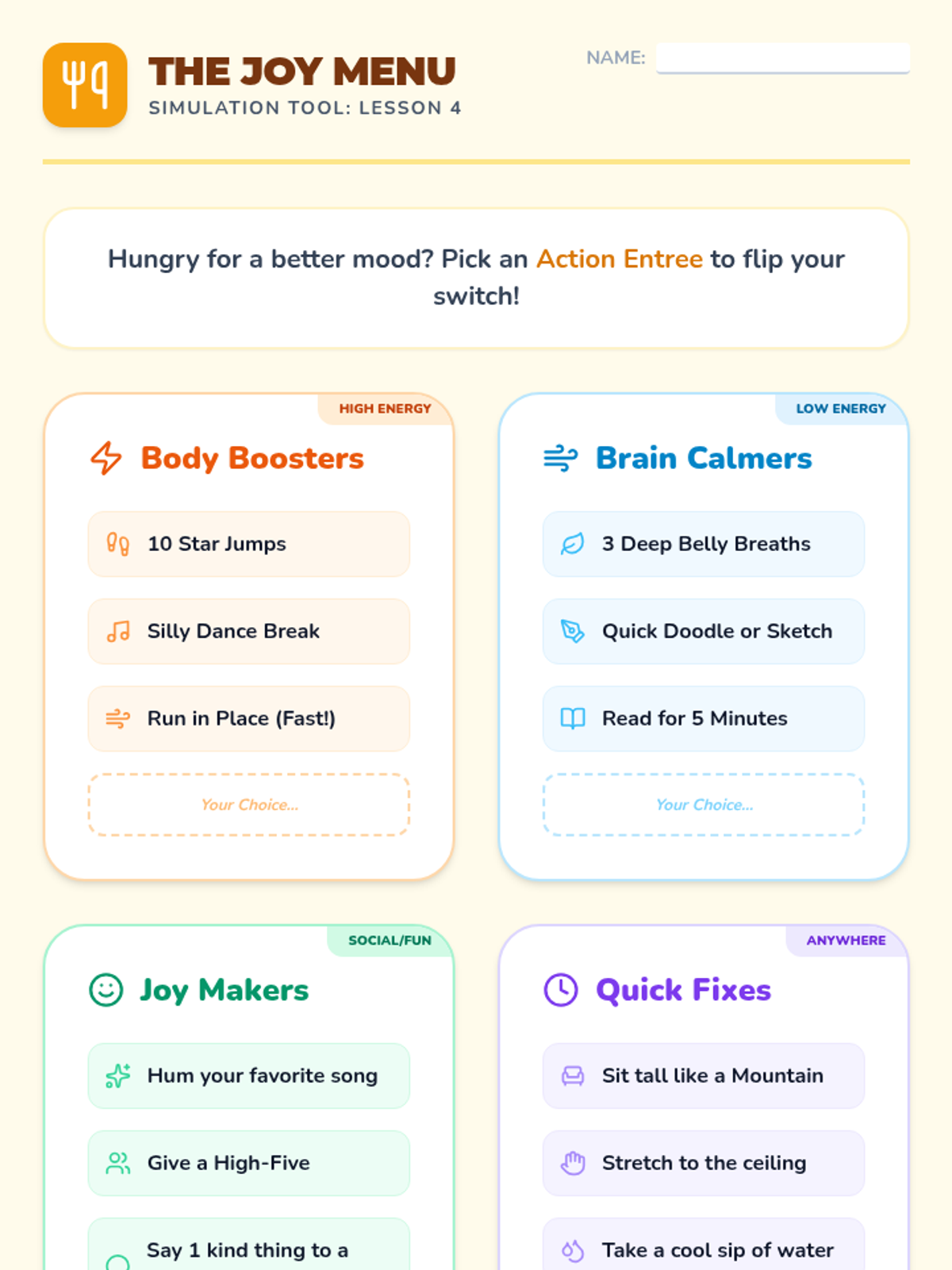 A sequence for 2nd graders to learn how behavioral activation—choosing positive actions—can help regulate emotions like sadness and anxiety. Students learn to recognize physical emotional cues and develop a personal 'Bounce-Back Plan' to shift their mood.