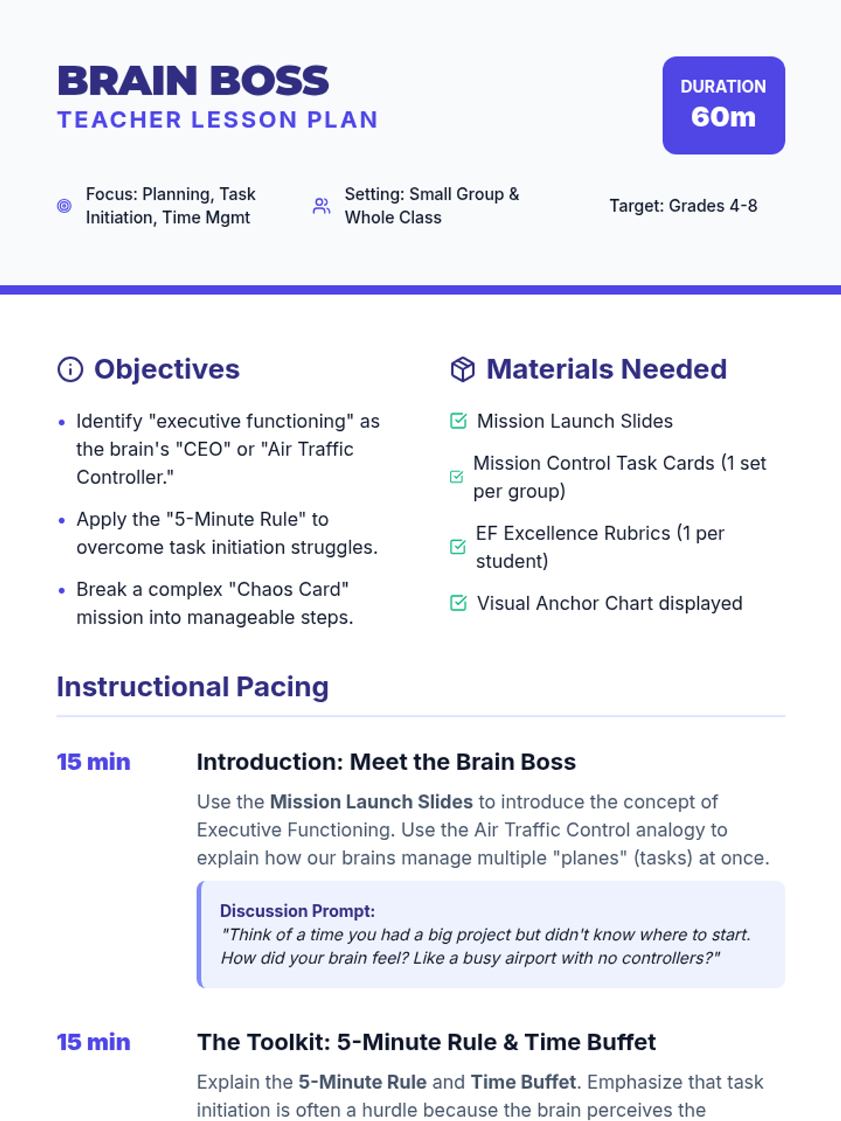 A lesson sequence focused on helping grade 6 students with autism identify their emotions through physical sensations and build a personalized toolbox of coping strategies. The theme uses a 'Mood Mechanics' workshop metaphor to make abstract emotional concepts more concrete and manageable.