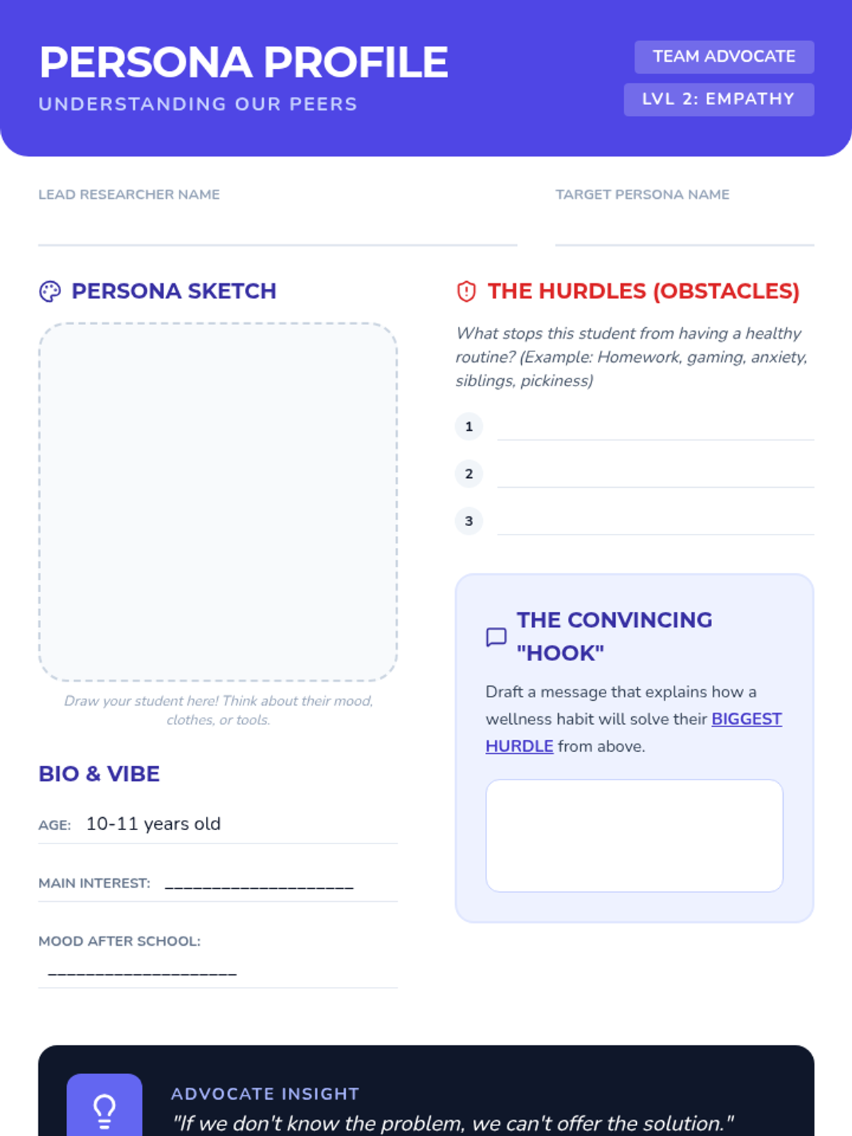 A project-based sequence where 5th-grade students become wellness advocates, researching and designing resource guides to inspire their peers to adopt mood-supporting habits like sleep, nutrition, and stress management.