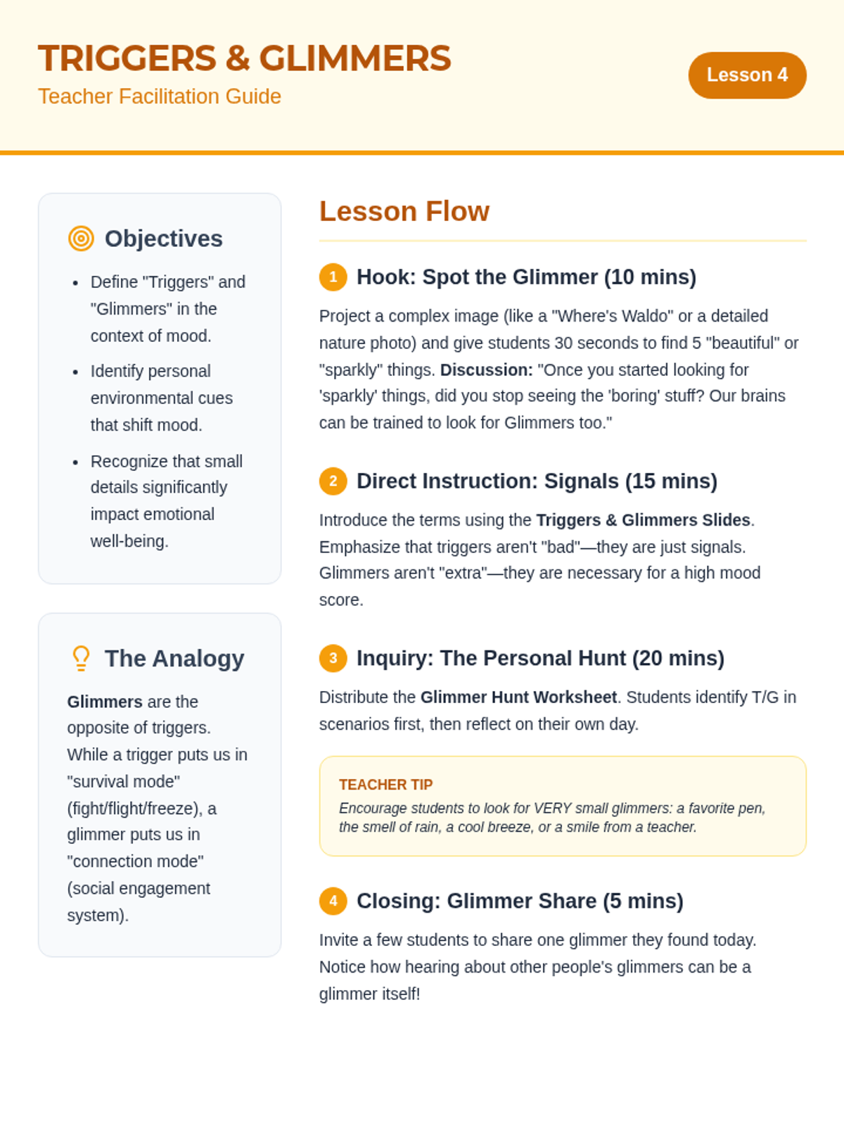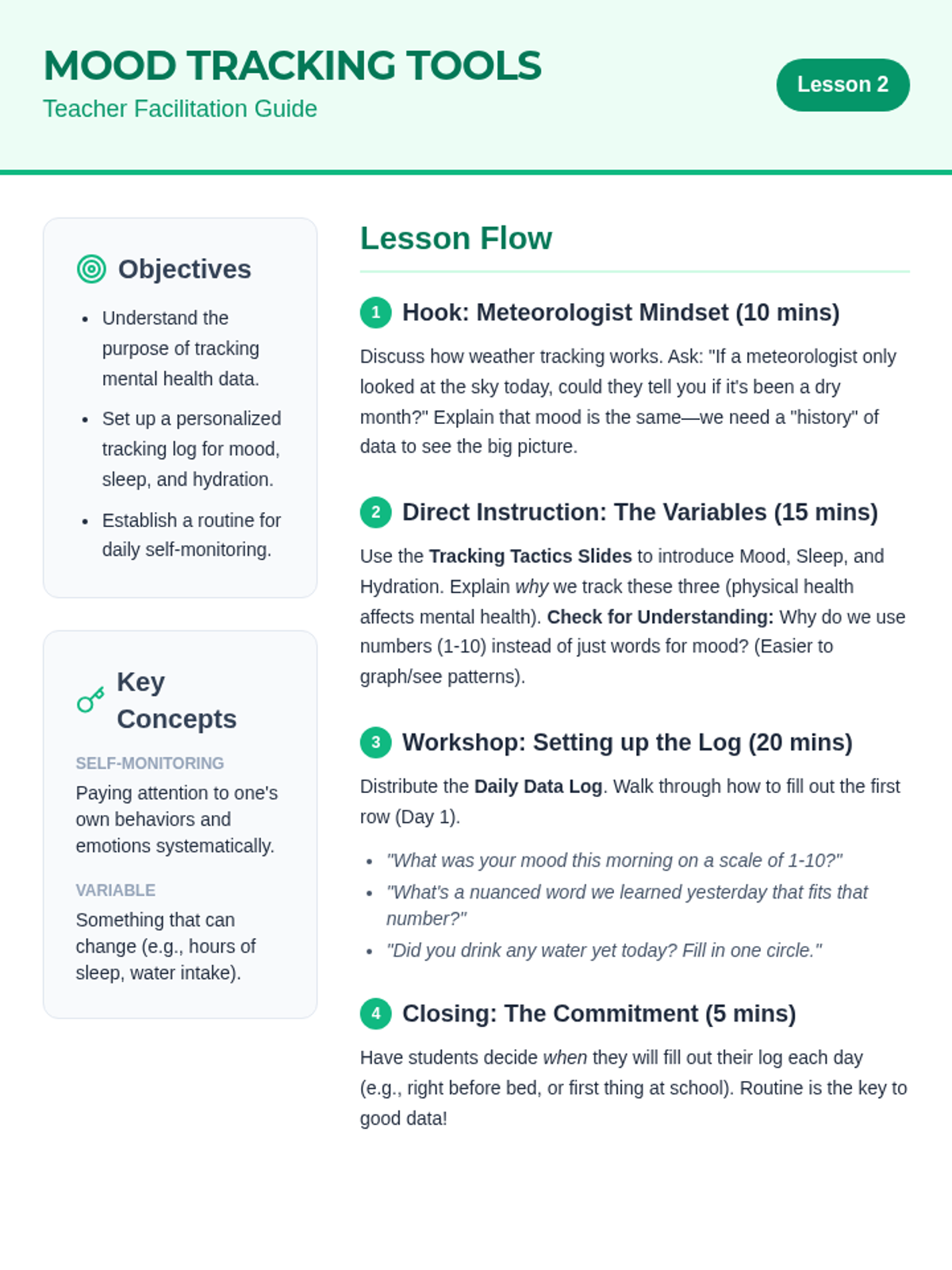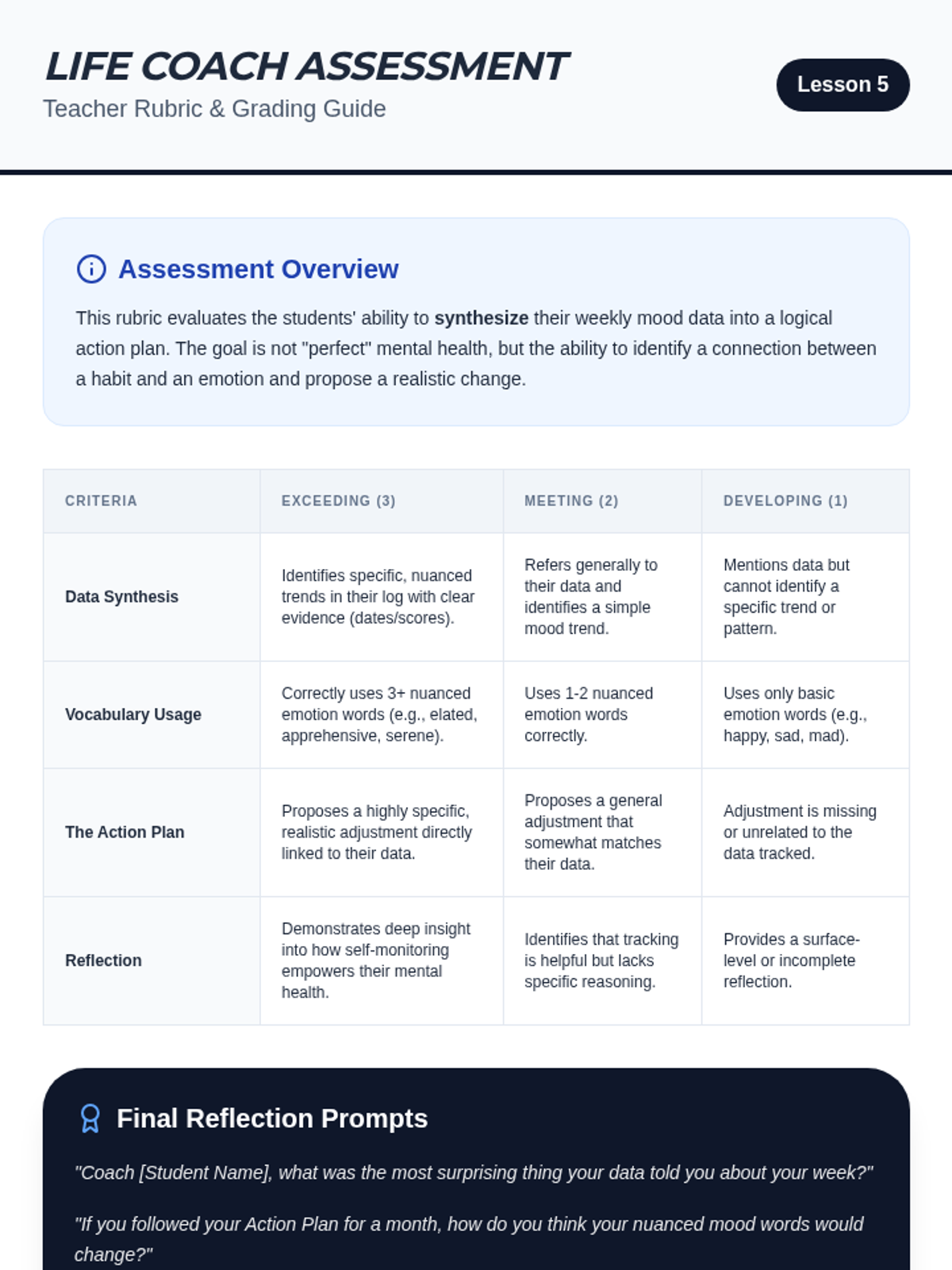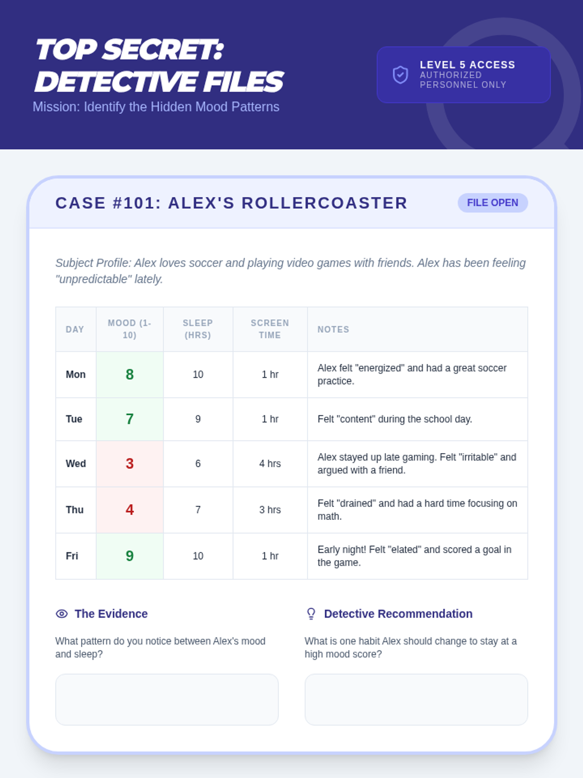 A 5th-grade sequence focused on teaching students how to monitor their emotional well-being using data and vocabulary. Students move from identifying nuanced emotions to tracking their moods and habits, ultimately learning to identify patterns and make healthy lifestyle adjustments.
